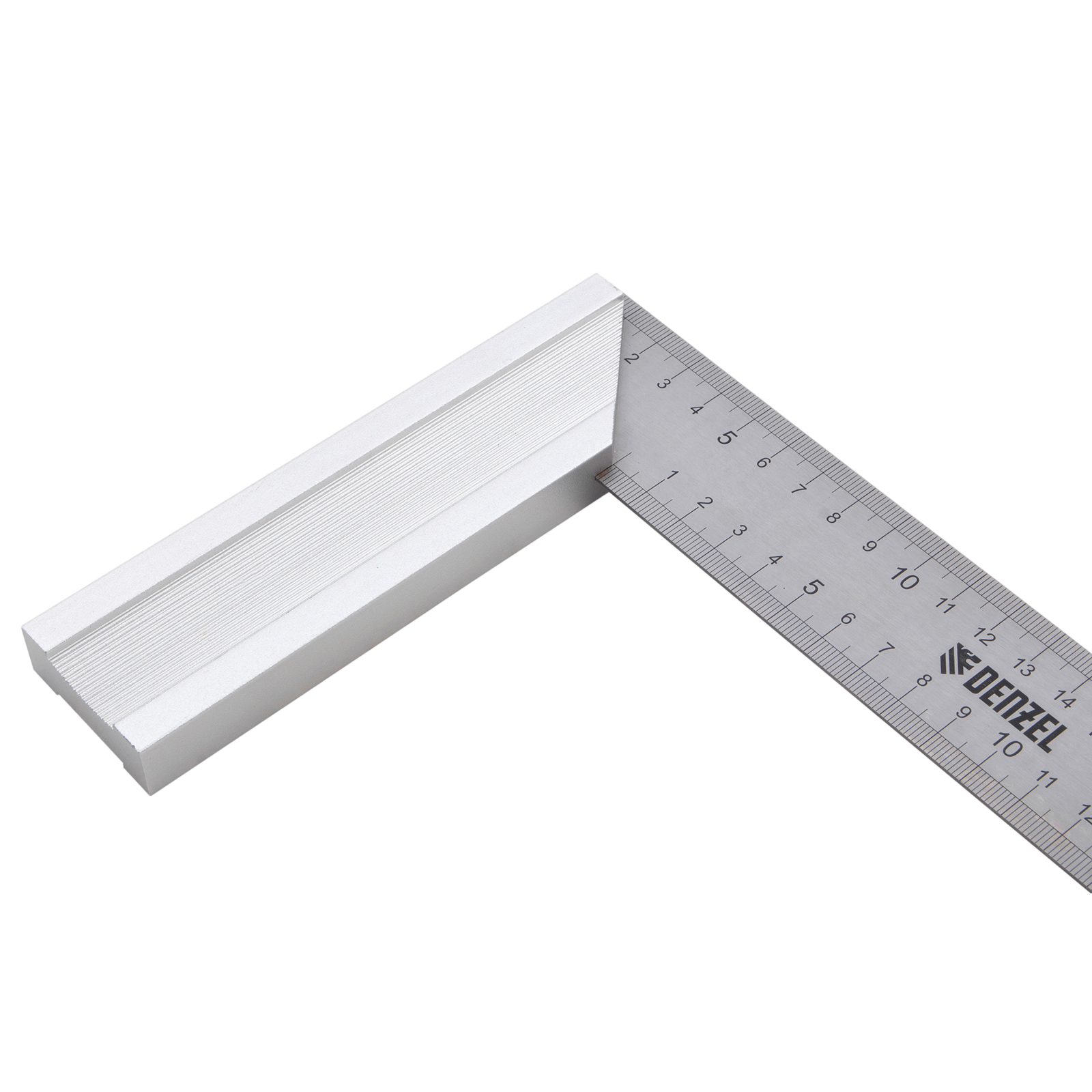 Стальной угольник Denzel 32396 длиной 250 мм, с градуировкой, алюминиевым основанием и полотном из нержавеющей стали, используется для построения и контроля углов. Будет полезен для выполнения столярных и строительных работ.