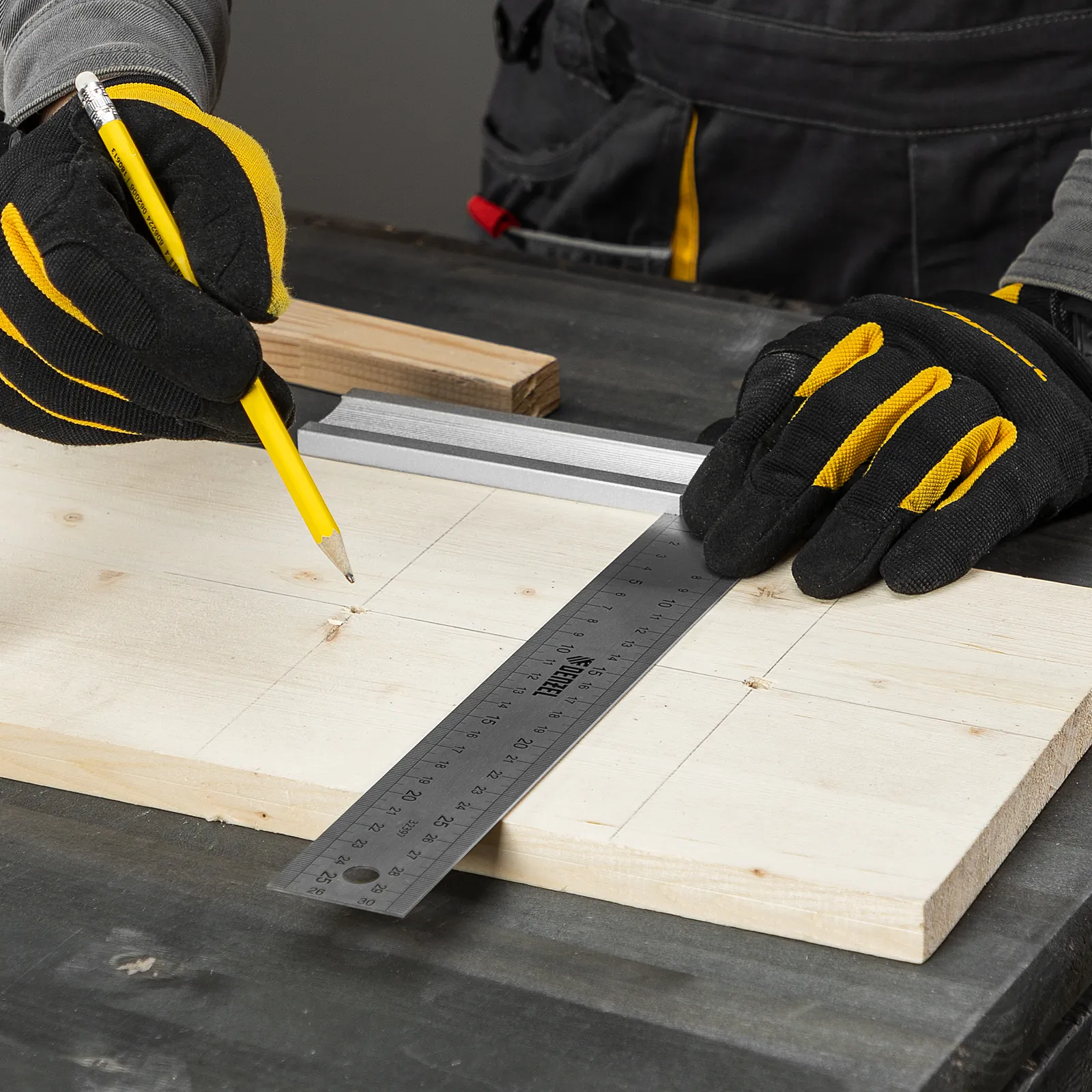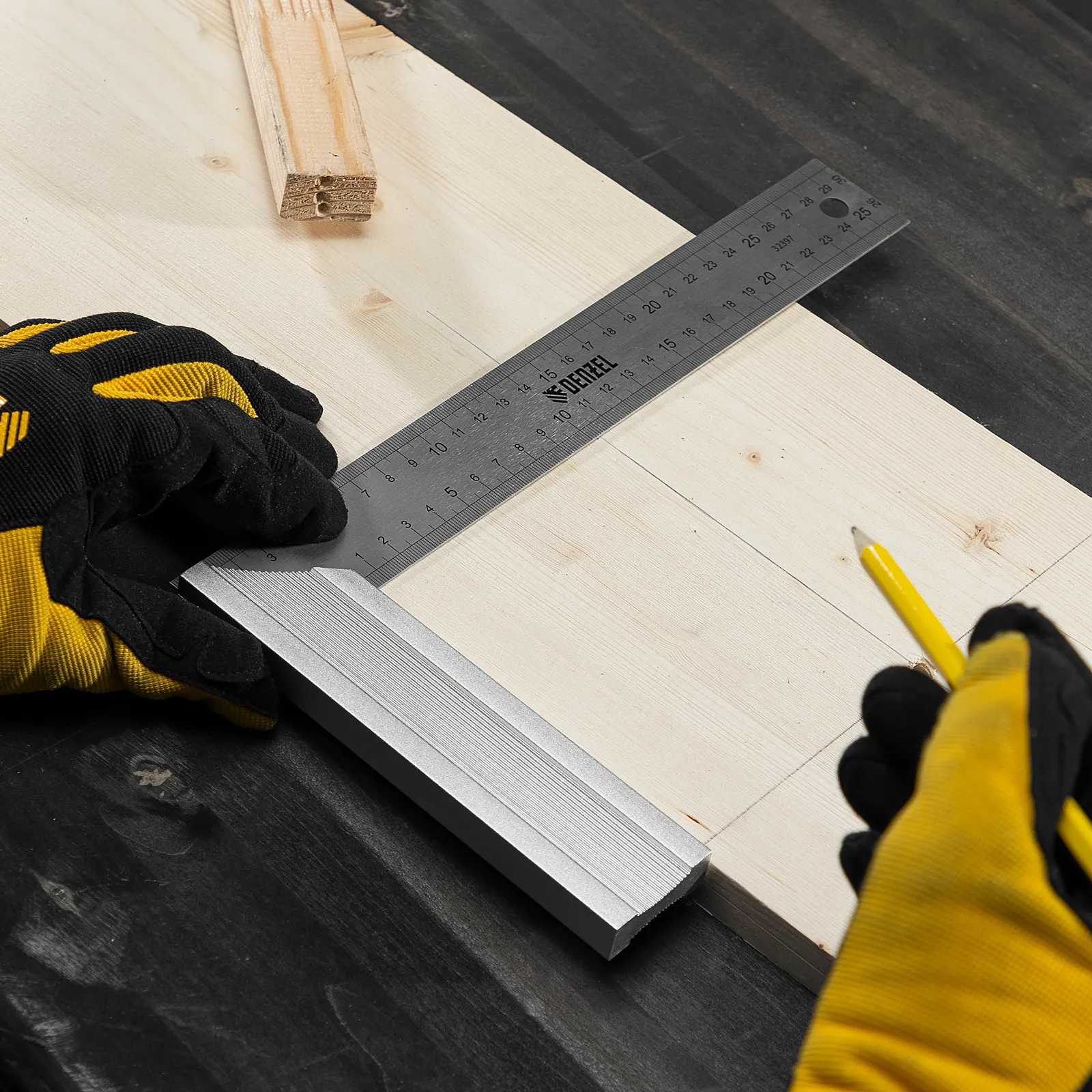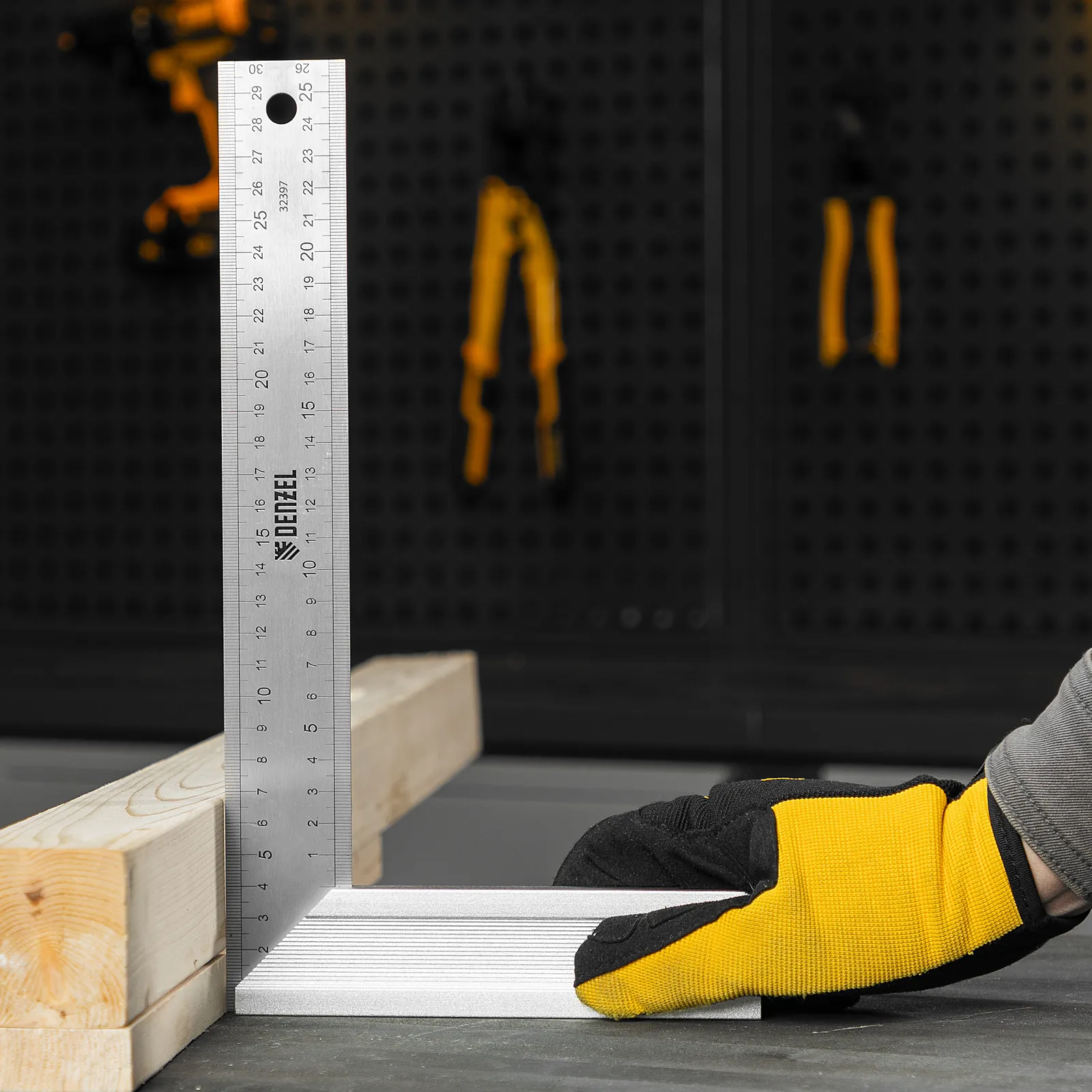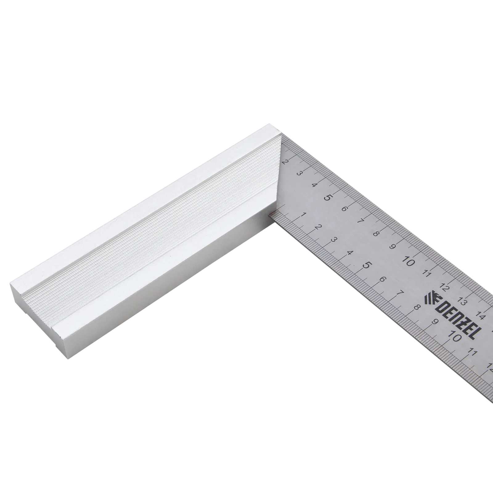 Стальной угольник Denzel 32397 длиной 300 мм, с градуировкой, алюминиевым основанием и полотном из нержавеющей стали, используется для построения и контроля углов. Будет полезен для выполнения столярных и строительных работ.