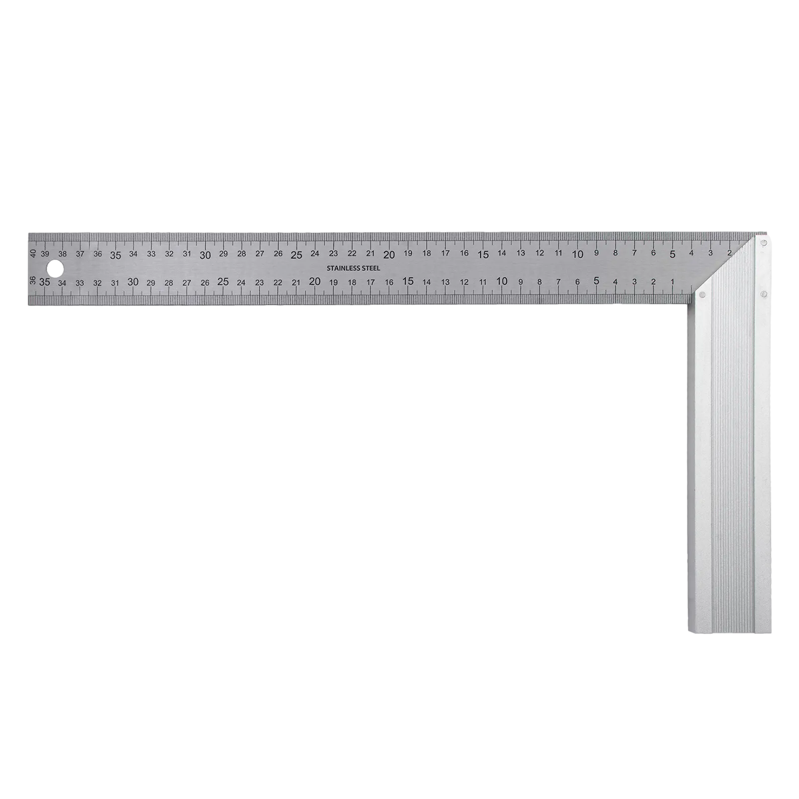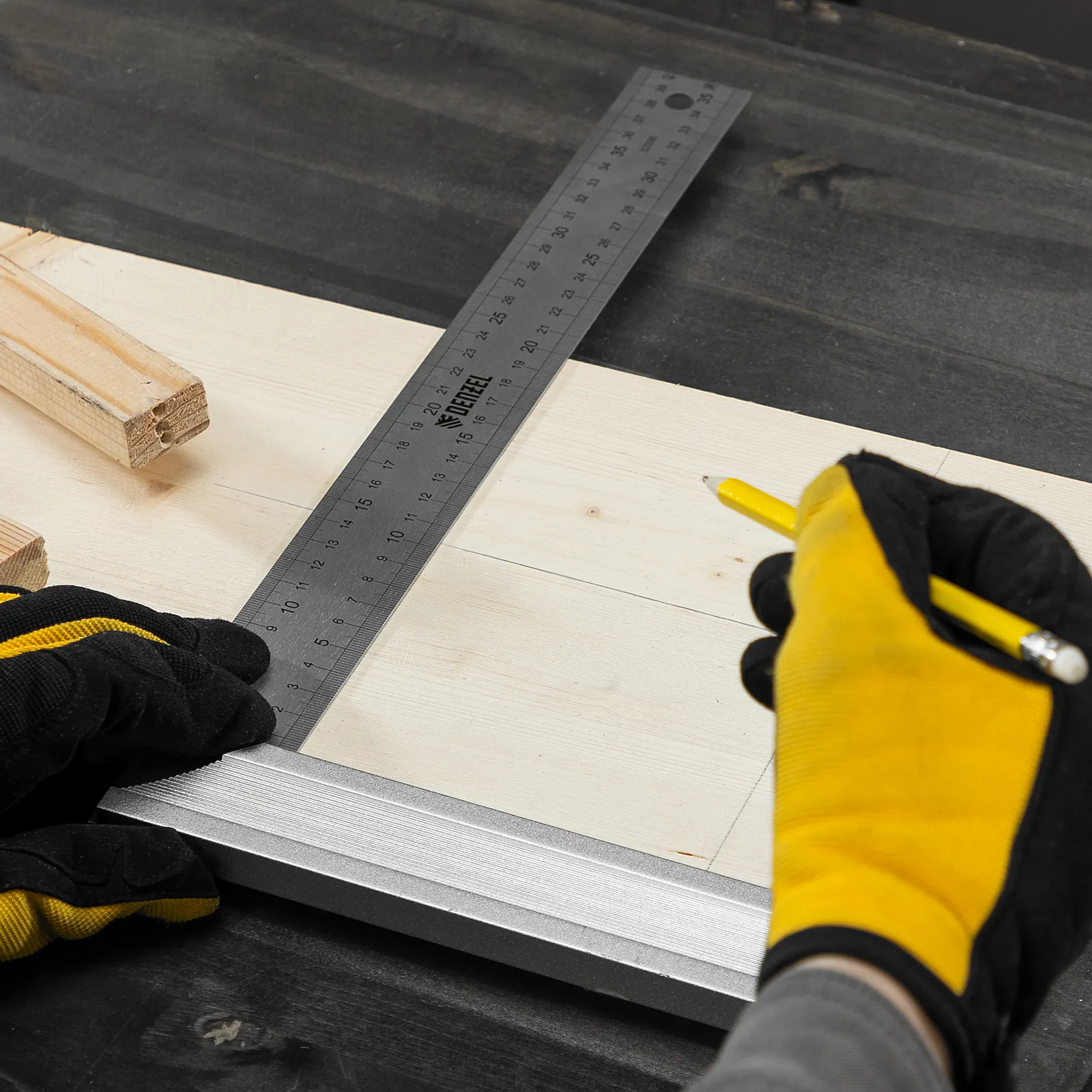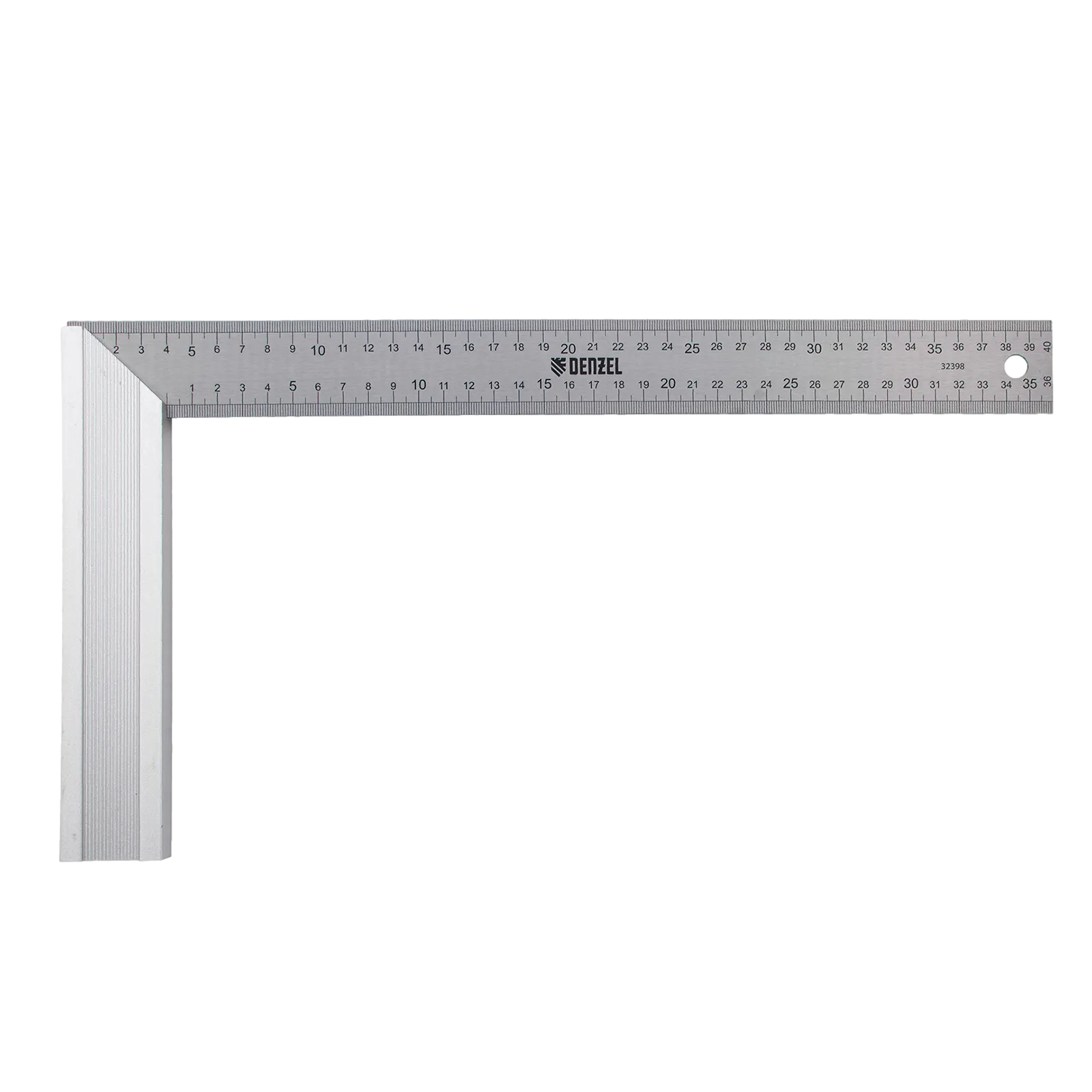 Стальной угольник Denzel 32398 длиной 400 мм, с градуировкой, алюминиевым основанием и полотном из нержавеющей стали, используется для построения и контроля углов. Будет полезен для выполнения столярных и строительных работ.