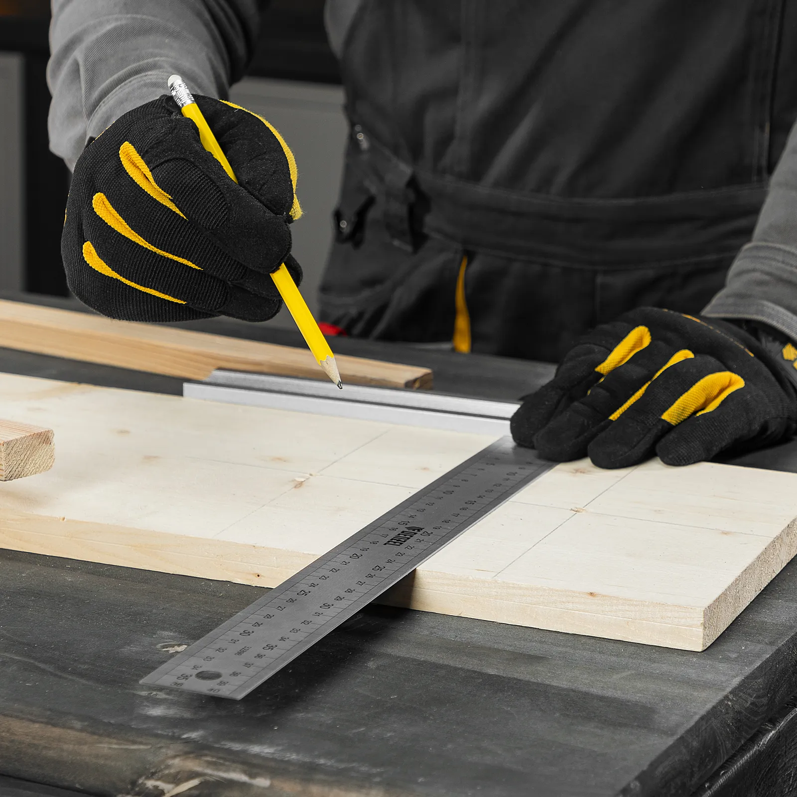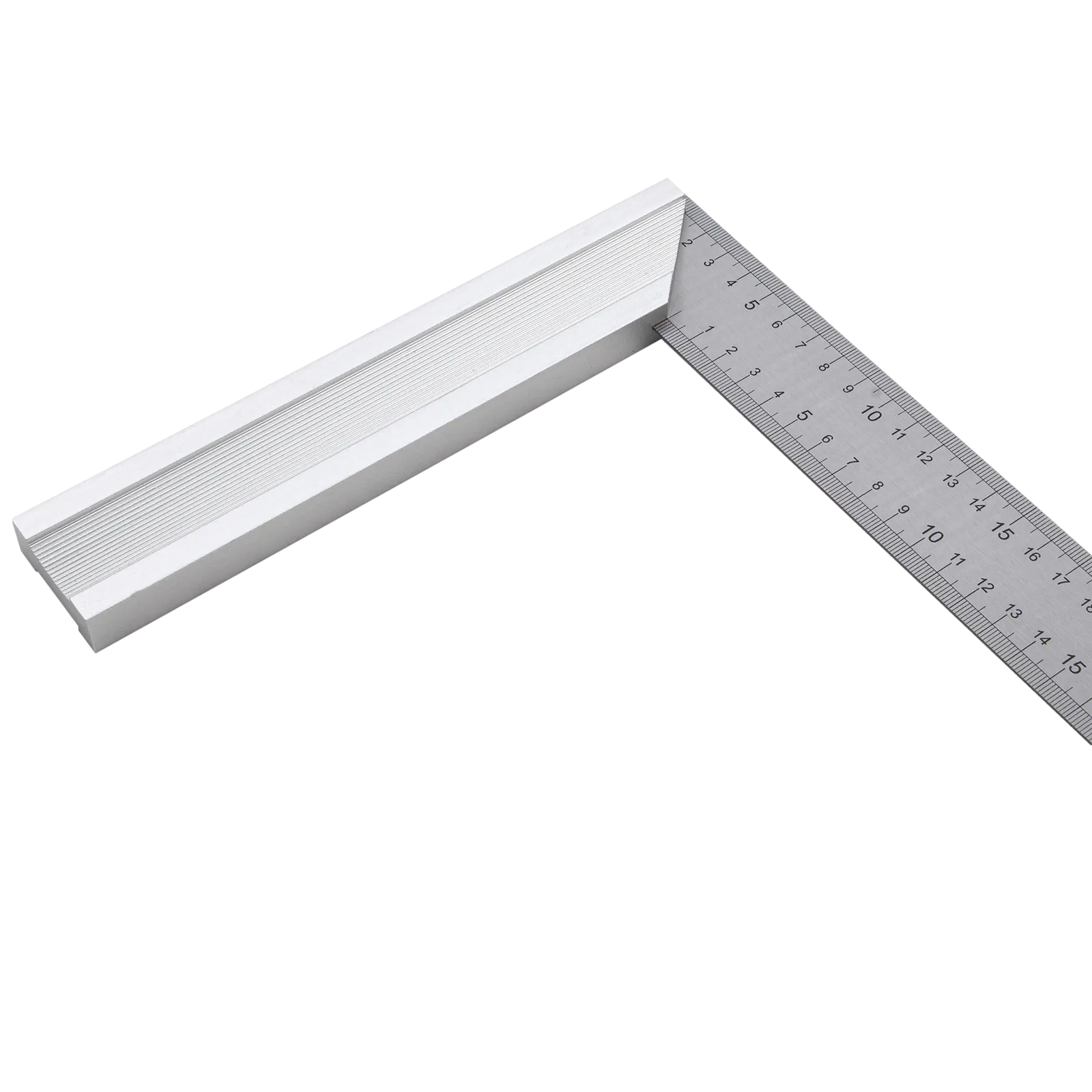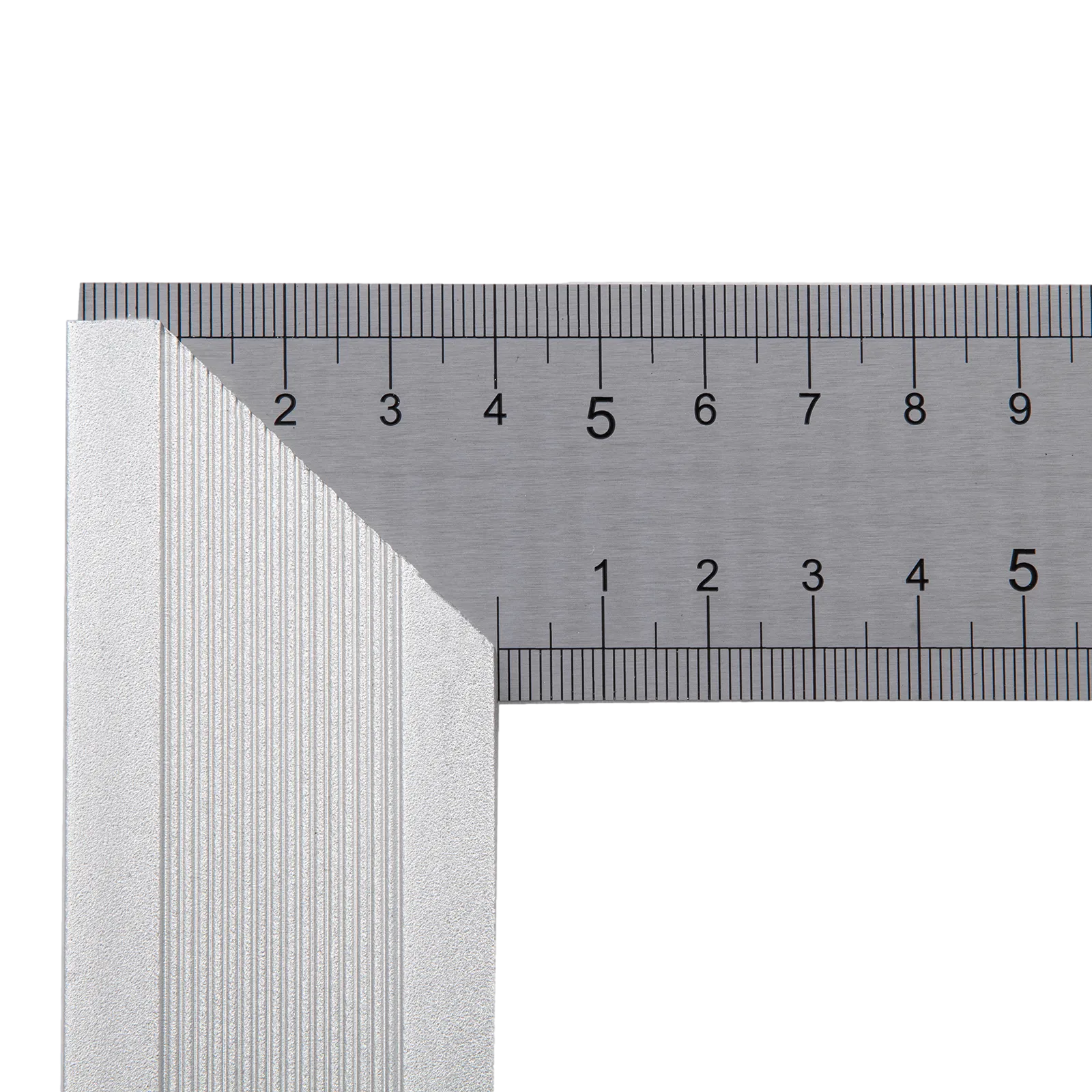 Стальной угольник Denzel 32398 длиной 400 мм, с градуировкой, алюминиевым основанием и полотном из нержавеющей стали, используется для построения и контроля углов. Будет полезен для выполнения столярных и строительных работ.