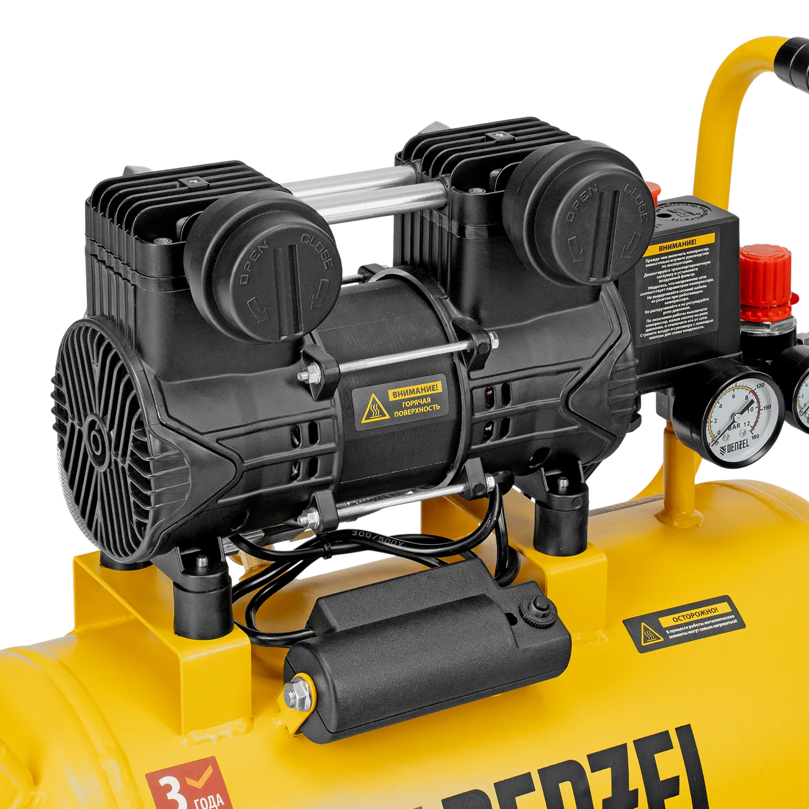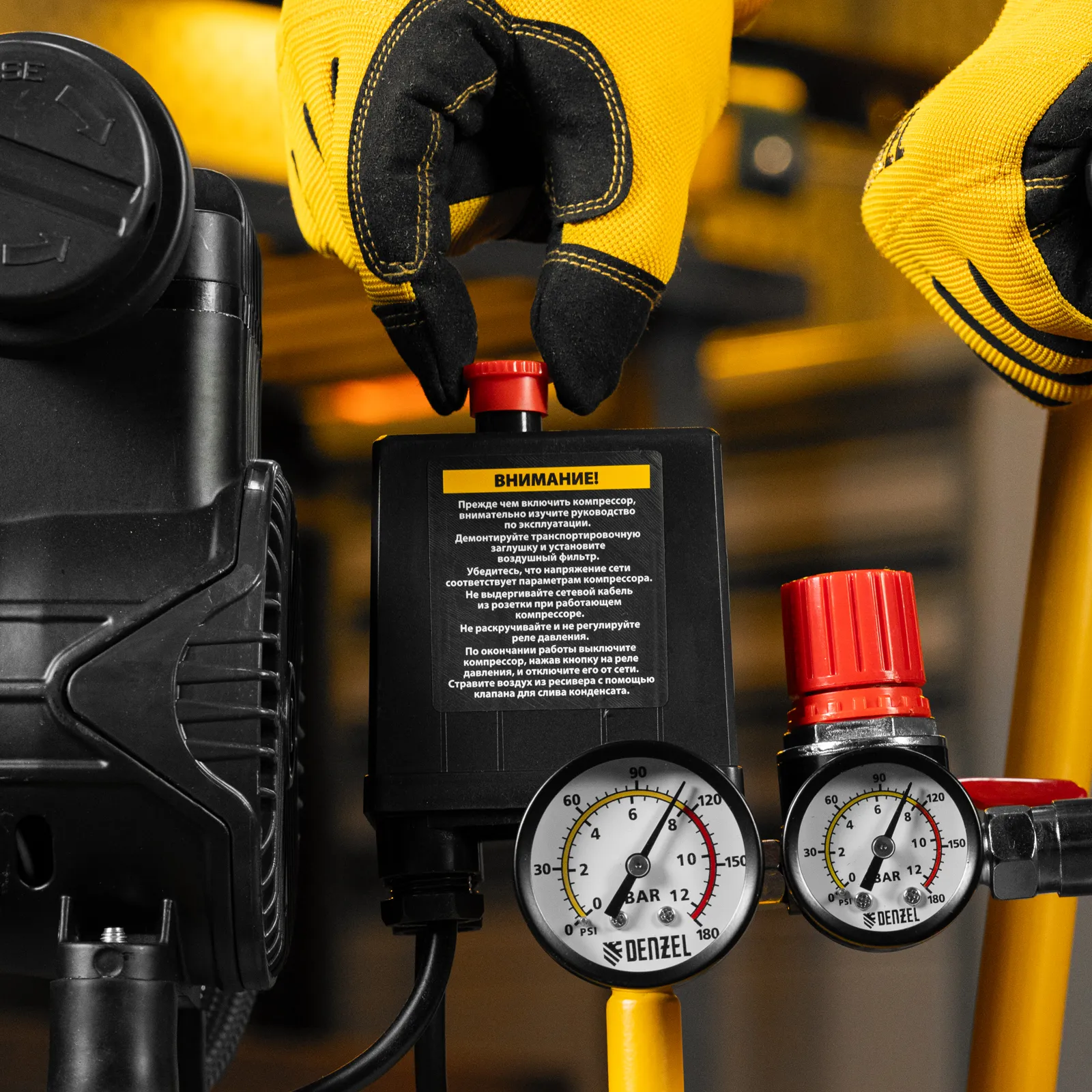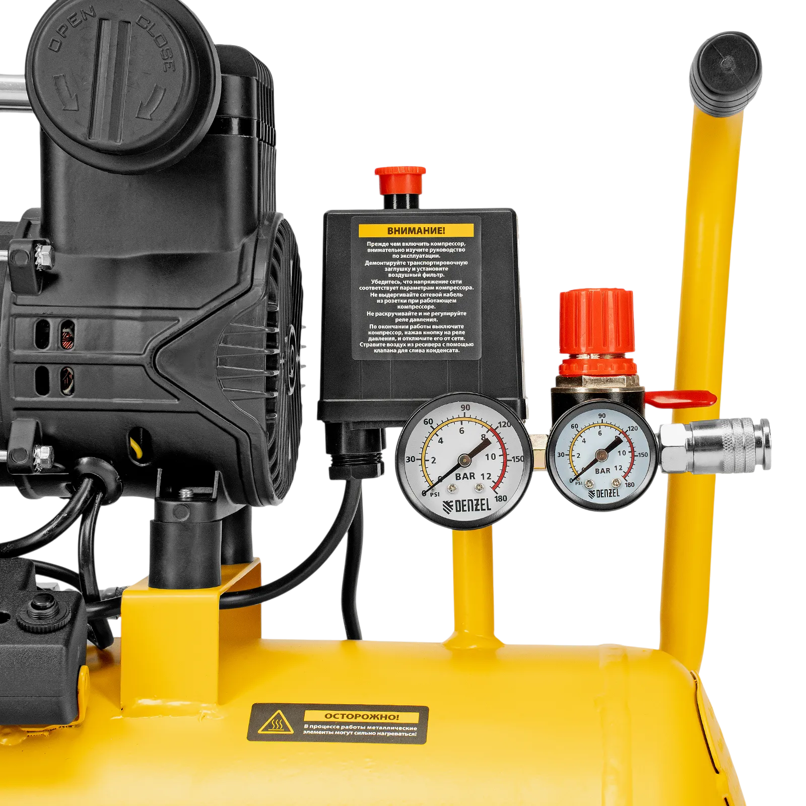 - Удобный контроль работы — компрессор оснащен 2 манометрами для отслеживания давления в ресивере и пневмолинии