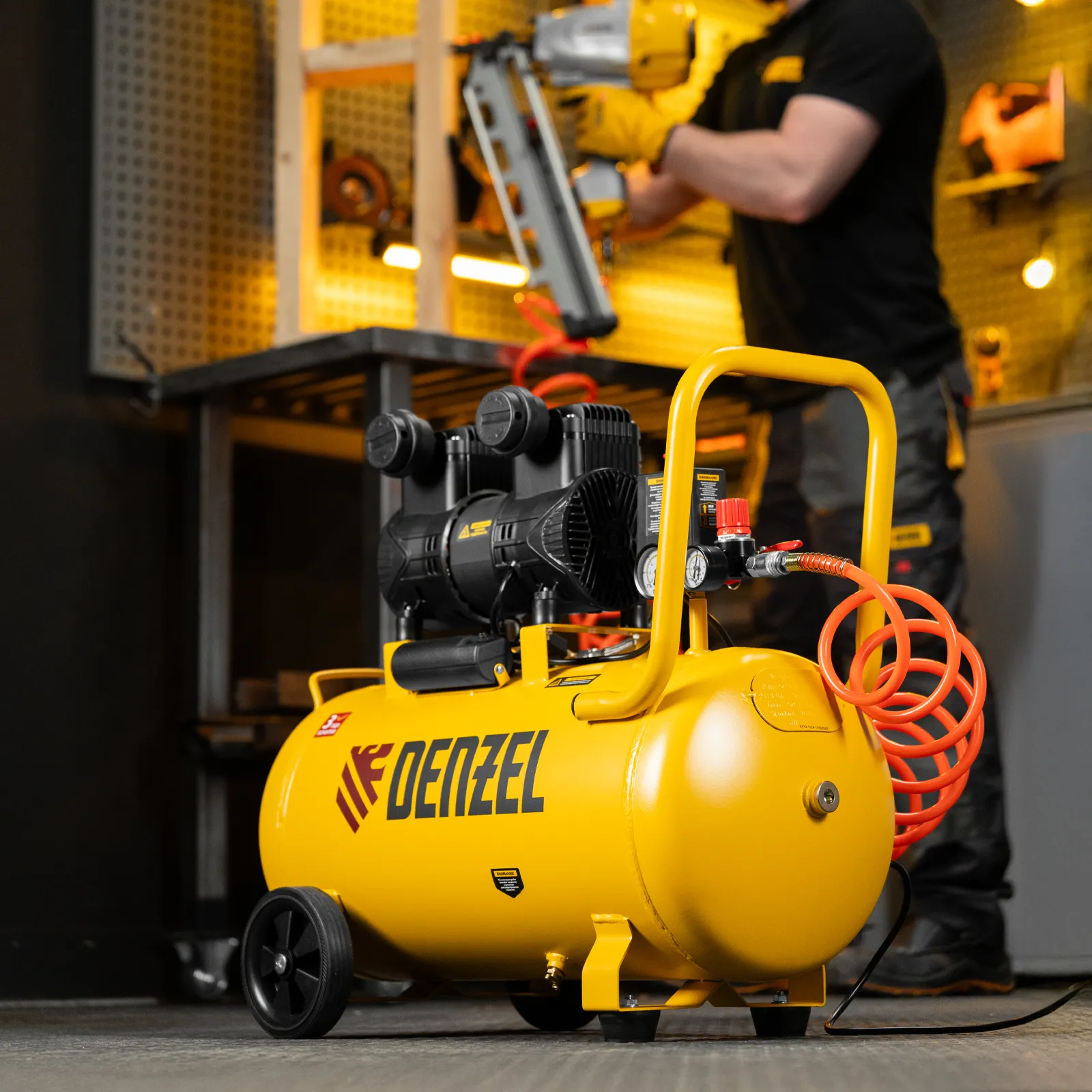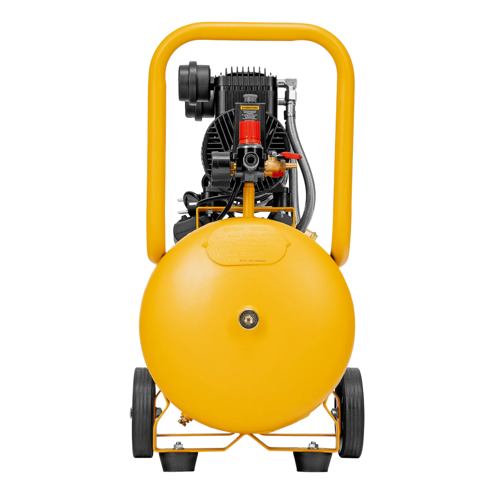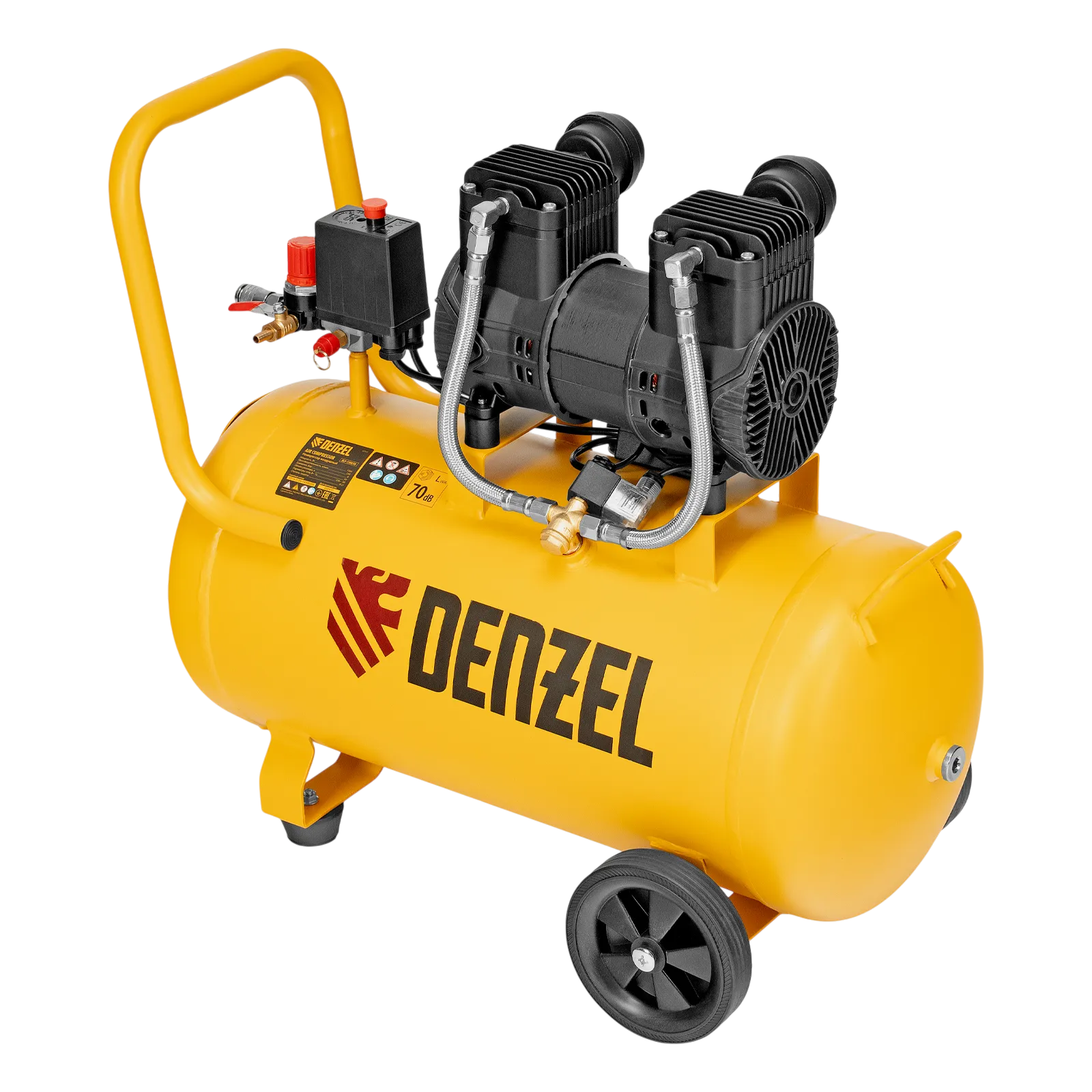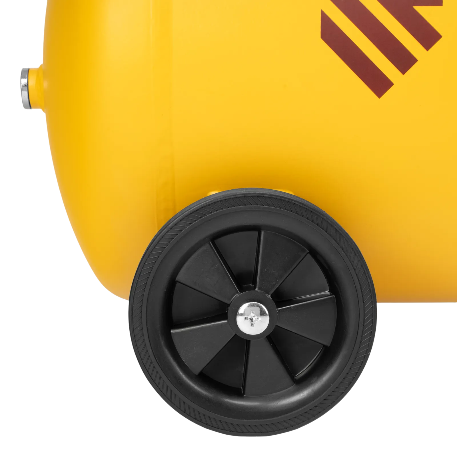 - Мобильность — 2 колеса и транспортировочная рукоятка упрощают перемещение компрессора по рабочей зоне.