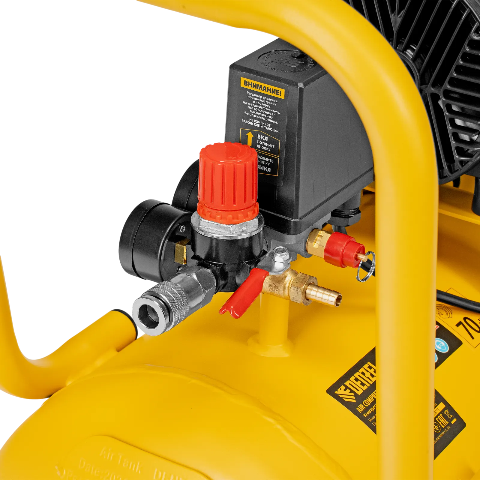 - Безопасность — в случае превышения максимального давления в ресивере срабатывает предохранительный клапан, что позволяет избежать аварийных ситуаций.