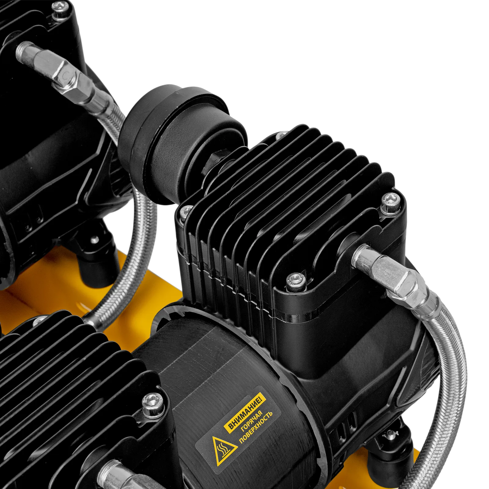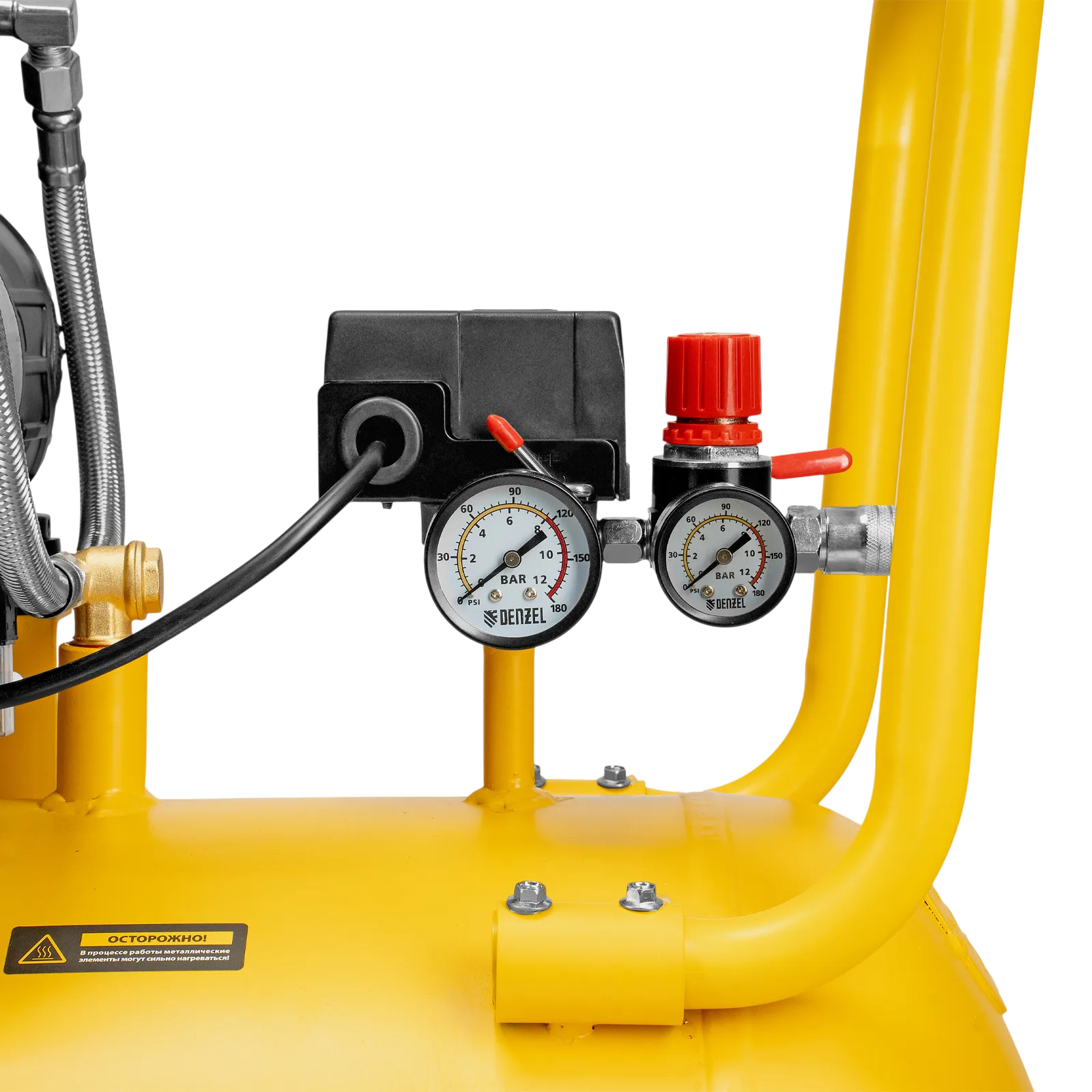 - Контроль работы — компрессор оснащен 2 манометрами для отслеживания давления в ресивере и пневмолинии
