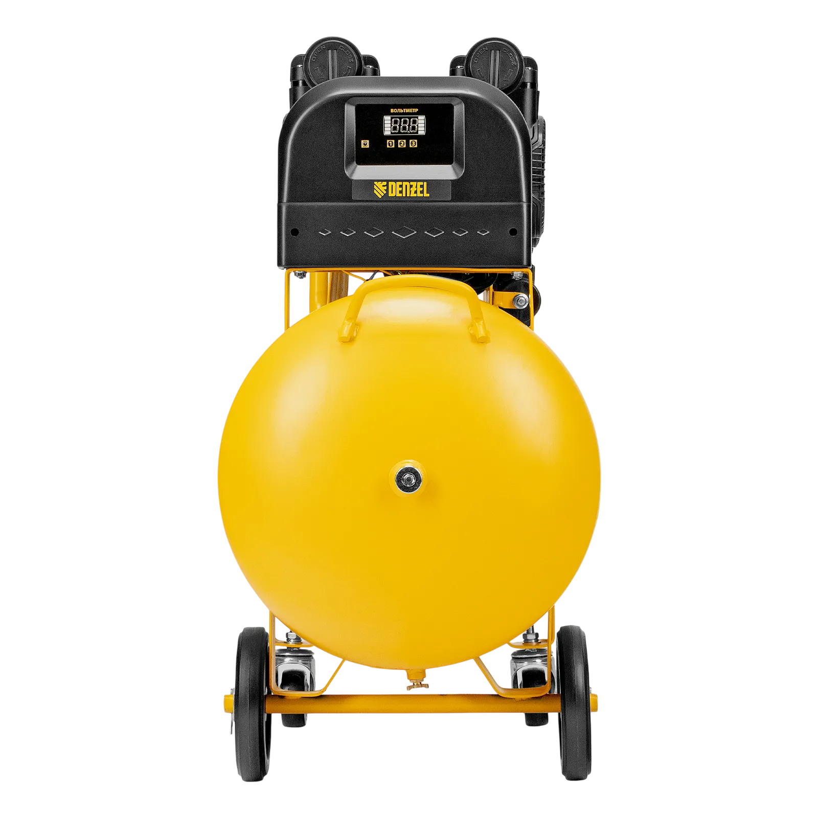 - Мобильность — 4 колеса, в том числе 2 поворотных, и транспортировочная рукоятка упрощают перемещение компрессора по рабочей зоне.