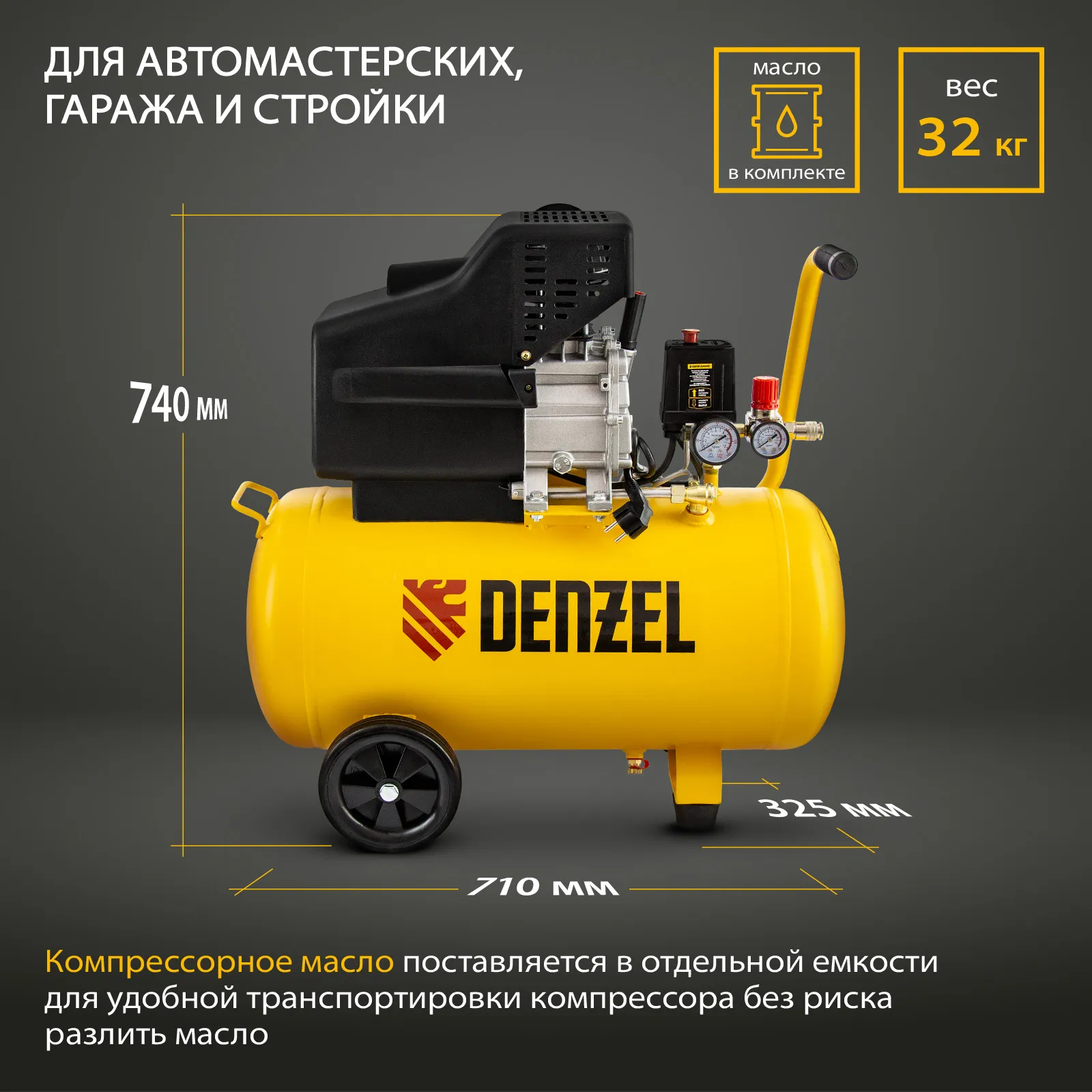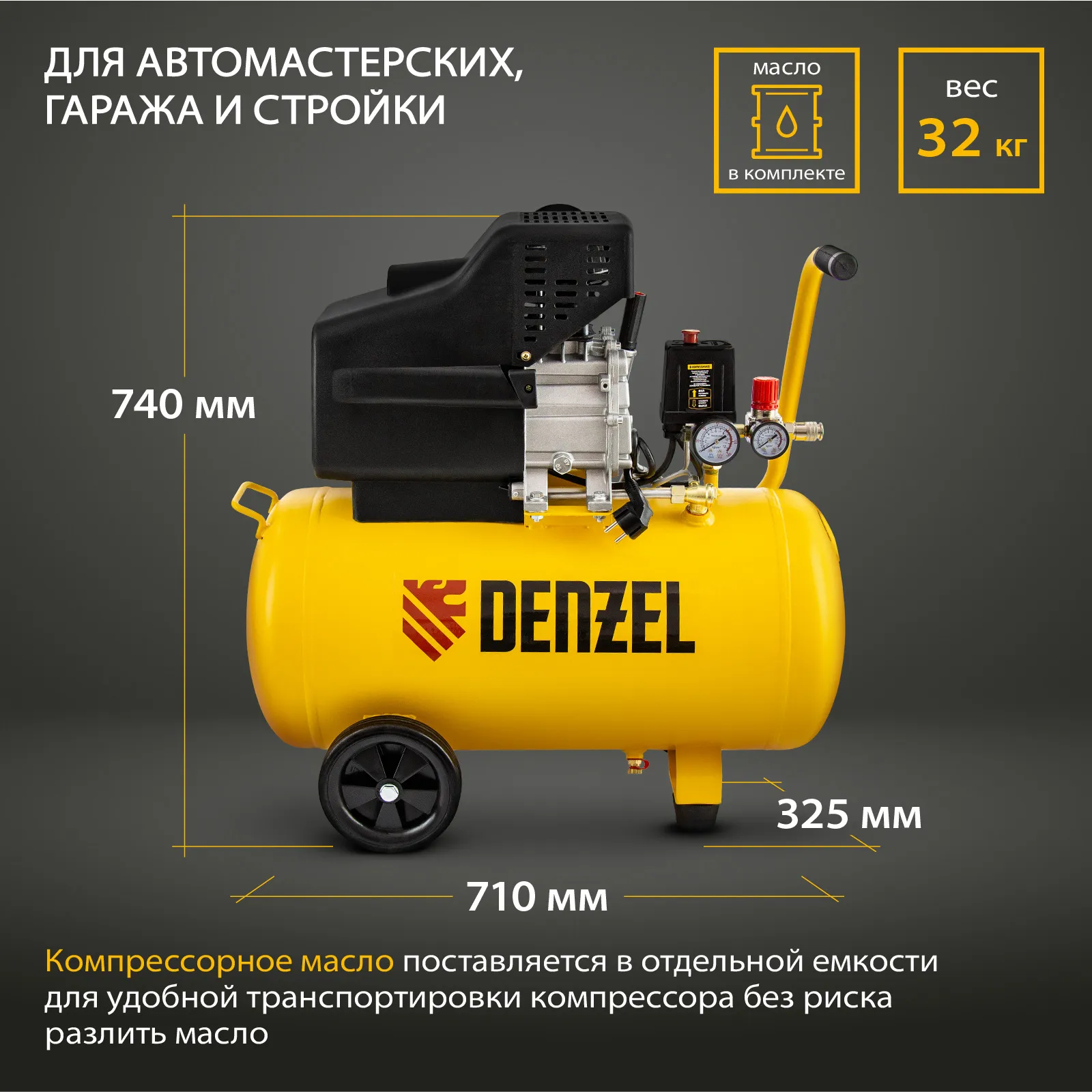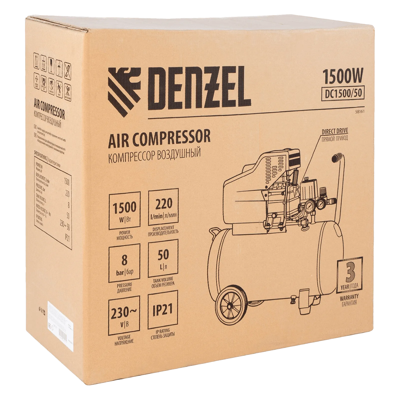 Воздушный компрессор с прямым приводом Denzel DC1500/50 58161 мощностью 1,5 кВт и производительностью 220 л/мин, с объемом ресивера 50 л, используется для подачи сжатого воздуха к пневмоинструменту, например, пневмогайковерту, пневмодрели, пневмостеплеру, пневмозубилу. Благодаря использованию смазочного масла, которое снижает износ деталей, компрессор выдерживает длительную работу и подходит для профессионального применения в автомастерской, гараже или на строительной площадке.