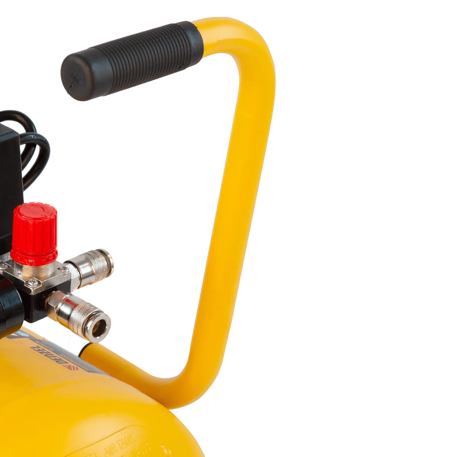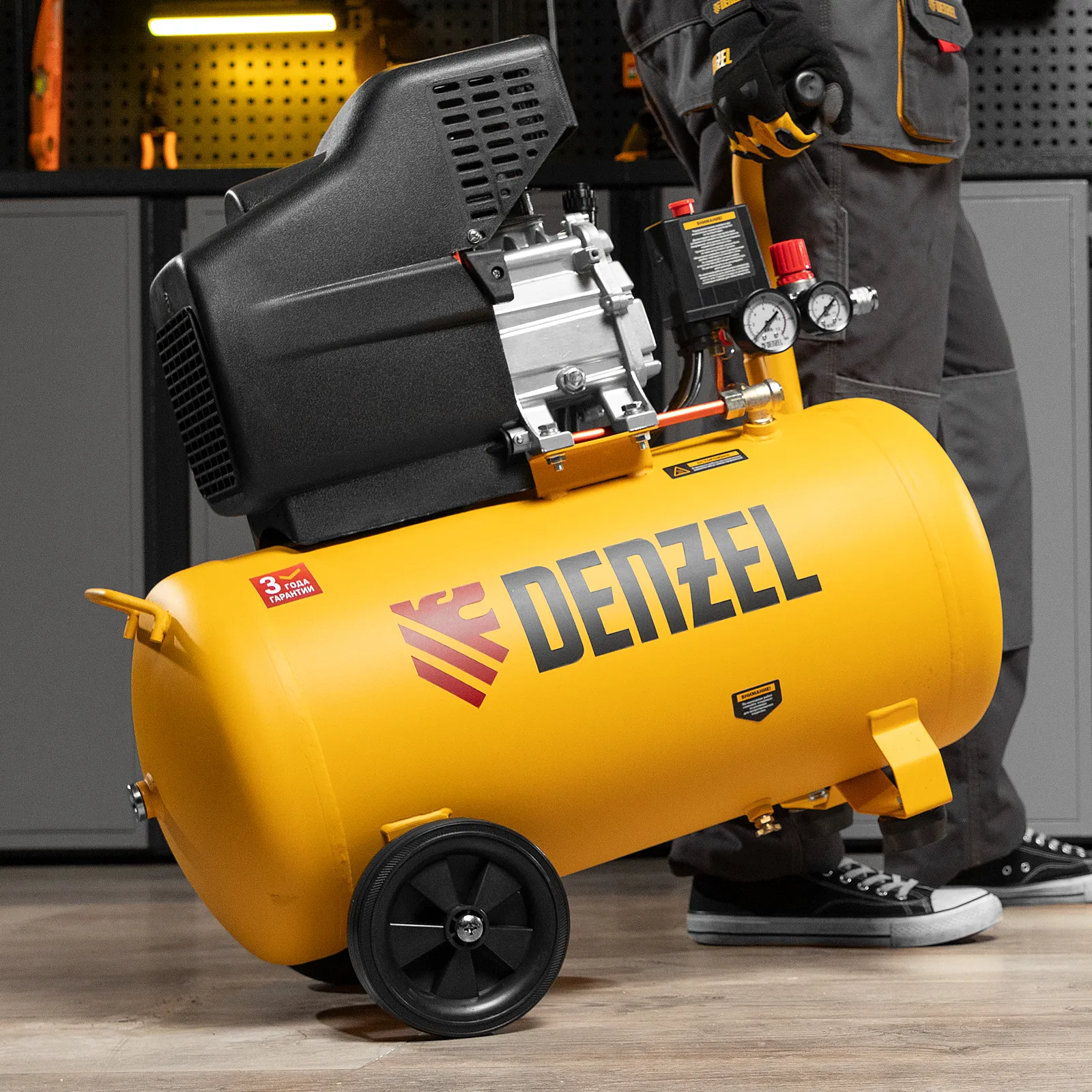 - Мобильность — ручка и колеса облегчают перемещение компрессора по рабочей площадке.