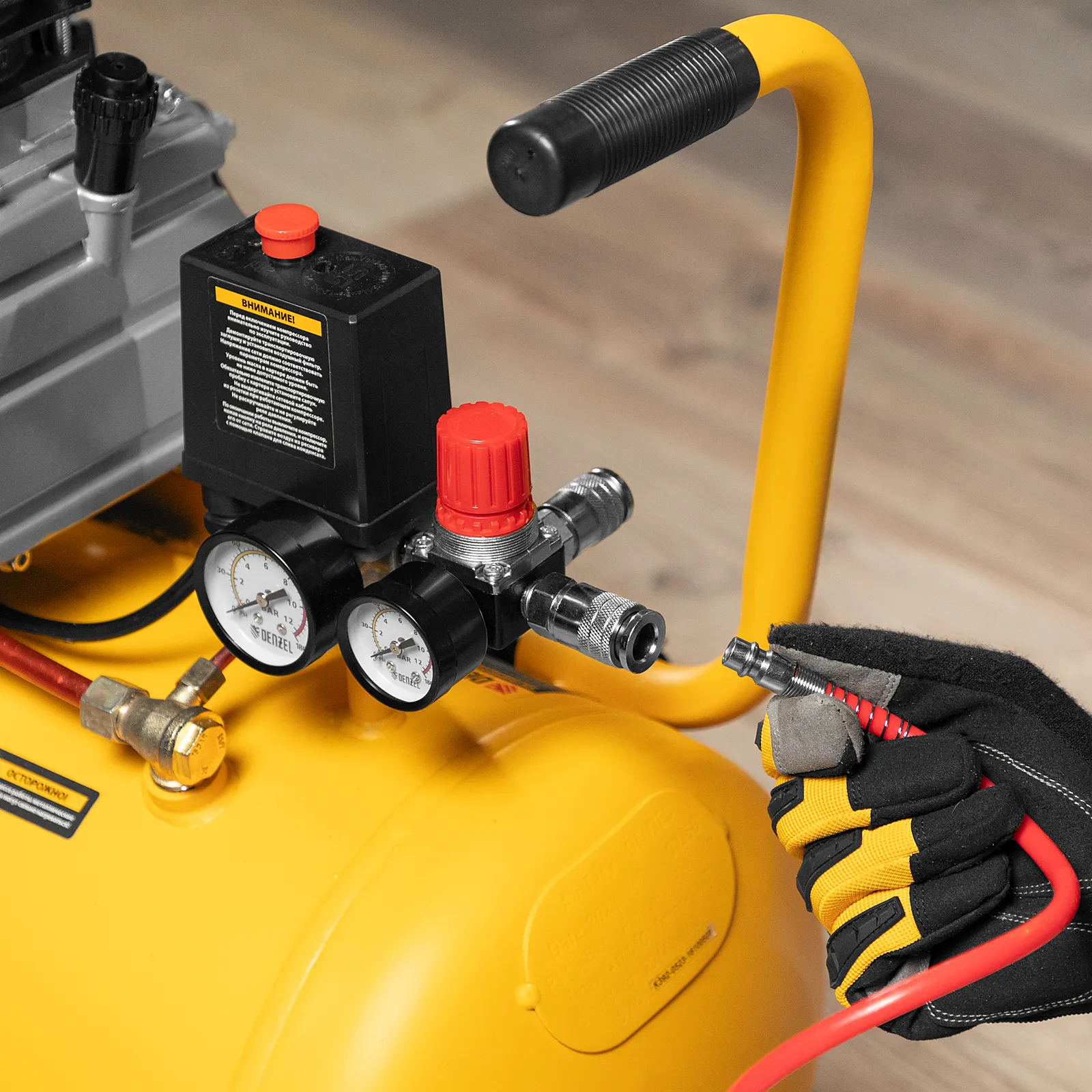 - Быстрое подключение пневмоинструмента — компрессор оснащен быстроразъемным коннектором Euro (Rapid).