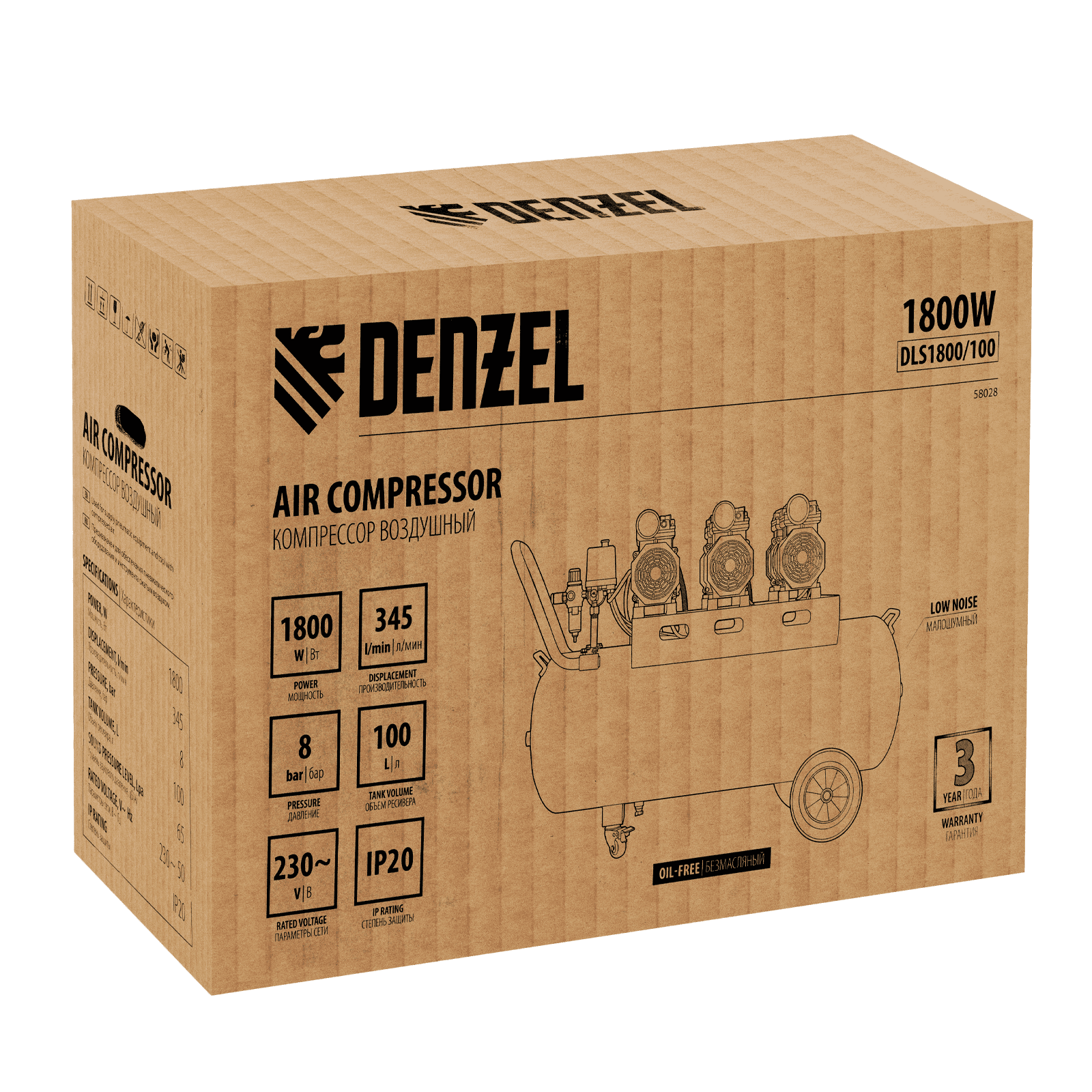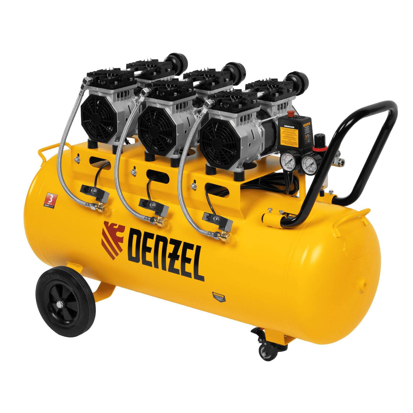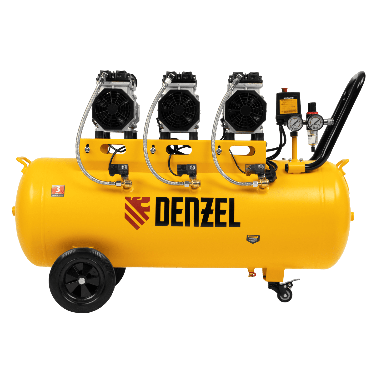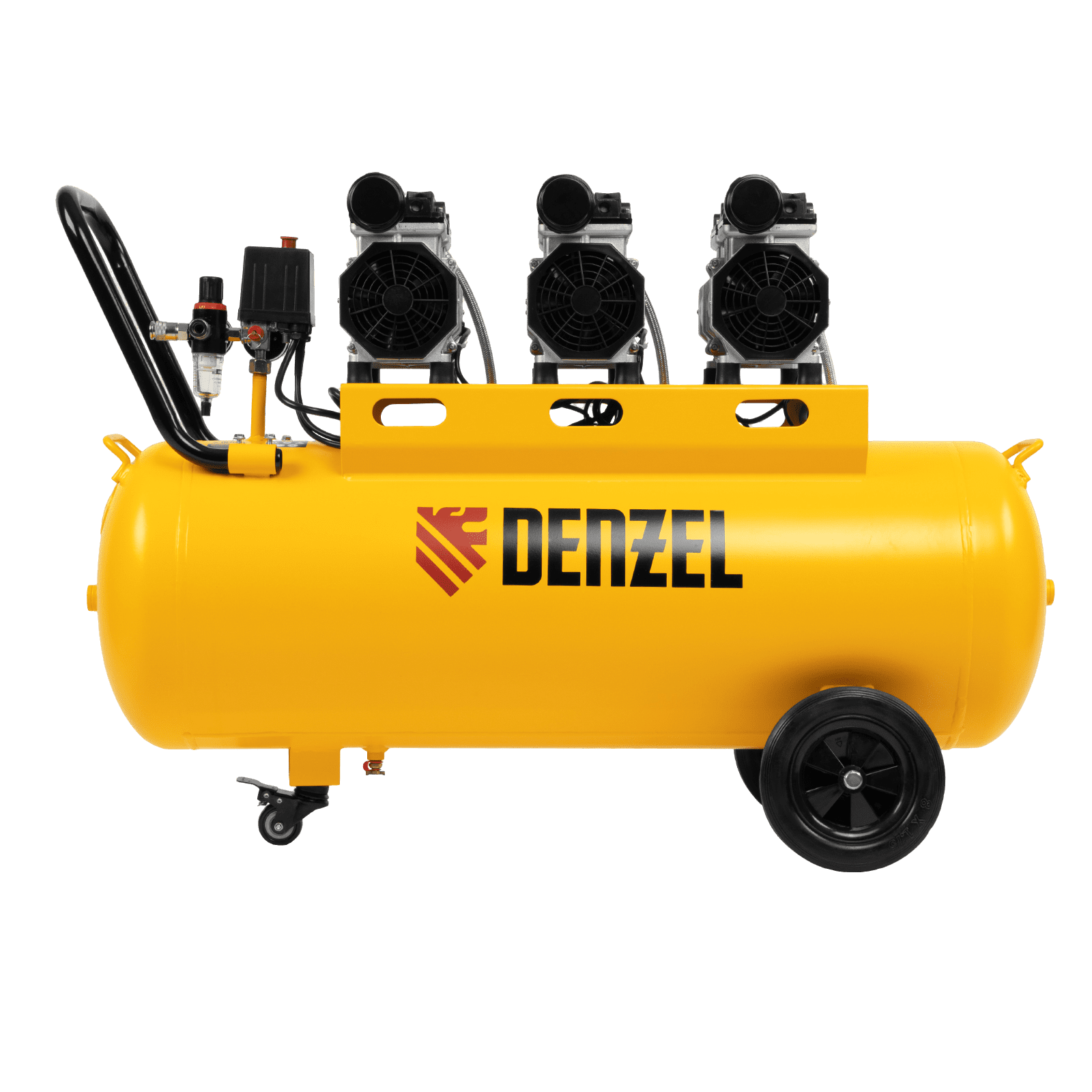 Безмасляный малошумный компрессор Denzel DLS 1800/100 58028 мощностью 1800 (3 х 600) Вт, объемом ресивера 100 л и производительностью 345 л/мин предназначен для обеспечения пневмоинструмента сжатым воздухом, подаваемым под давлением до 8 бар. Позволяет подключить пневматический заклепочник, дрель, шлифмашину и т.д. Оптимален для работы с краскопультом и для продувки электронных компонентов, т. к. в сжатом воздухе отсутствуют частицы масла. Компрессор пригодится в мастерской, гараже, на строительной площадке.