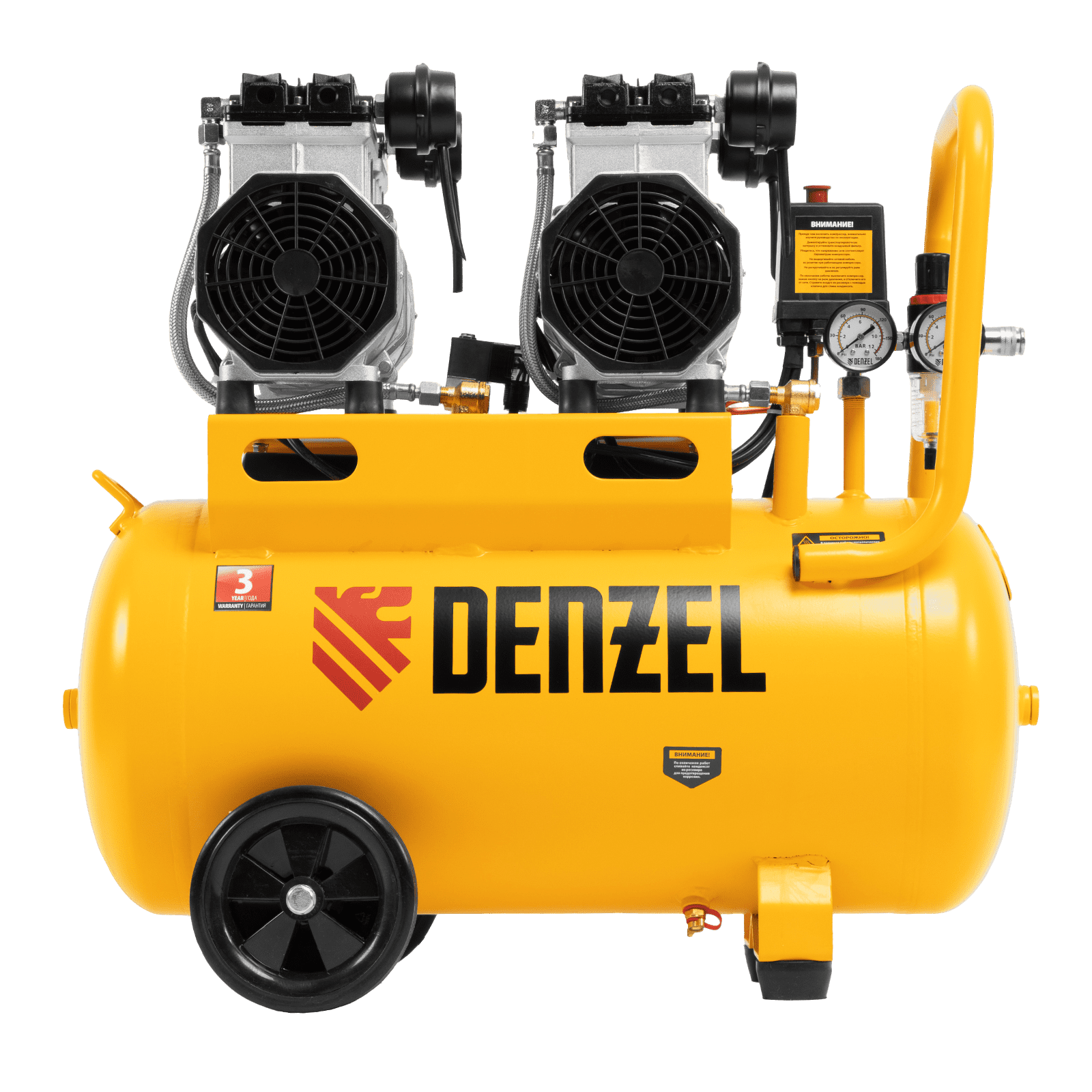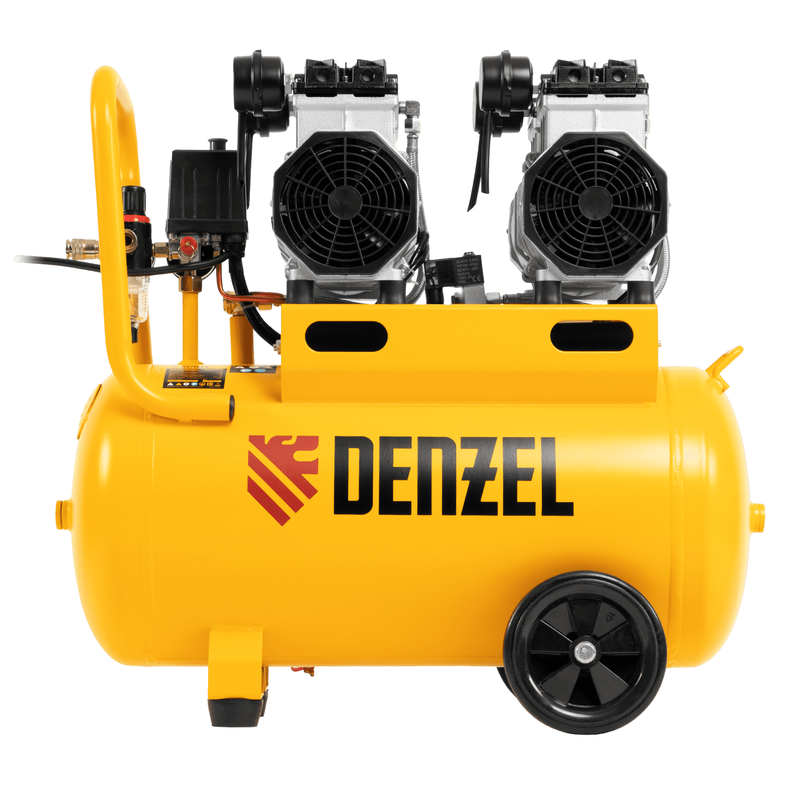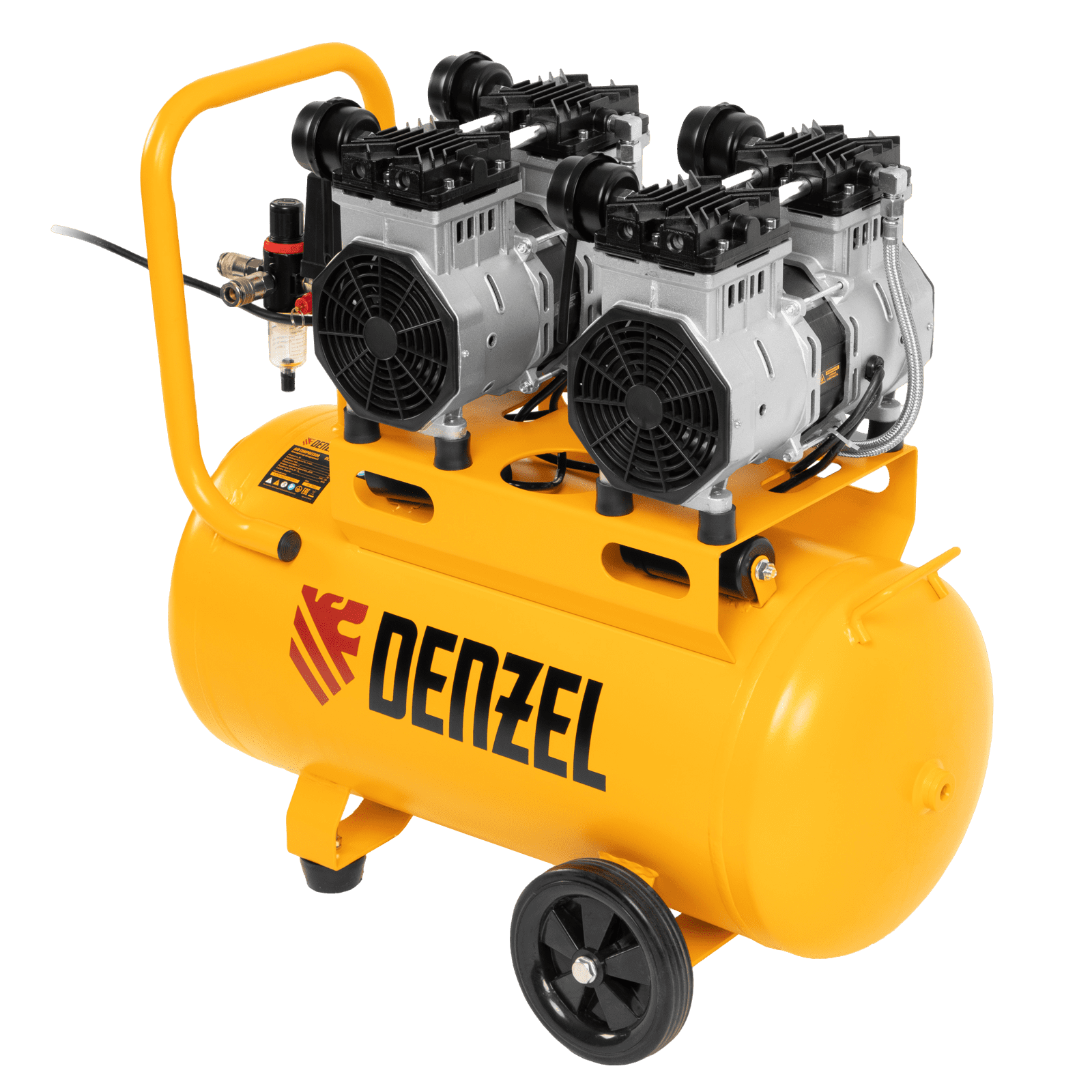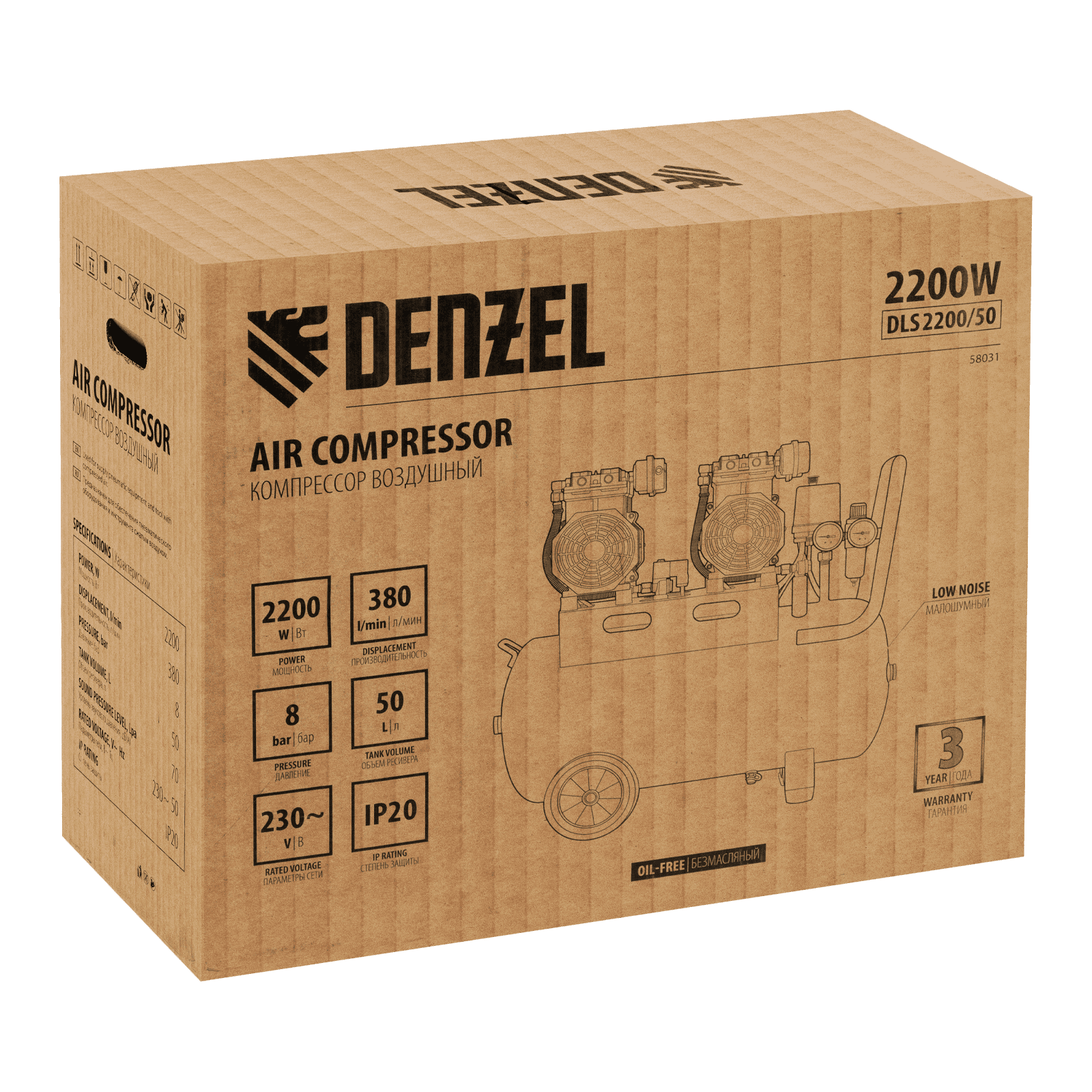 Безмасляный малошумный компрессор Denzel DLS 2200/50 58031 мощностью 2200 (2 х 1100) Вт, объемом ресивера 50 л и производительностью 380 л/мин предназначен для обеспечения пневмоинструмента сжатым воздухом, подаваемым под давлением до 8 бар. Частота вращения вала составляет 2800 об/мин, что позволило добиться увеличения производительности более чем на 40%. Компрессор позволяет подключить пневматический заклепочник, дрель, шлифмашину и т.д. Оптимален для работы с краскопультом и для продувки электронных компонентов, т. к. в сжатом воздухе отсутствуют частицы масла. Компрессор пригодится в мастерской, гараже, на строительной площадке.