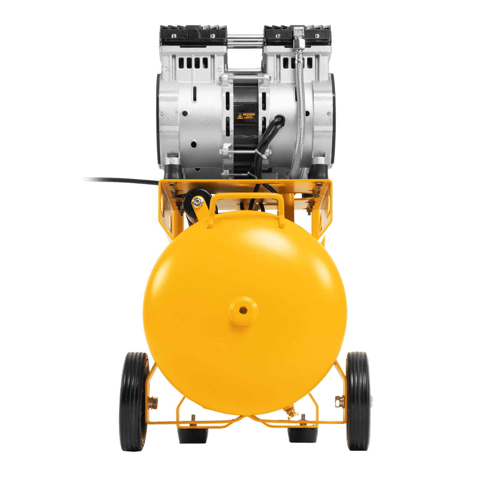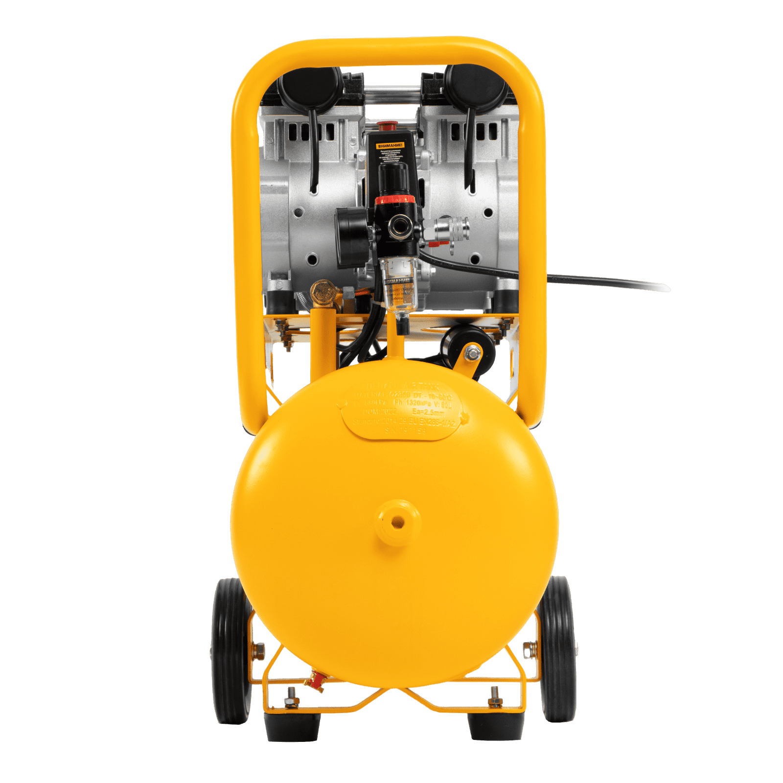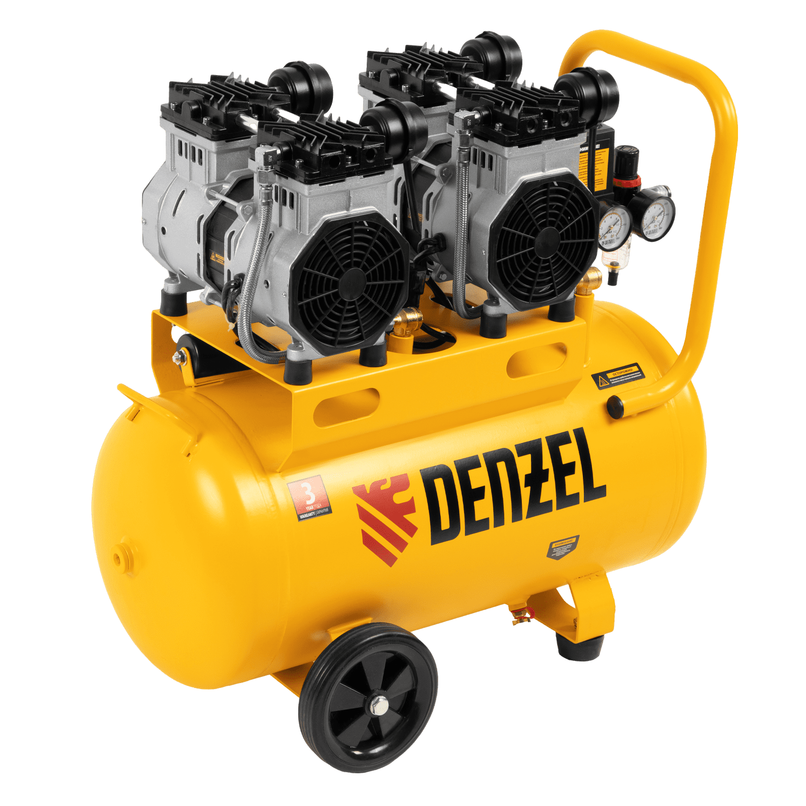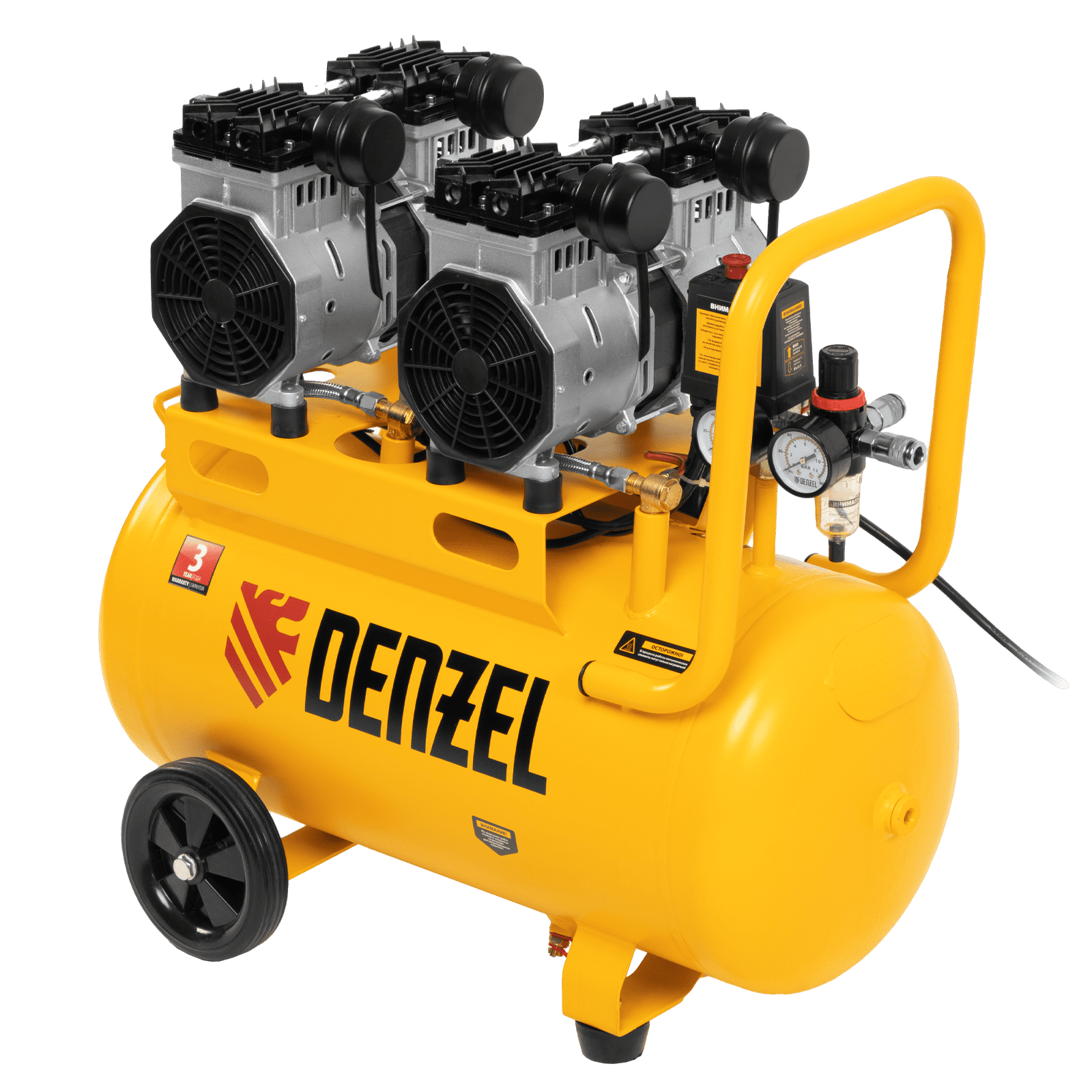 Безмасляный малошумный компрессор Denzel DLS 2200/50 58031 мощностью 2200 (2 х 1100) Вт, объемом ресивера 50 л и производительностью 380 л/мин предназначен для обеспечения пневмоинструмента сжатым воздухом, подаваемым под давлением до 8 бар. Частота вращения вала составляет 2800 об/мин, что позволило добиться увеличения производительности более чем на 40%. Компрессор позволяет подключить пневматический заклепочник, дрель, шлифмашину и т.д. Оптимален для работы с краскопультом и для продувки электронных компонентов, т. к. в сжатом воздухе отсутствуют частицы масла. Компрессор пригодится в мастерской, гараже, на строительной площадке.