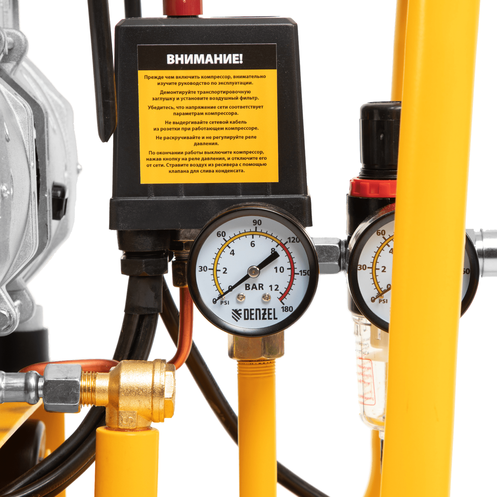 - Контроль давления в ресивере и на выходной магистрали — компрессор оборудован двумя манометрами.