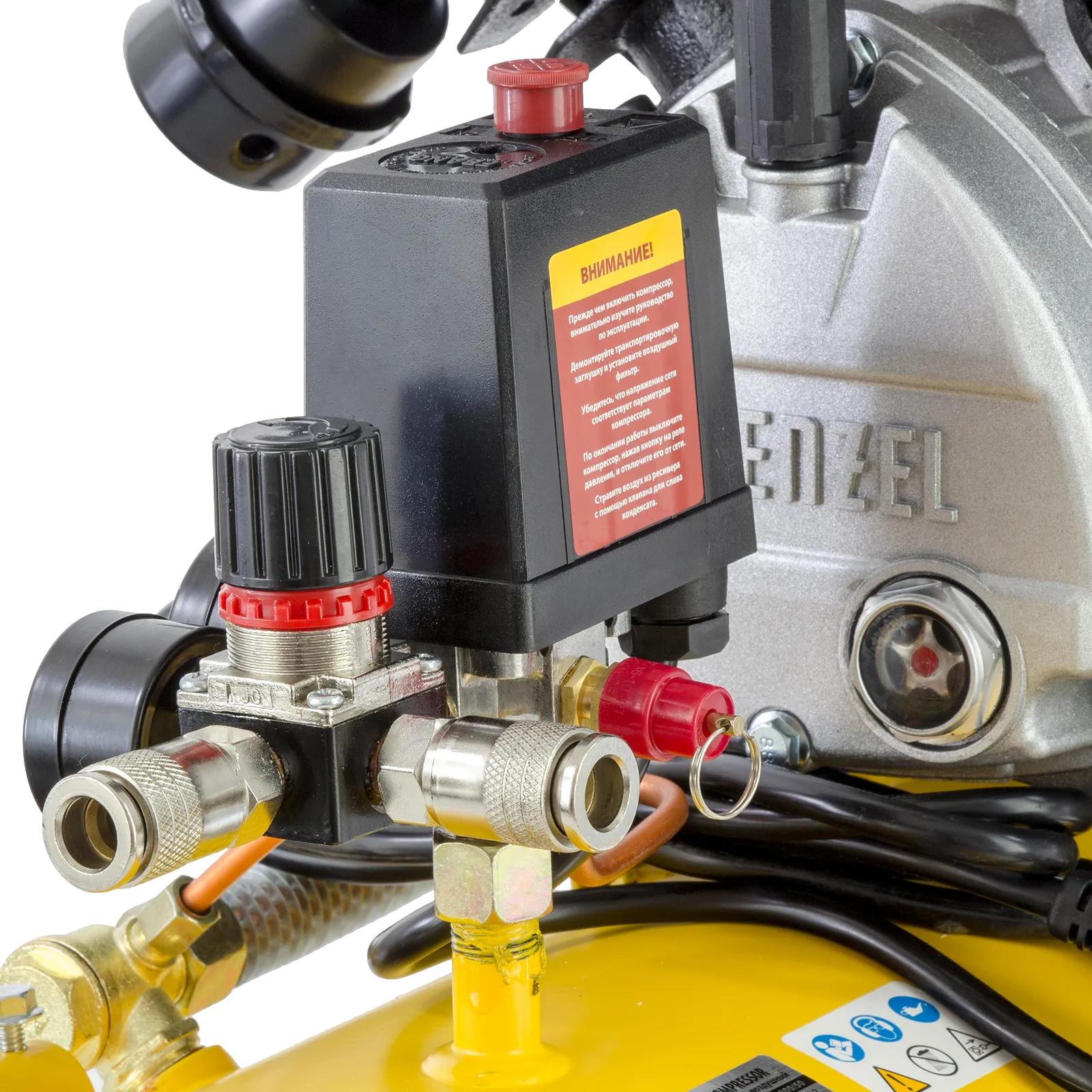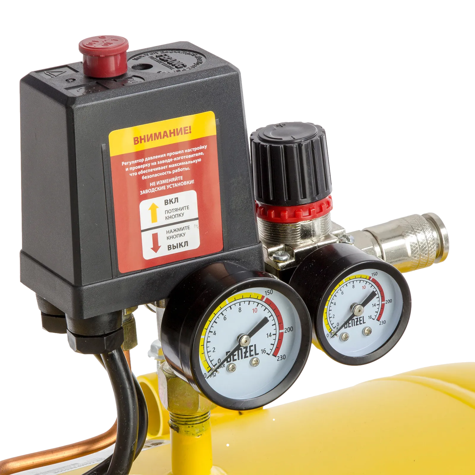 - Контроль рабочих параметров — 2 манометра облегчают отслеживание давления в ресивере и пневмомагистрали.