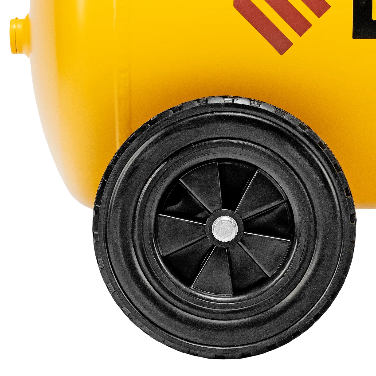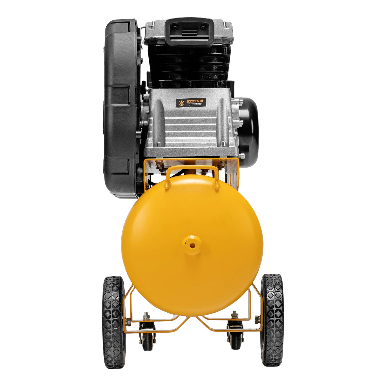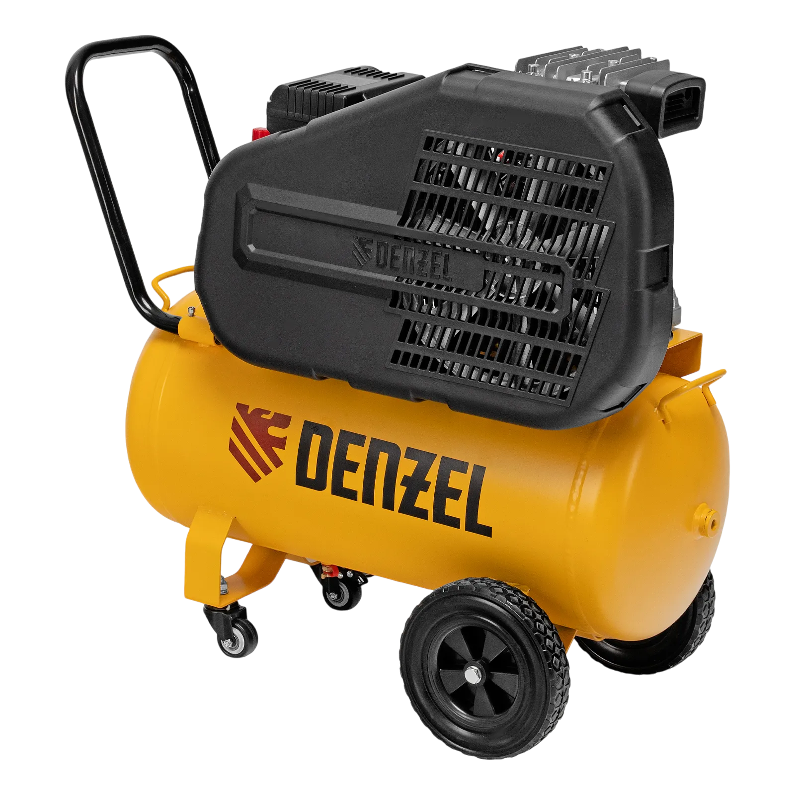- Удобная транспортировка — на компрессоре установлены колеса, в т. ч. поворотные, и П-образная рукоятка.