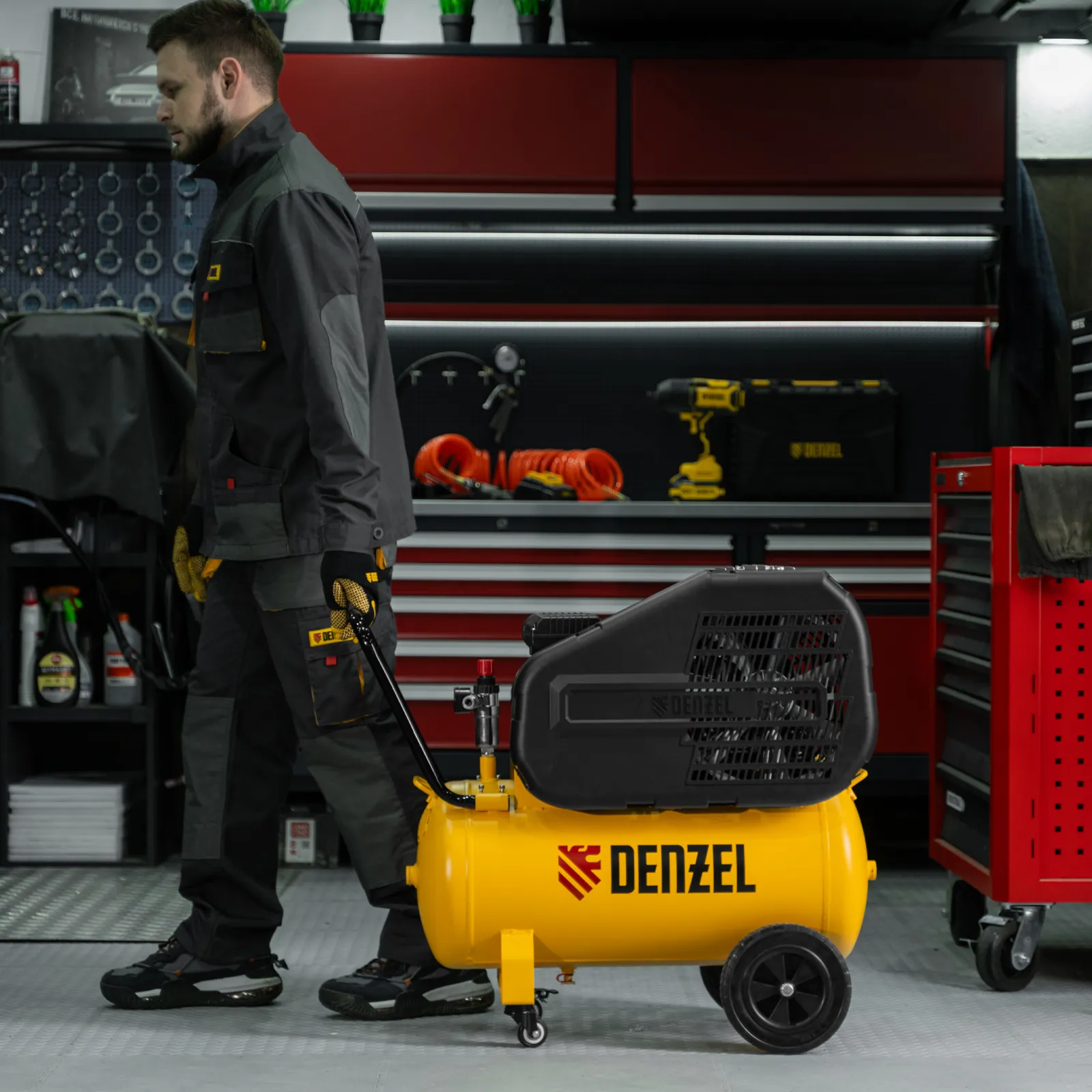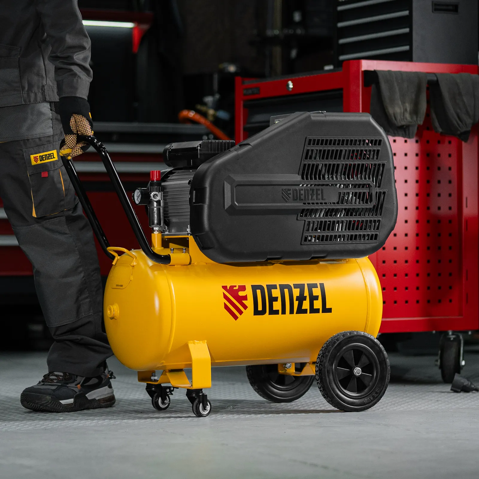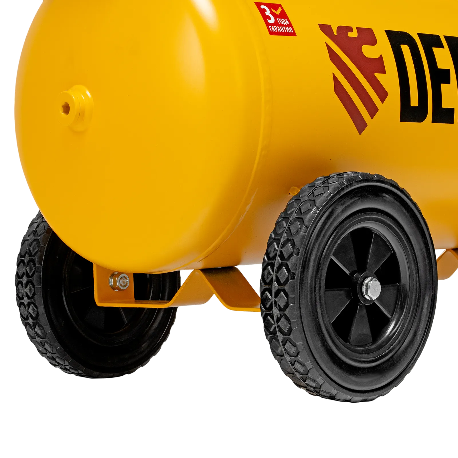 - Удобная транспортировка — на компрессоре установлены колеса, в т. ч. поворотные, и П-образная рукоятка.