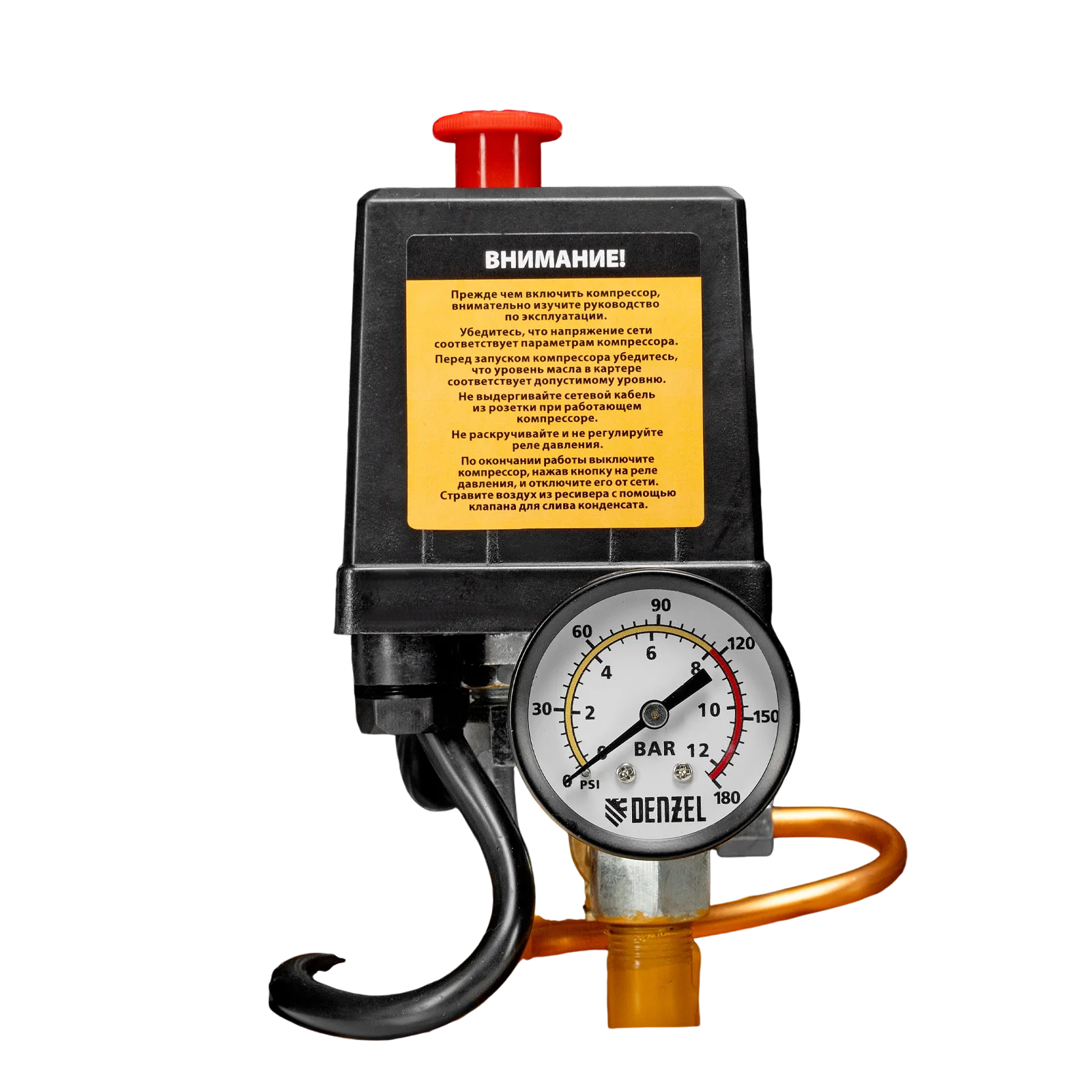 - Автономная работа — прессостат останавливает компрессор по достижении максимального рабочего давления 8 бар и запускает его, если давление падает ниже допустимого уровня.