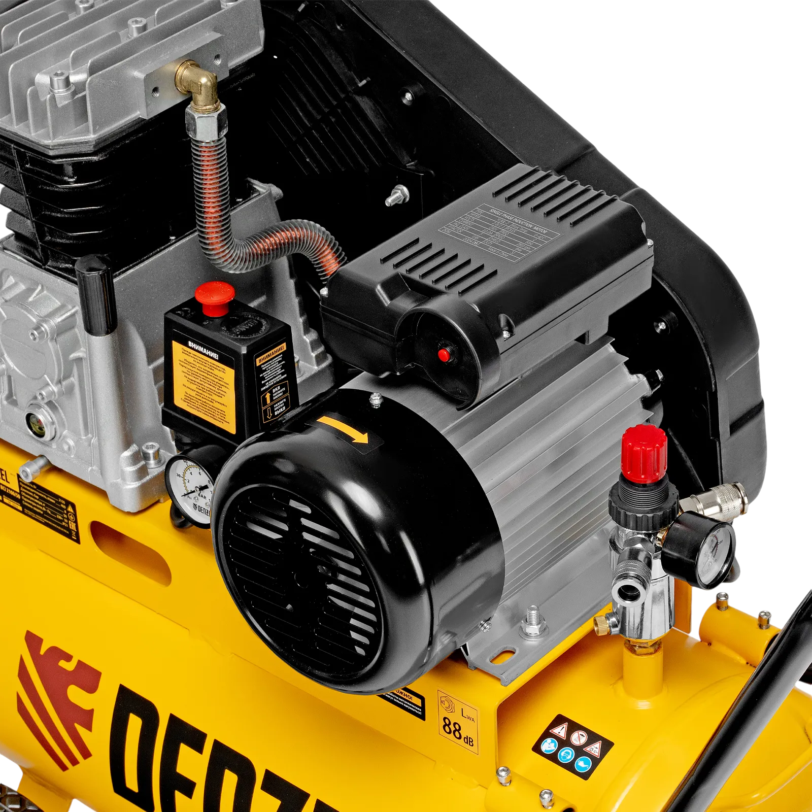 - Безопасность — в случае превышения максимально допустимого давления в ресивере срабатывает предохранительный клапан.