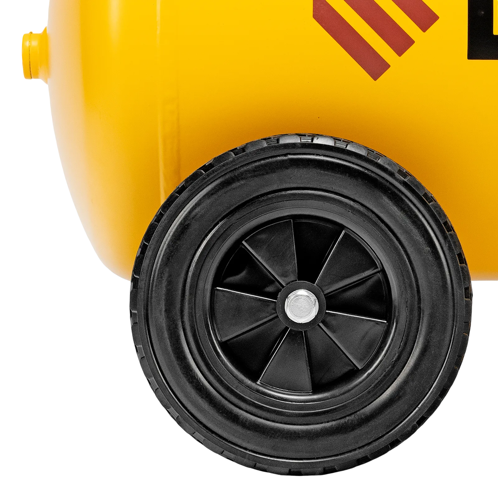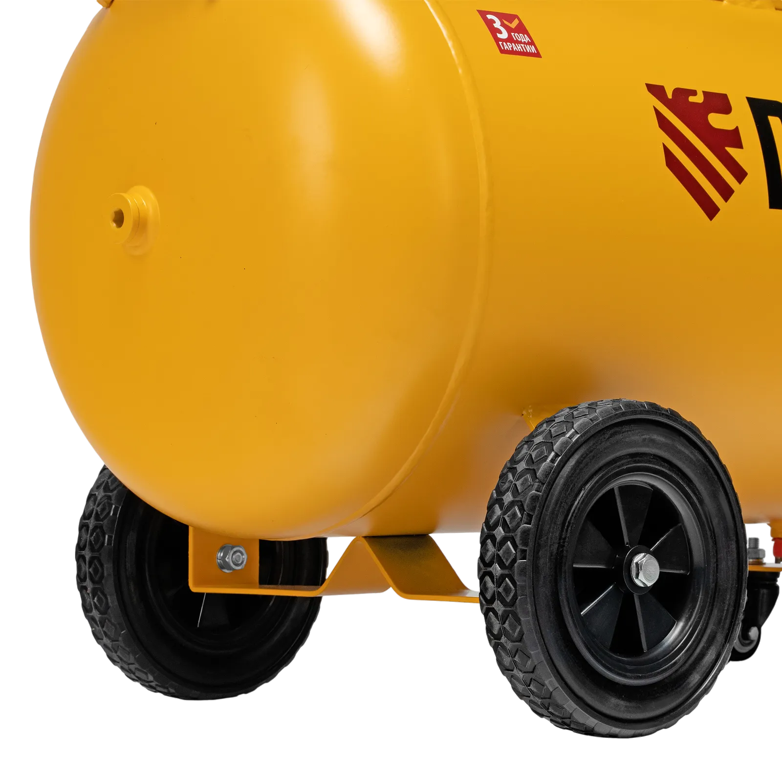 - Удобная транспортировка — на компрессоре установлены колеса, в т. ч. поворотные, и П-образная рукоятка.