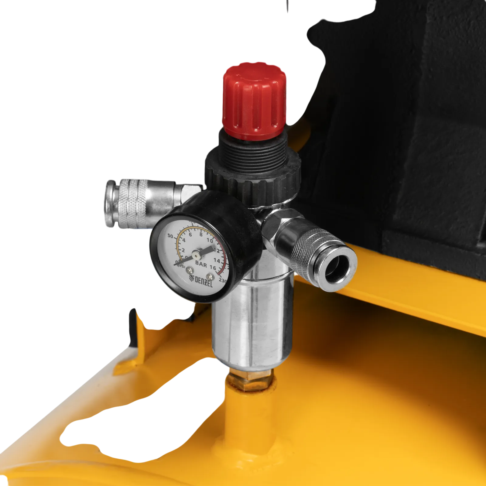 - Удобный контроль давления в ресивере и пневмомагистрали — компрессор оснащен двумя механическими манометрами.