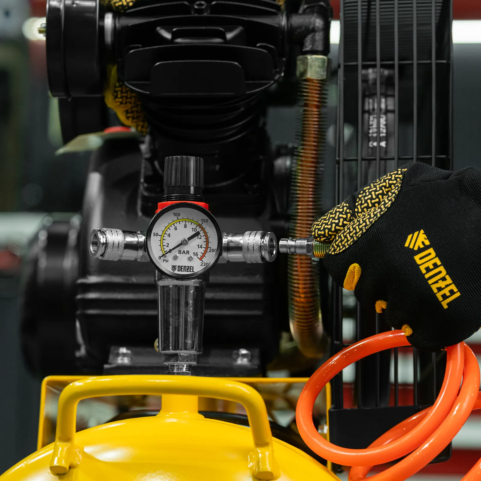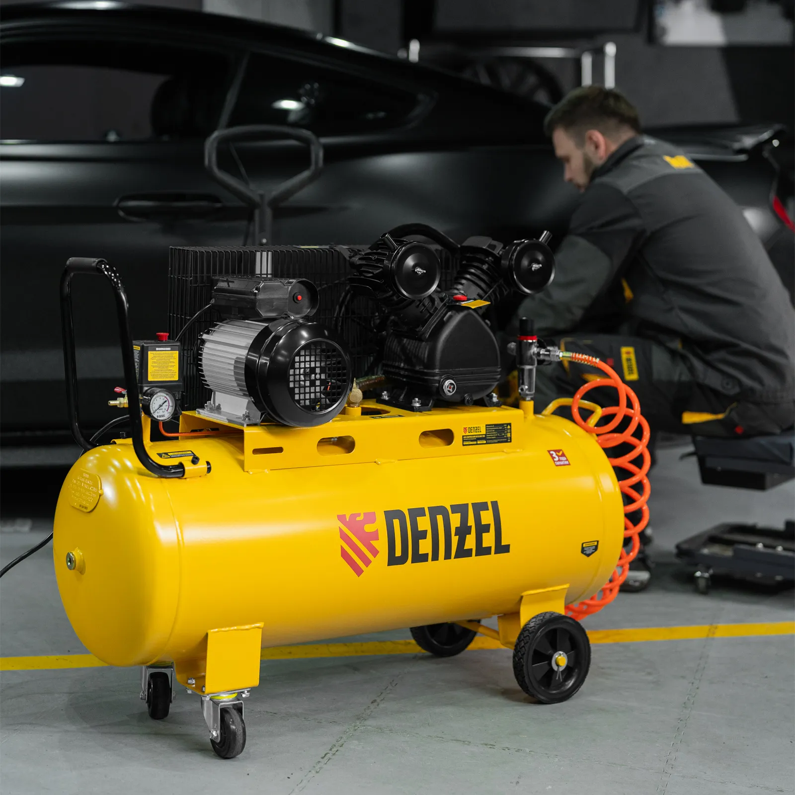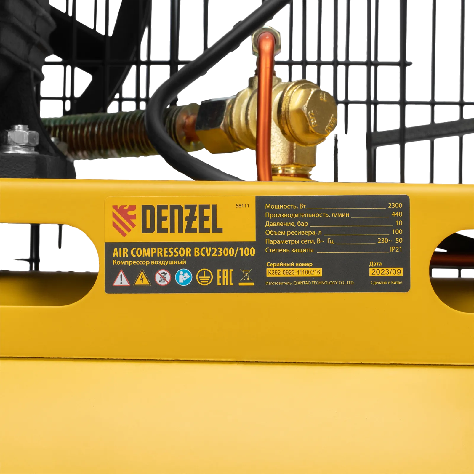 Компрессор Denzel BCV2300/100 58111 мощностью 2,3 кВт, с ресивером на 100 л, способен производить 440 литров сжатого воздуха в минуту. К нему могут подключаться сразу 2 пневмоинструмента, например, продувочный пистолет и плазморез. Высокие показатели производительности позволяют использовать данный компрессор в подсобных хозяйствах, гаражах, на станциях техобслуживания автомобилей, мебельных фабриках и т.д.;Отличительная особенность компрессора по сравнению с аналогами мощностью 2,3 кВт — это фильтр-влагоотделитель, установленный на выходе. Он препятствует попаданию конденсата и частиц масла в пневмомагистраль, что особенно важно при малярных работах и продувке элементов с электрическим соединением.