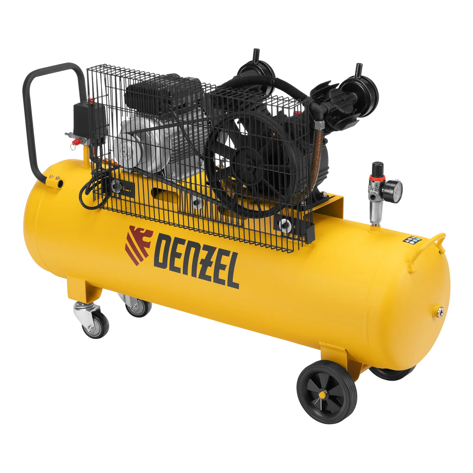 - Быстрая транспортировка — колеса и П-образная ручка позволяют легко разворачивать и транспортировать компрессор в нужное место.