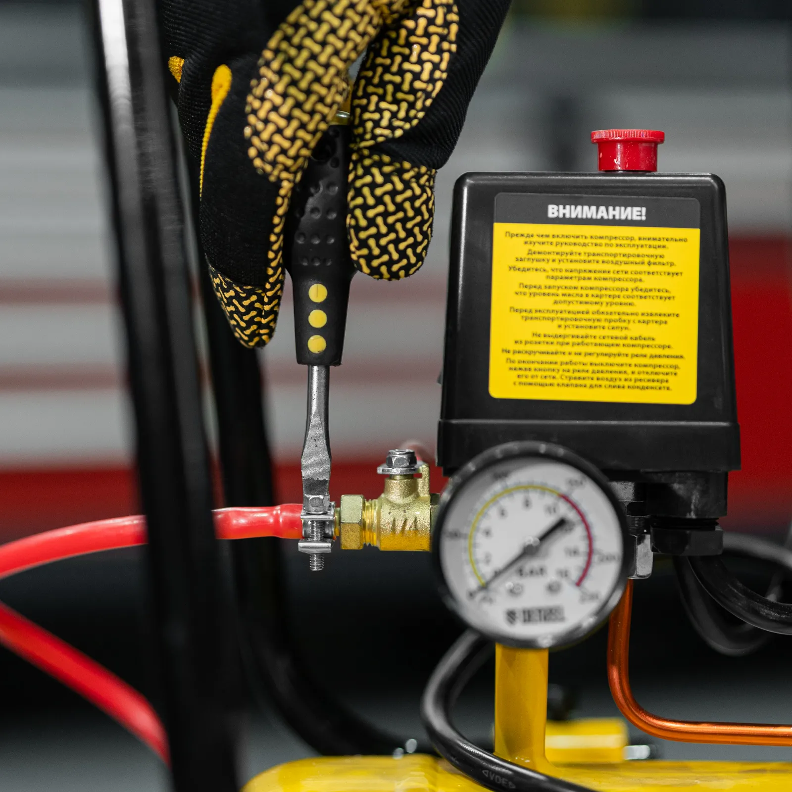 - Клапан сброса давления — если реле не сработает при давлении выше 10 бар, избыточный воздух автоматически сбросится, эта система служит дополнительной подстраховкой и гарантирует безопасность работы.