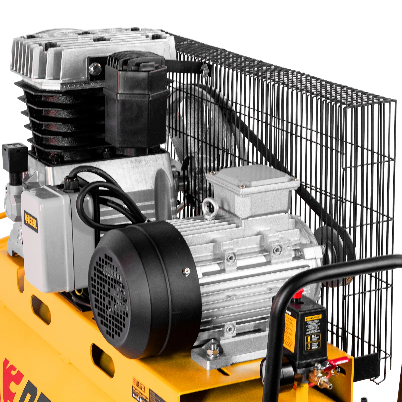 - Комфортная транспортировка — компрессор можно свободно перемещать по рабочей площадке благодаря удобной П-образной ручки и 4 колесам.
