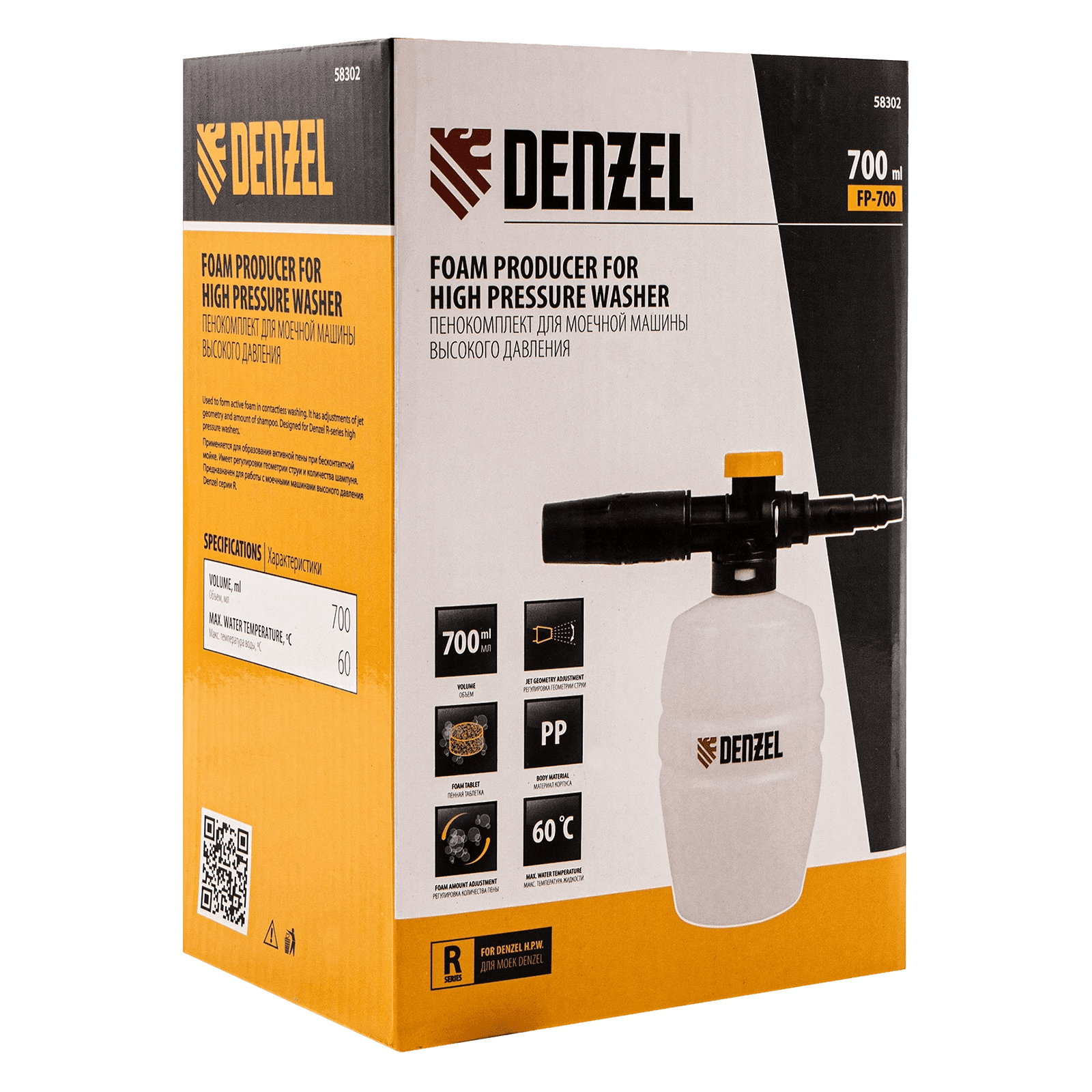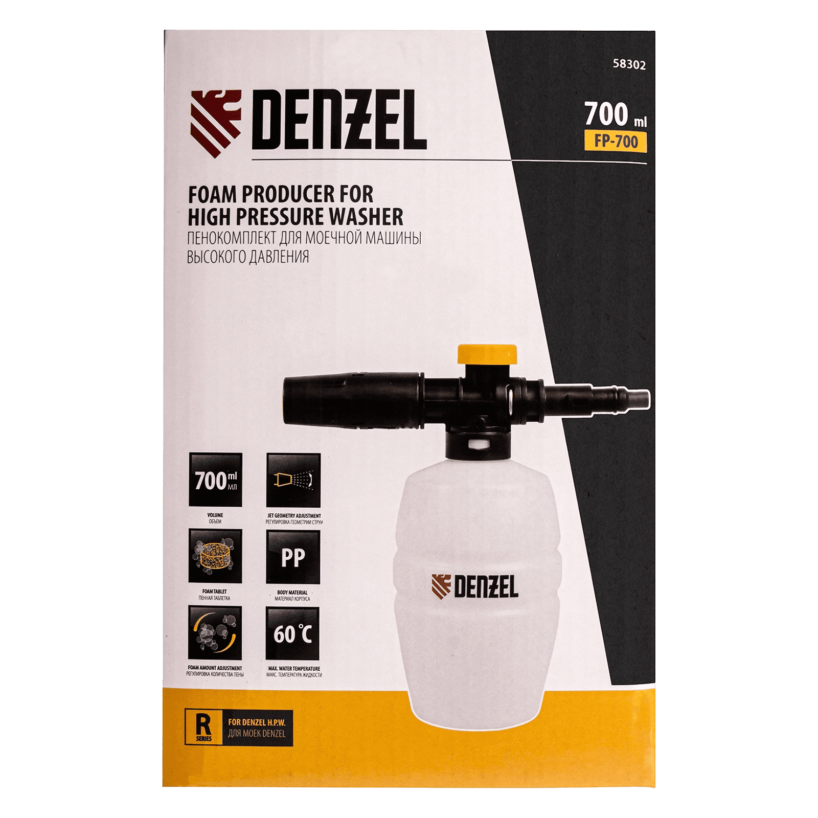 Универсальный пенокомплект Denzel FP-700 58302 совместим со всеми моечными машинами высокого давления Denzel серии R. Он формирует густую и активную пену для очищения различных поверхностей, в том числе кузова автомобиля.