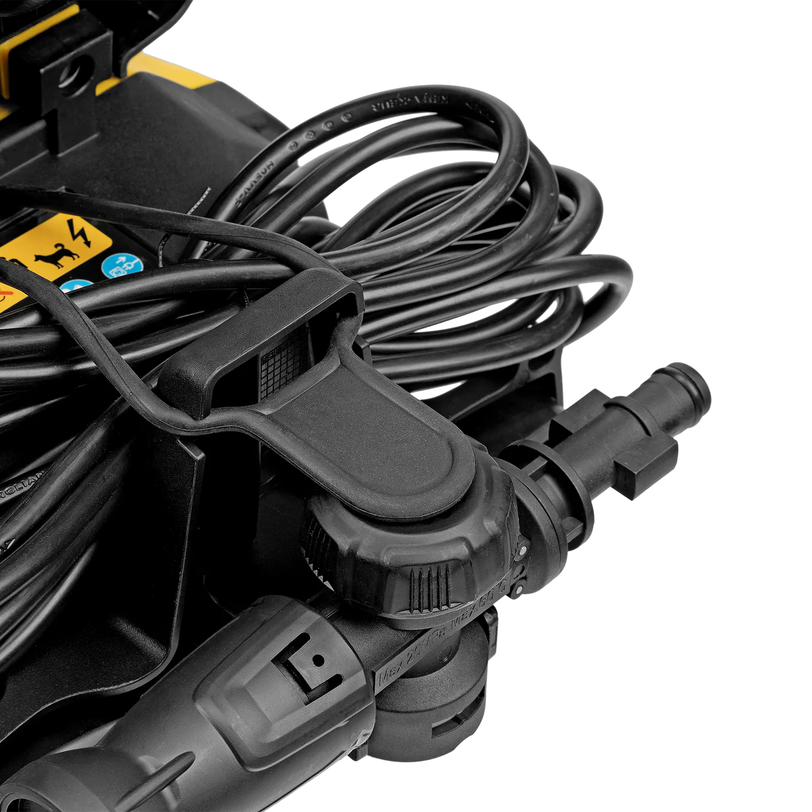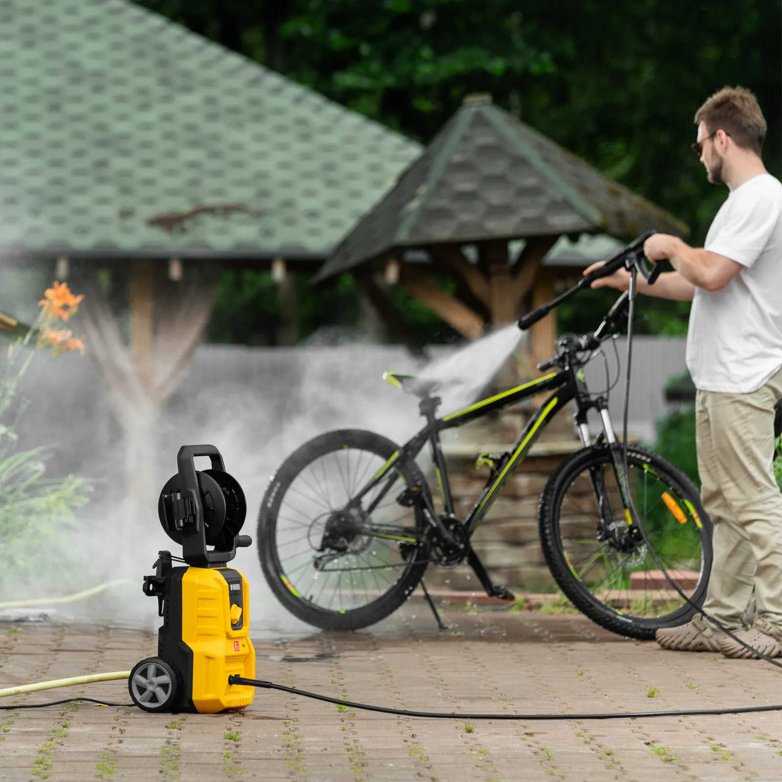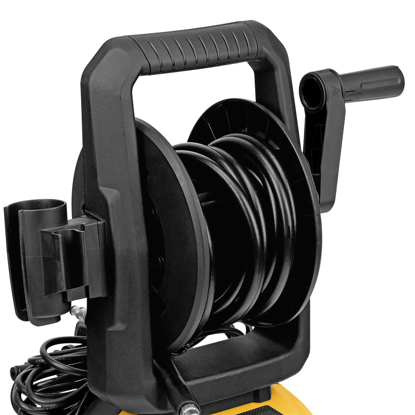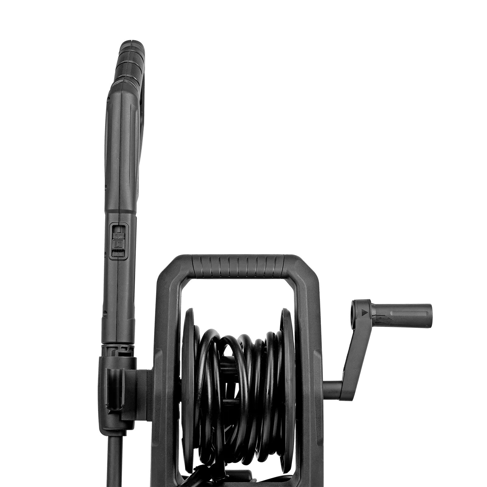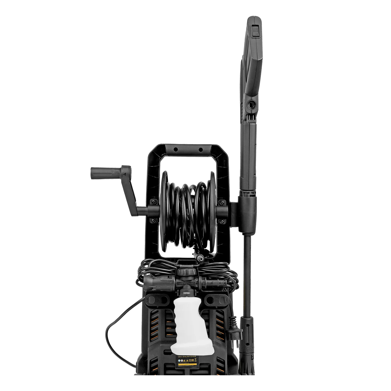 - Комфортная эксплуатация — барабан для шланга высокого давления упрощает работу, длина кабеля и шланга высокого давления составляет 5 м, что позволяет свободно передвигаться по участку.