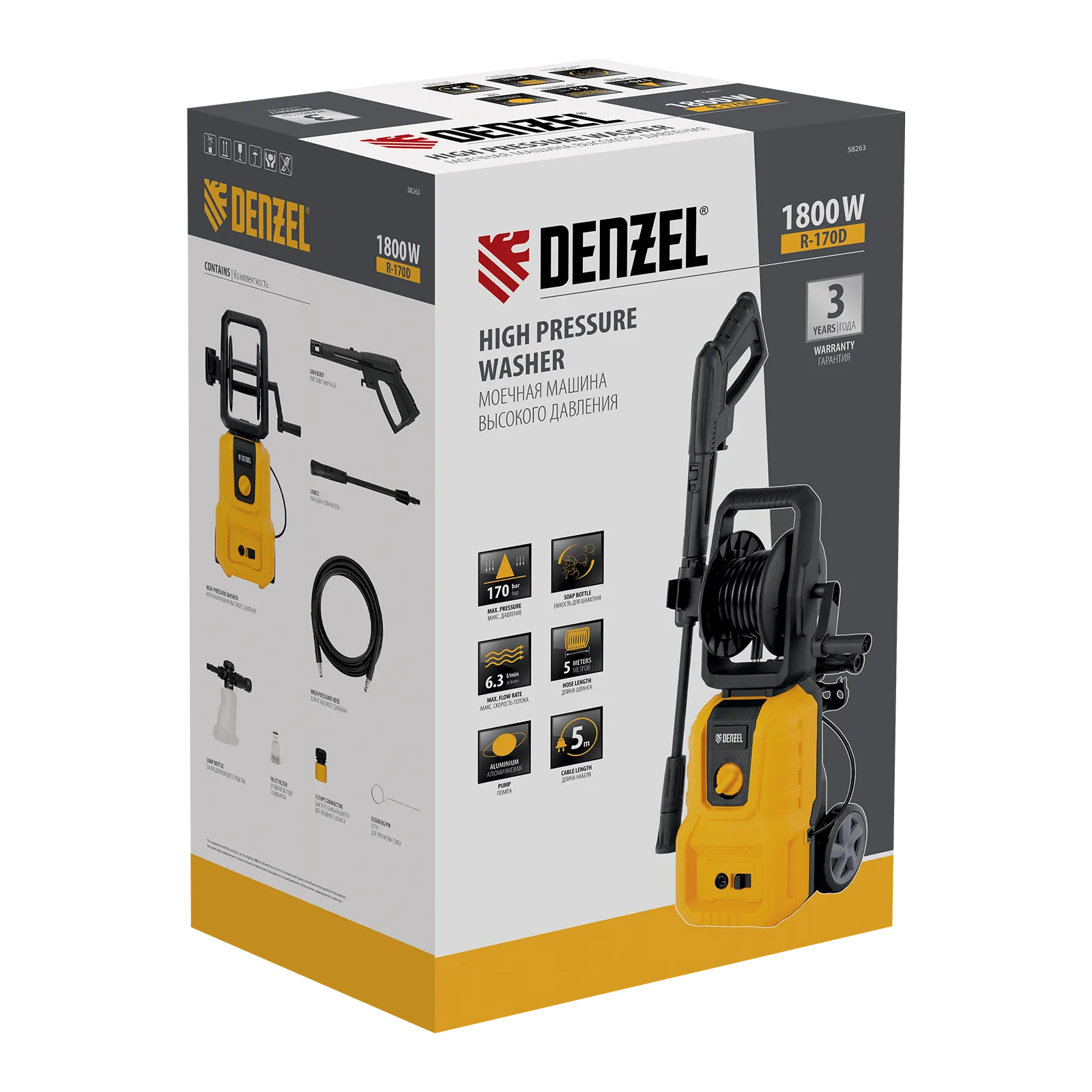 Моечная машина высокого давления Denzel R-170D 58263 с барабаном, мощностью 1800 Вт, поддерживает максимальное рабочее давление 170 бар и обеспечивает объем подачи воды 380 л/ч. Позволяет быстро и эффективно очистить садовый инвентарь, фасад дома, дорожку, отмыть автомобиль и т.д. Оснащена самовсасывающим насосом, поэтому может работать даже без подключения к водопроводу — подойдет любой резервуар или емкость с водой. Машина оптимальна для бытового использования.