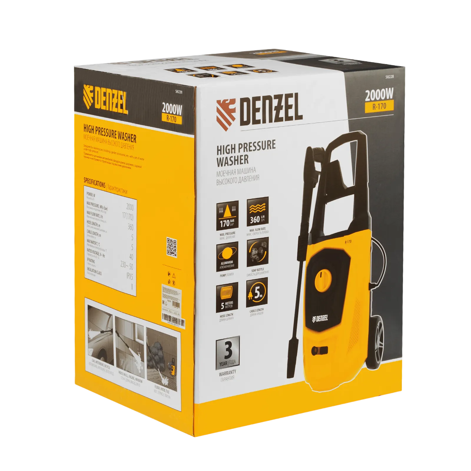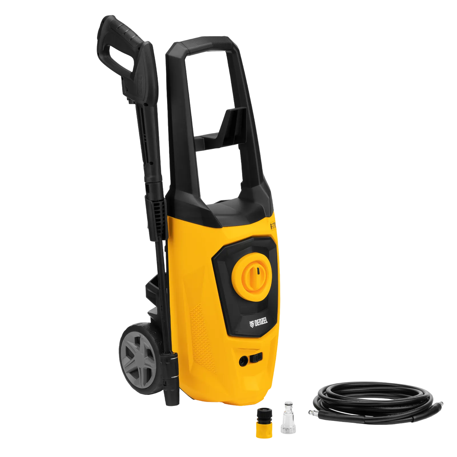 Колесная моечная машина высокого давления Denzel R-170 58228 мощностью 2000 Вт и производительностью 360 л/ч подает струю воды под давлением 170 бар и используется для очищения поверхностей. Позволяет быстро удалить загрязнения с кузова автомобиля, мотоцикла, велосипеда, садового и хозяйственного инвентаря, очистить садовую дорожку и террасу, а также стены и окна строений. Источником воды может служить водопроводная линия, а также любая емкость — машина способна работать в режиме самовсасывания. Мойка пригодится владельцам загородных участков.