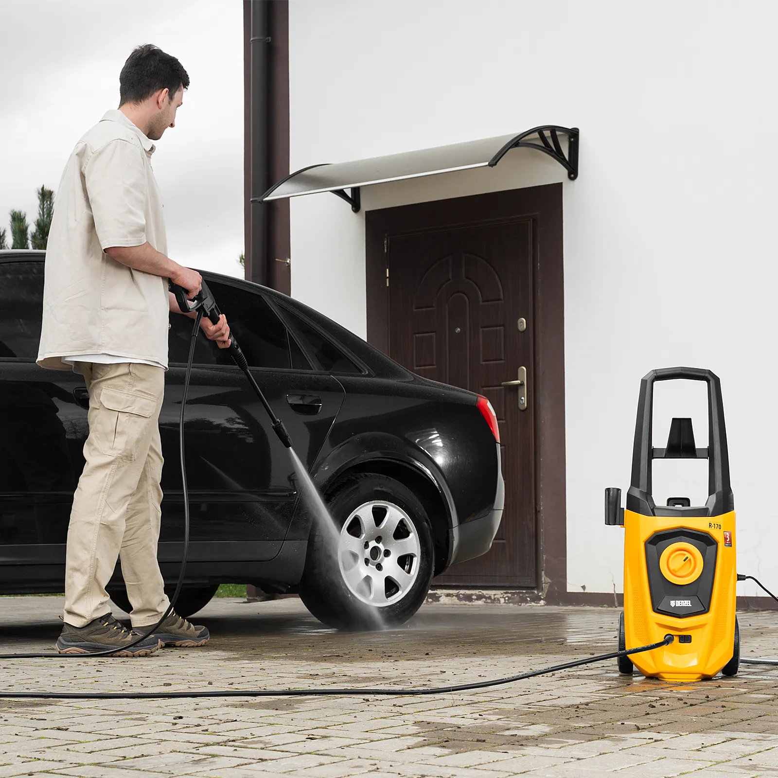 - Длина шланга и кабеля 5 м — не нужно часто перемещать машину, можно работать на удалении от розетки.