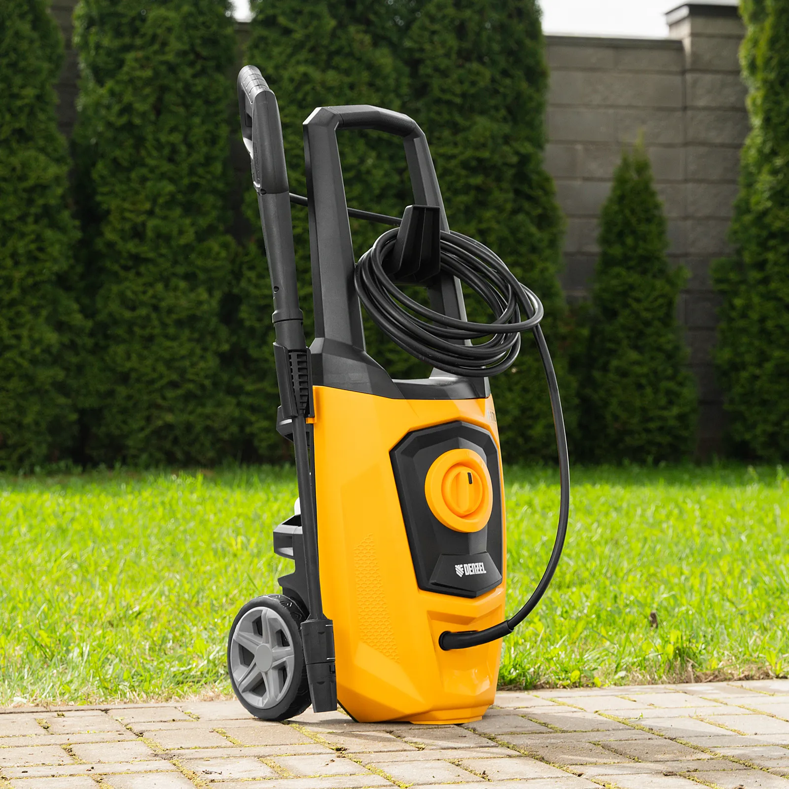 - Длина шланга и кабеля 5 м — не нужно часто перемещать машину, можно работать на удалении от розетки.