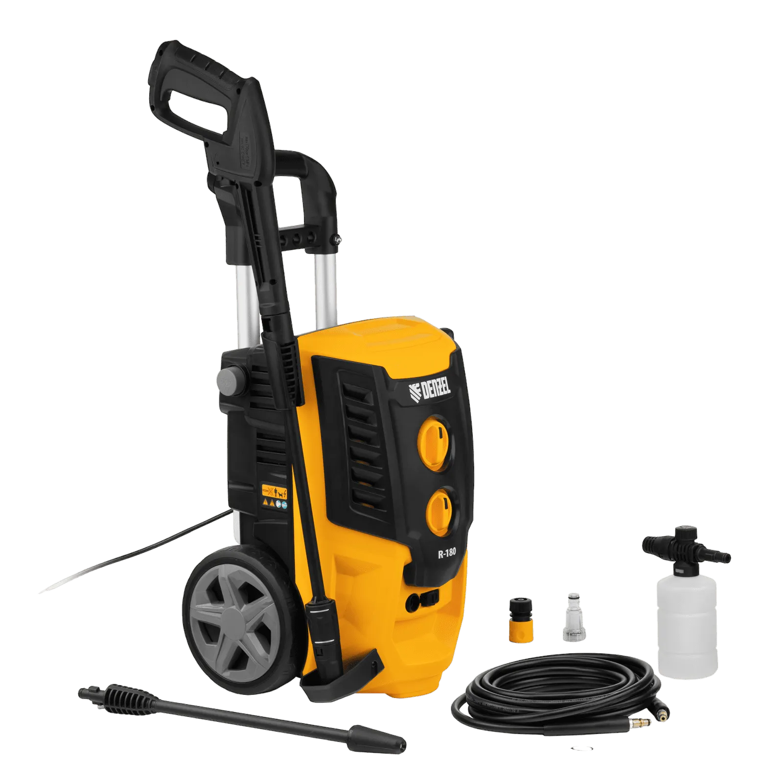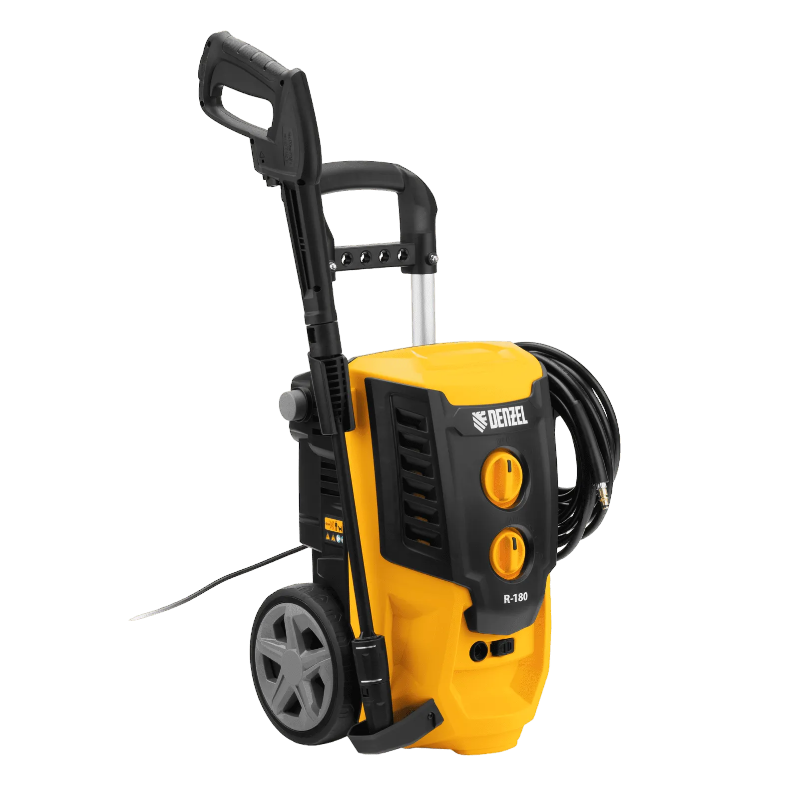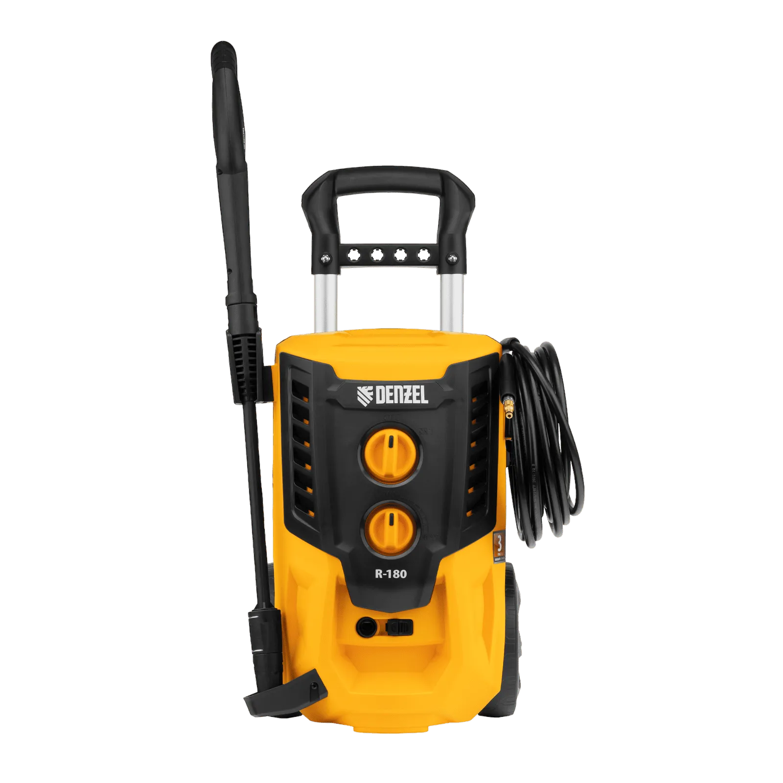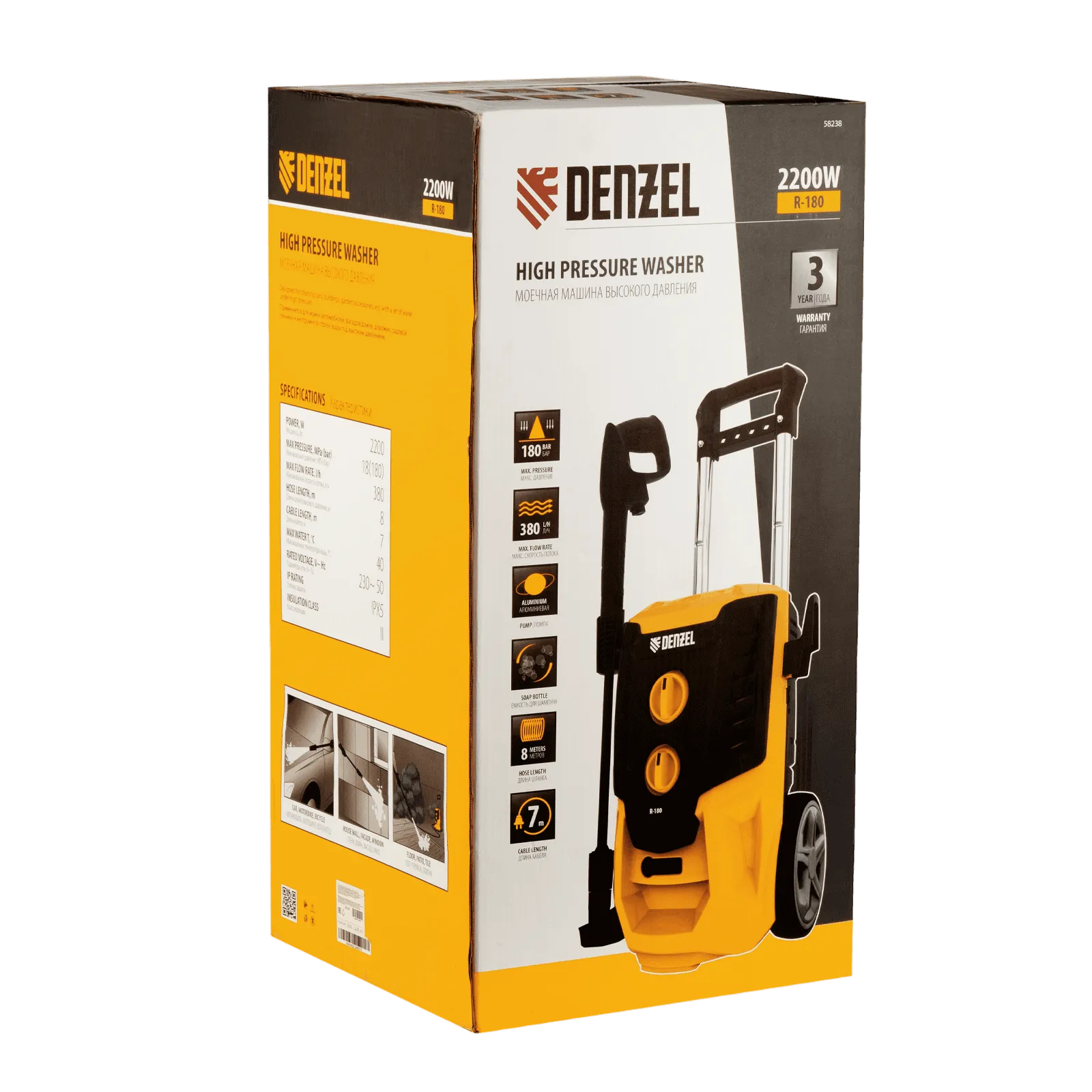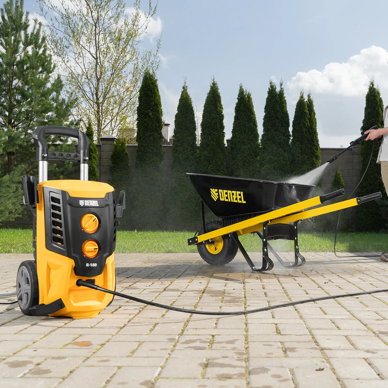 Колесная моечная машина высокого давления Denzel R-180 58238 мощностью 2200 Вт и производительностью 380 л/ч подает струю воды под давлением 180 бар и служит для очищения поверхностей. Позволяет быстро привести в порядок садовые дорожки, удалить пыль и грязь с фасада здания, автомобиля, велосипеда или мотоцикла, отмыть садовый инвентарь. Моечная машина подключается к водопроводу, а при его отсутствии может забирать воду из любого резервуара, работая в режиме самовсасывания. Устройство пригодится для поддержания порядка на загородном участке.