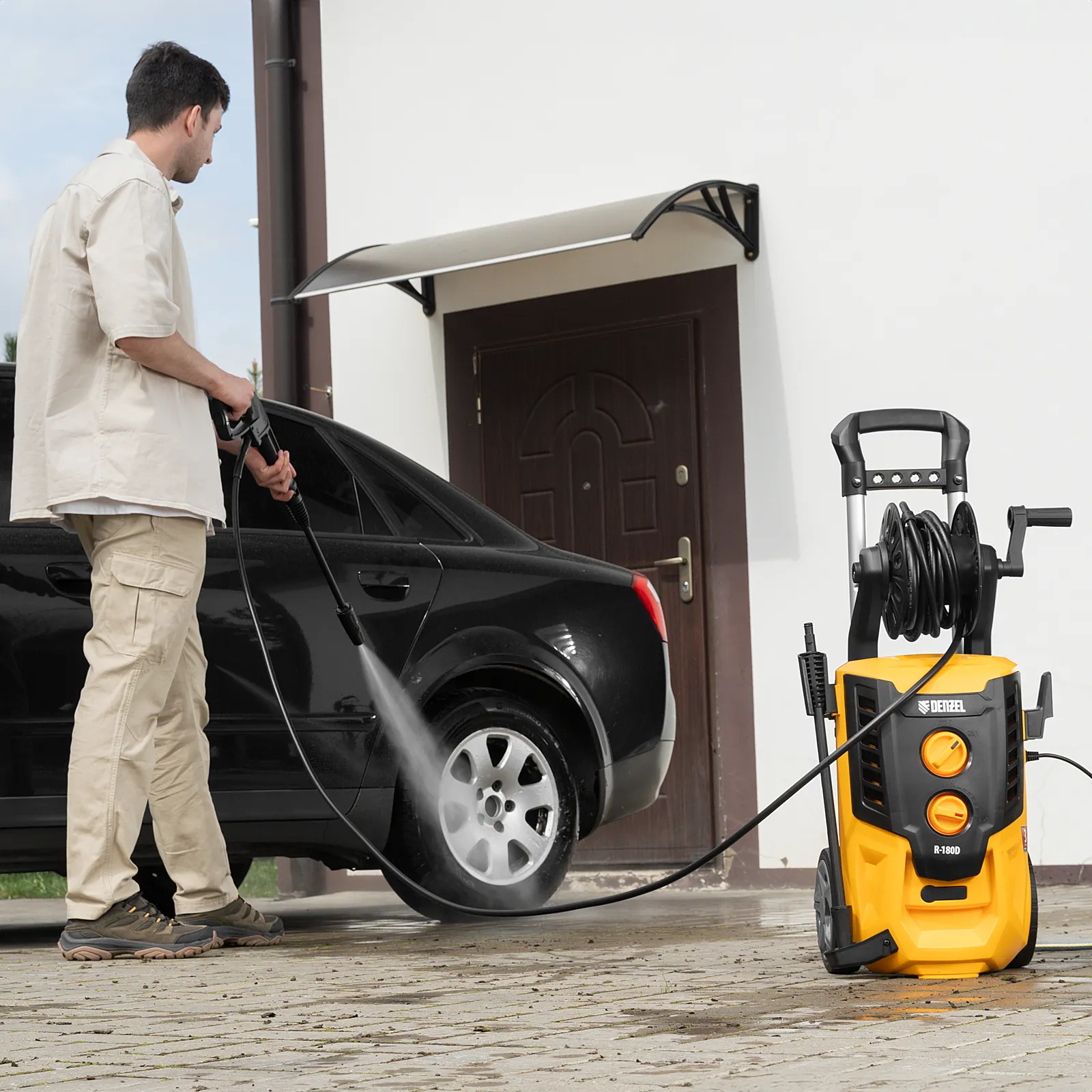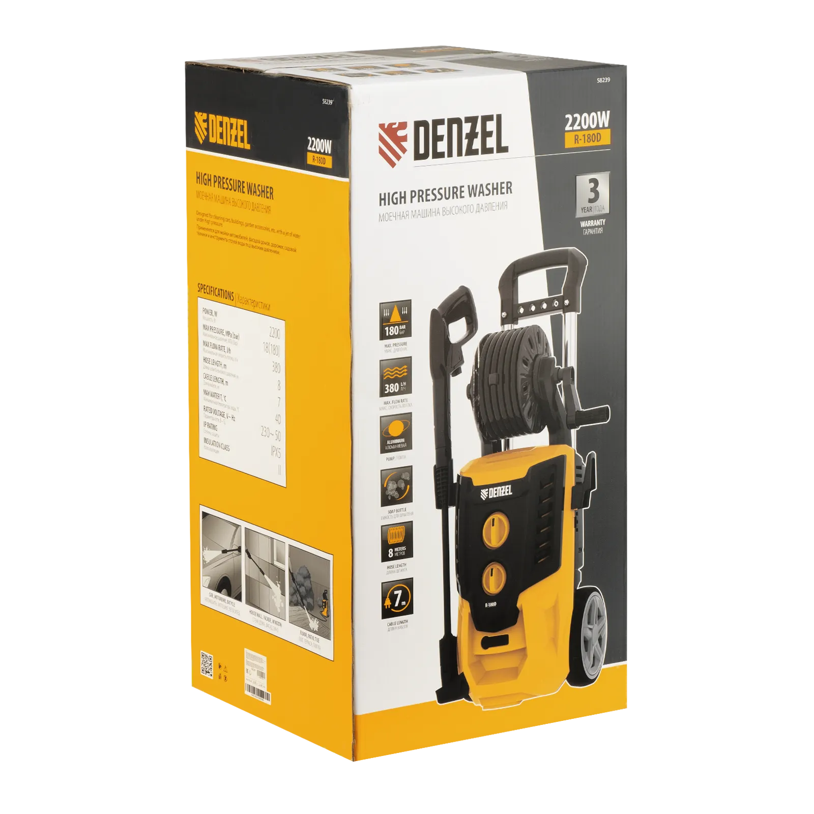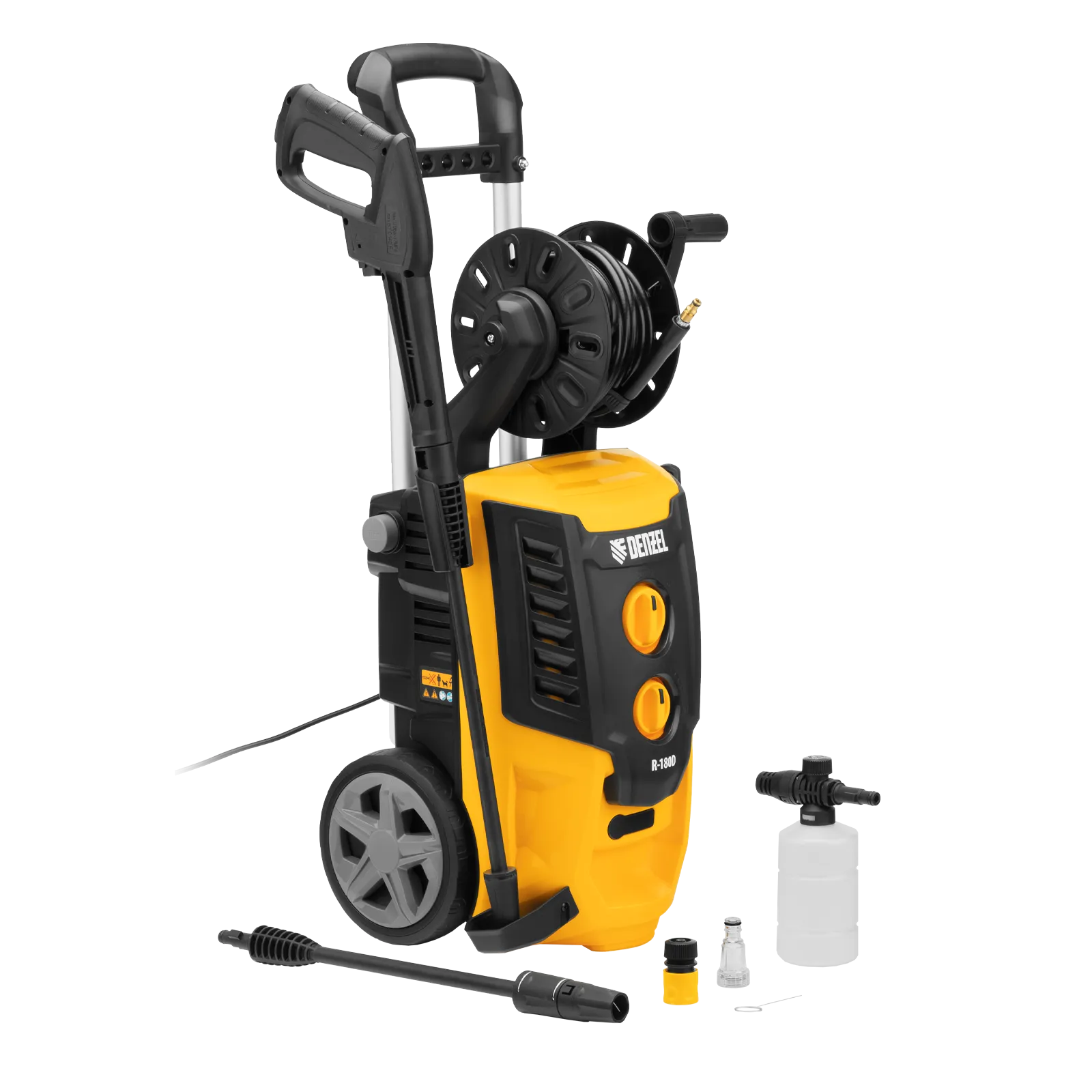 Моечная машина высокого давления Denzel R-180D 58239 с барабаном, мощностью 2200 Вт и производительностью 380 л/ч подает струю воды под давлением 180 бар и используется для очищения поверхностей. Позволяет быстро привести в порядок садовые дорожки, удалить пыль и грязь с фасада здания, автомобиля, велосипеда или мотоцикла, отмыть садовый инвентарь. Моечная машина подключается к водопроводу, а при его отсутствии может забирать воду из любого резервуара, работая в режиме самовсасывания. Устройство пригодится для поддержания порядка на загородном участке.