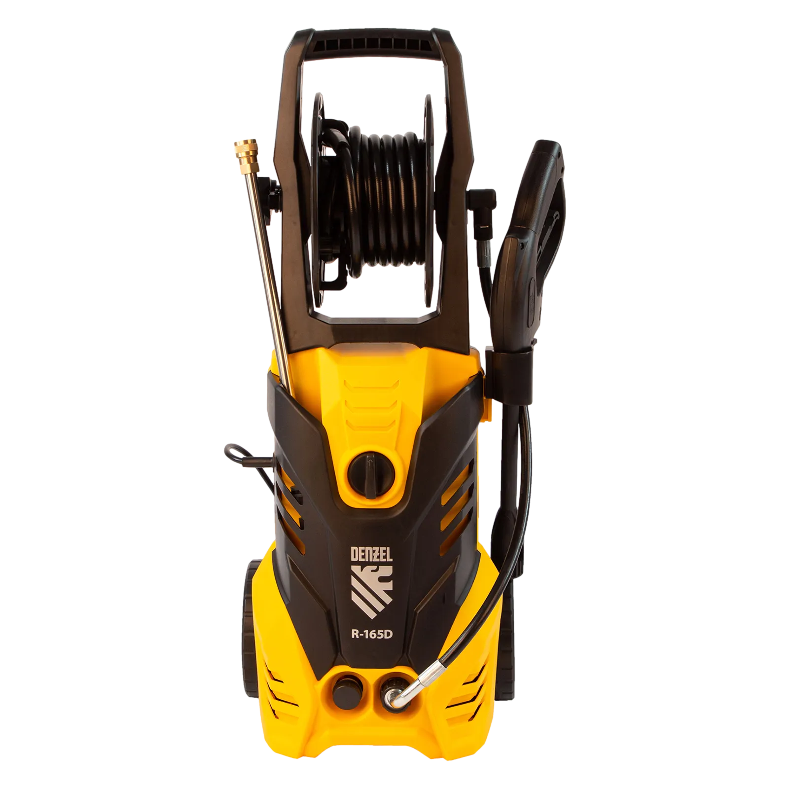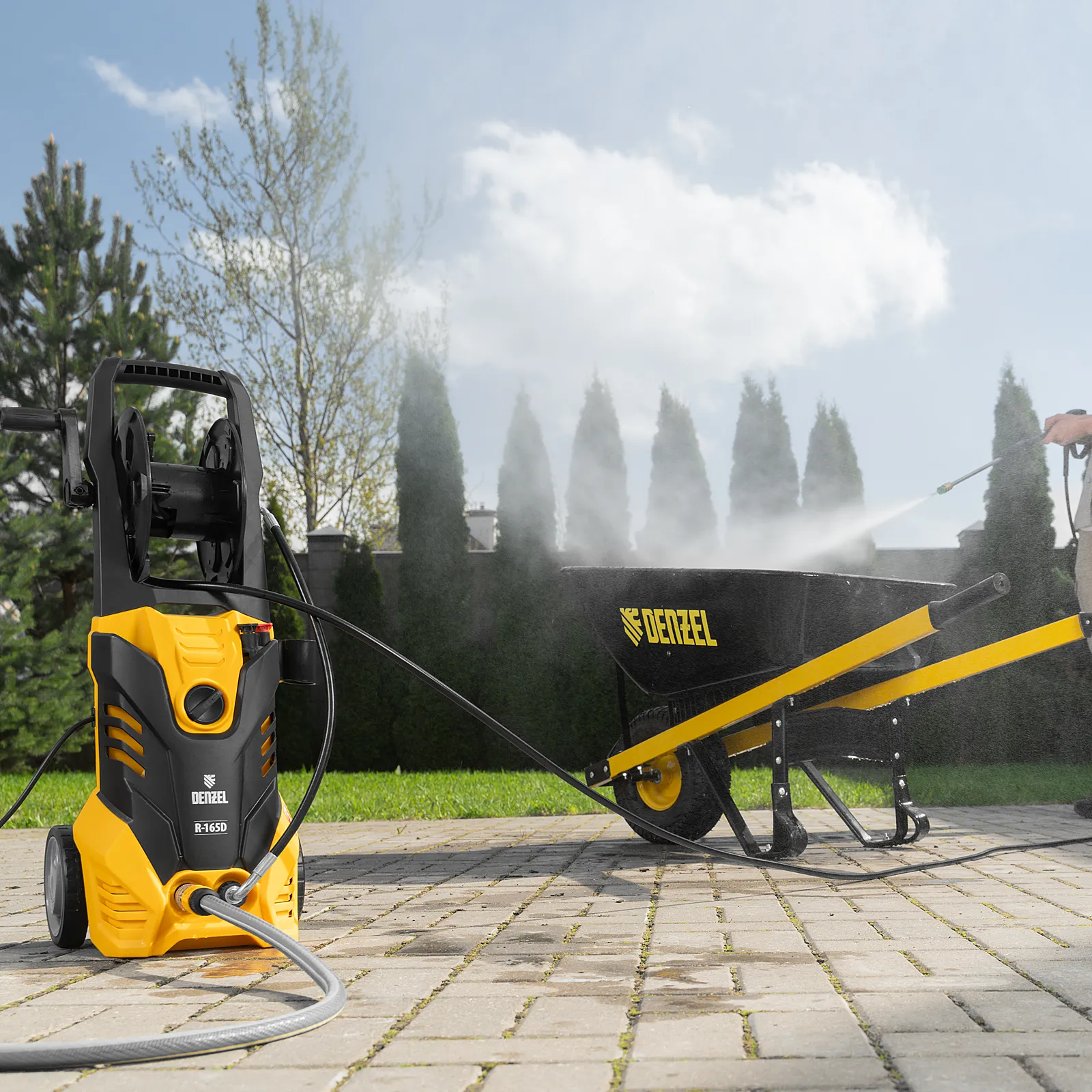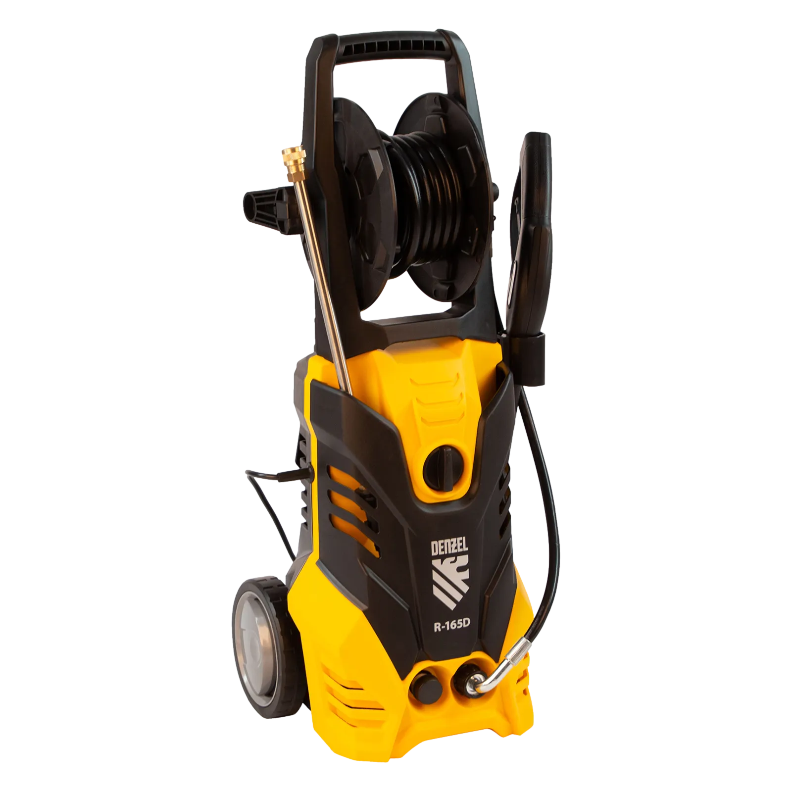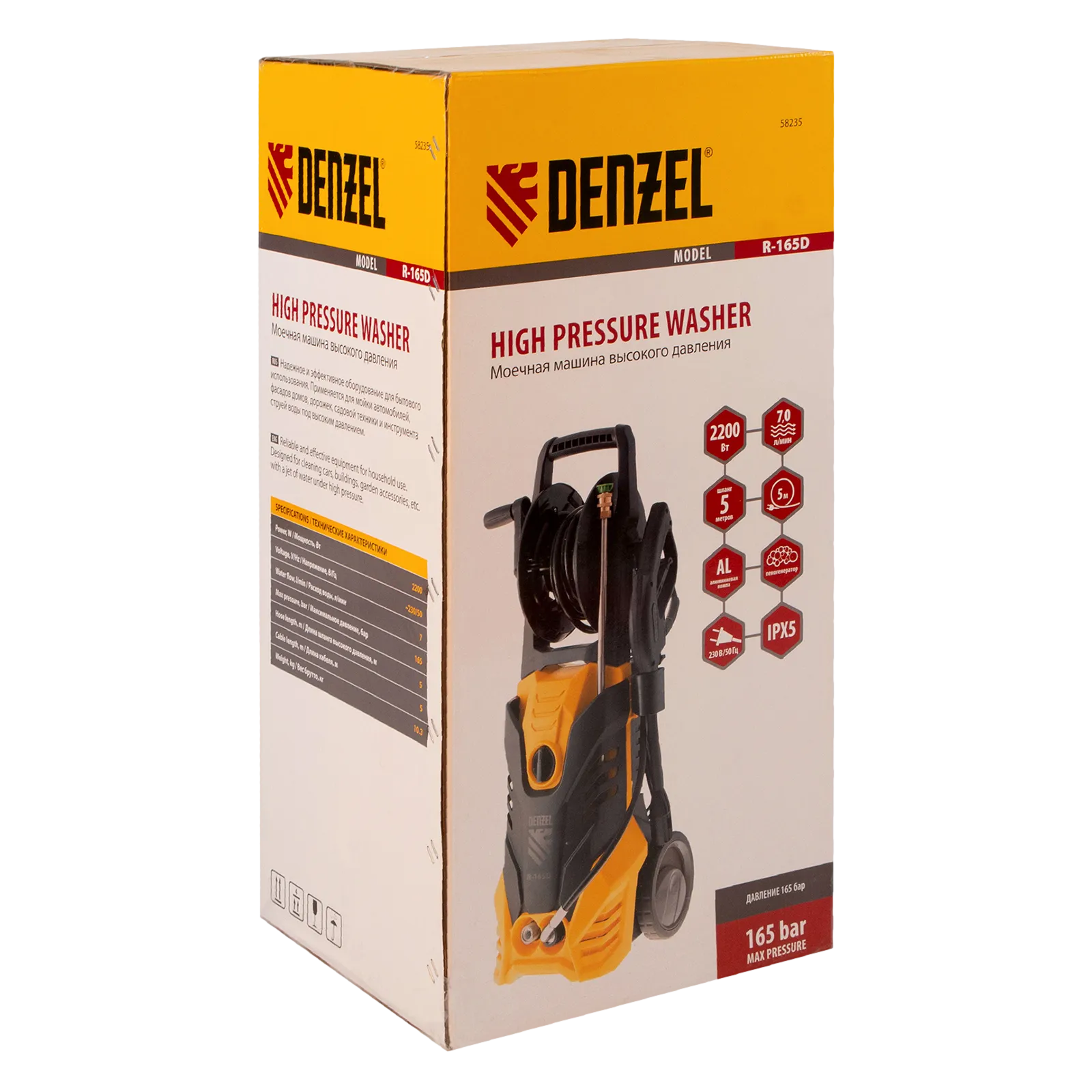 Колесная моечная машина высокого давления Denzel R-165D 58235 производительностью 7 л/мин, мощностью 2200 Вт, с максимальным давлением 165 бар, используется для мытья автомобилей, садового инвентаря, велосипедов, дорожек и заборов. Мощный мотор и помпа высокой производительности позволяют быстро справляться даже с серьезными загрязнениями. Если нет доступа к водопроводу, мойка может осуществлять забор воды из резервуара в режиме самовсасывания, теряя при этом всего 5% давления.