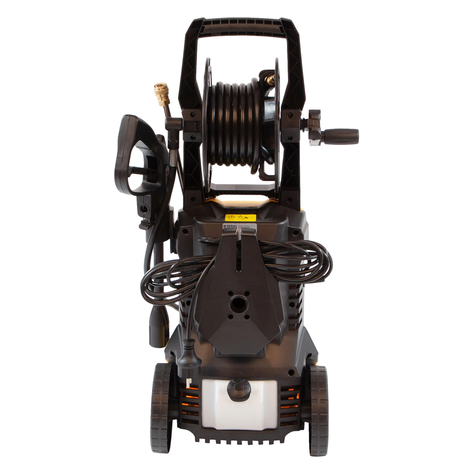 - Удобная транспортировка — мойка оснащена колесами, а на корпусе предусмотрена ручка.
