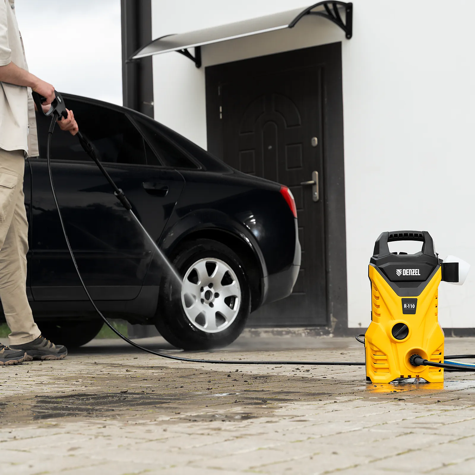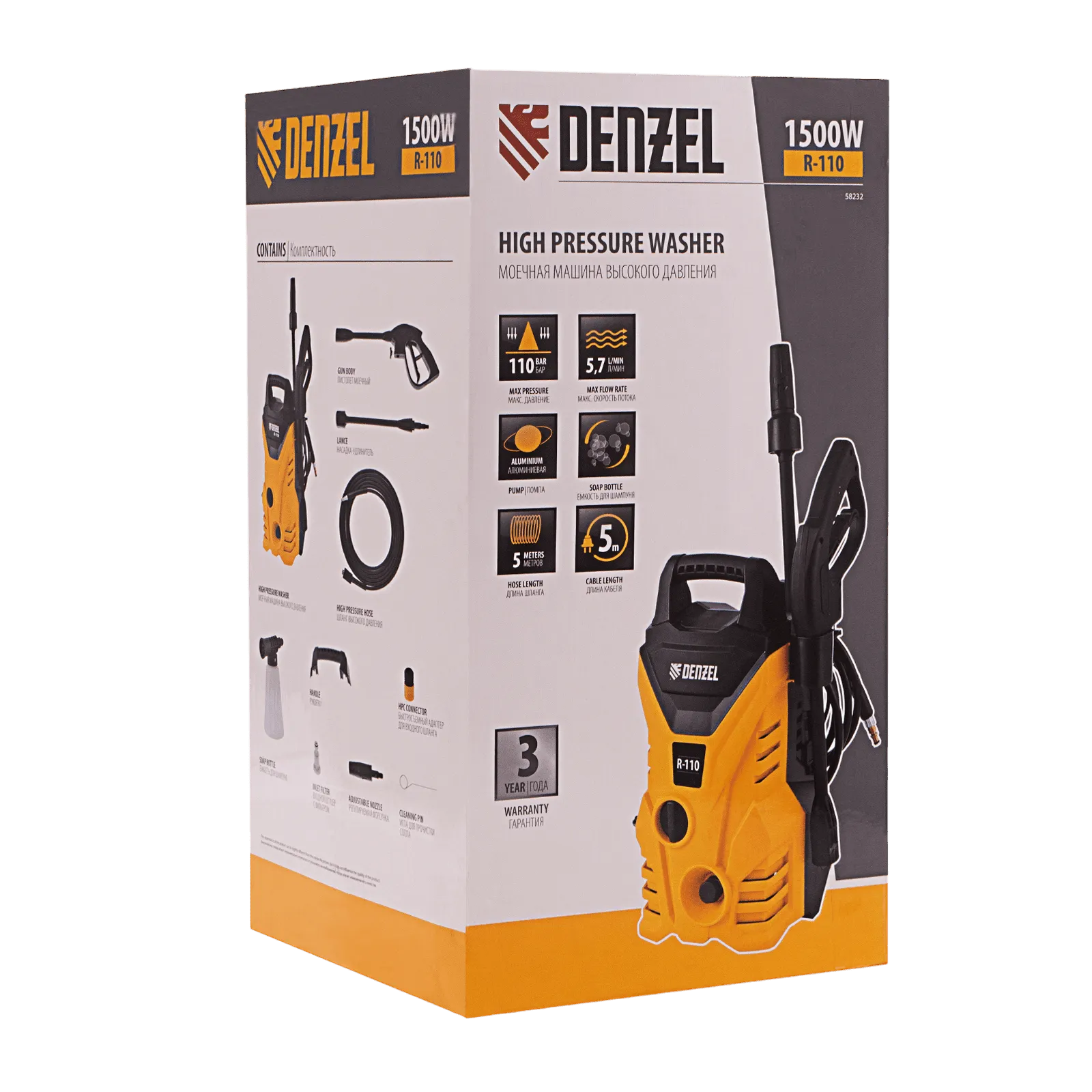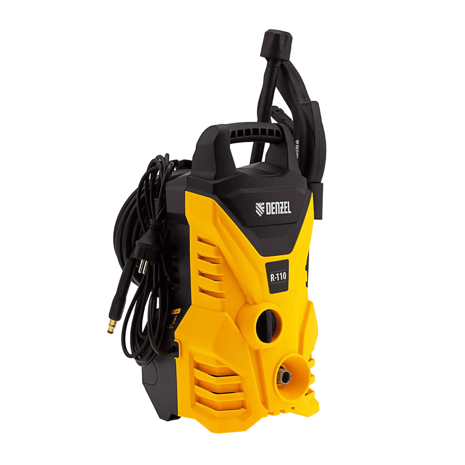 Переносная моечная машина высокого давления Denzel R-110 58232 производительностью 5,7 л/мин, мощностью 1500 Вт, с максимальным давлением 110 бар, используется для мытья автомобилей, садового инвентаря, велосипедов, дорожек и заборов. Мощный мотор и помпа высокой производительности позволяют быстро справляться даже с серьезными загрязнениями. Если нет доступа к водопроводу, мойка может осуществлять забор воды из резервуара в режиме самовсасывания, теряя при этом всего 5% давления.