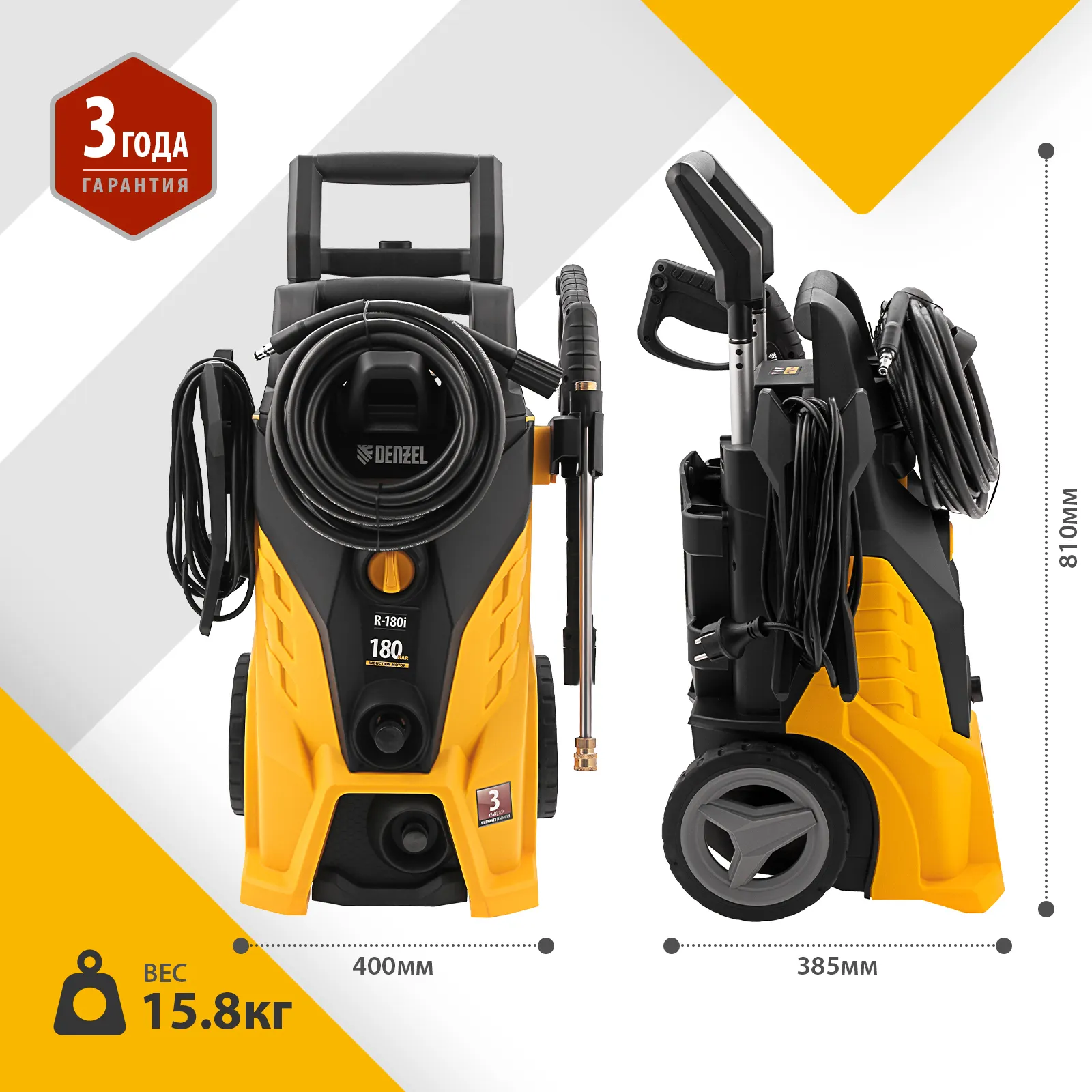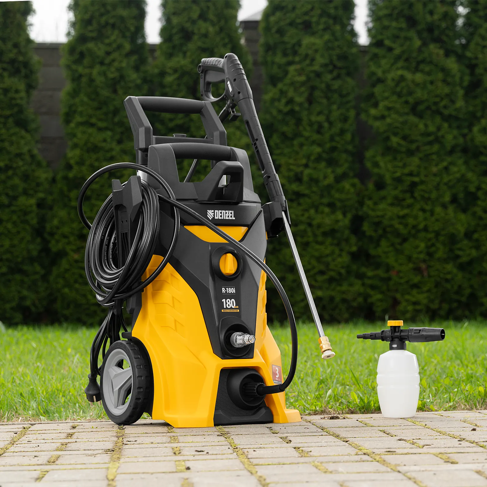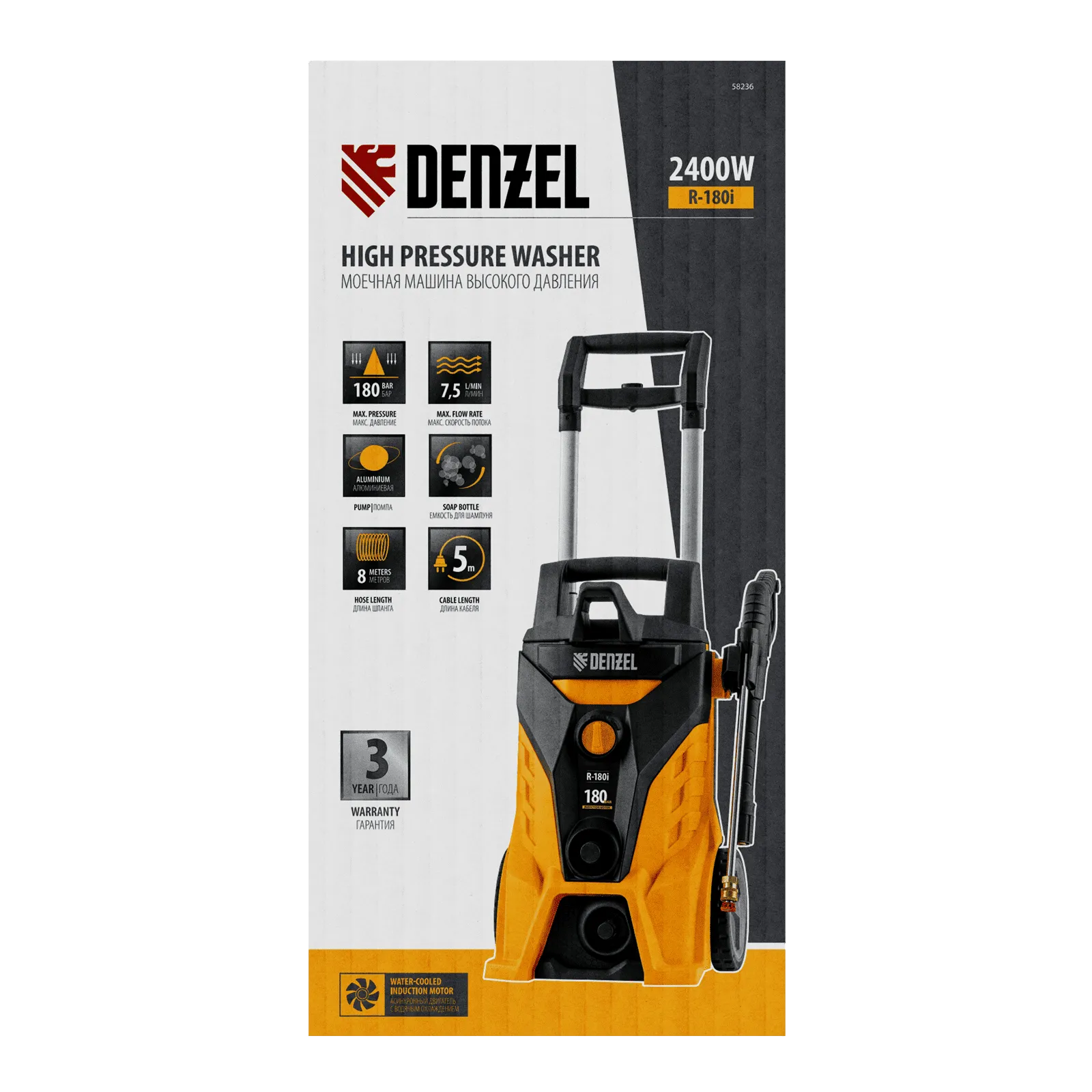 Моечная машина высокого давления Denzel R-180i с асинхронным двигателем оптимально подходит для очищения автомобилей, заборов, дорожек и садового инвентаря. Эффективно справляться с серьезными загрязнениями позволяют мощный мотор 2400 Вт и помпа с производительностью 7,5 л/мин и максимальным давлением 180 бар.;Отсутствие водопровода поблизости не станет проблемой. Мойка с насосом может производить забор воды из любых емкостей благодаря функции самовсасывания, при этом теряя не более 5% давления. Алюминиевая помпа со стальными плунжерами отличается высокой точностью подгонки деталей, что обеспечивает надежность и стабильное давление на выходе.