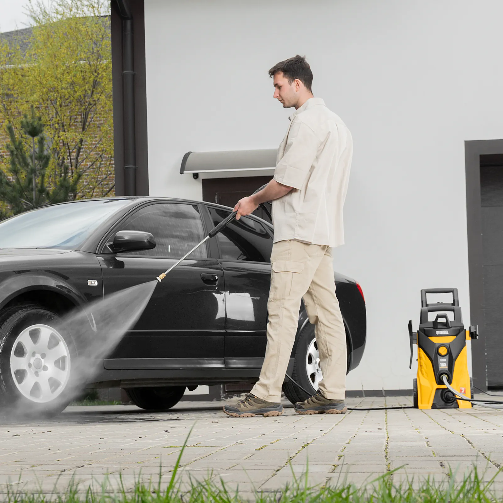 - Защита от случайного пуска — блокировка рычага пистолета позволяет включать автомойку только при полной готовности к работе.