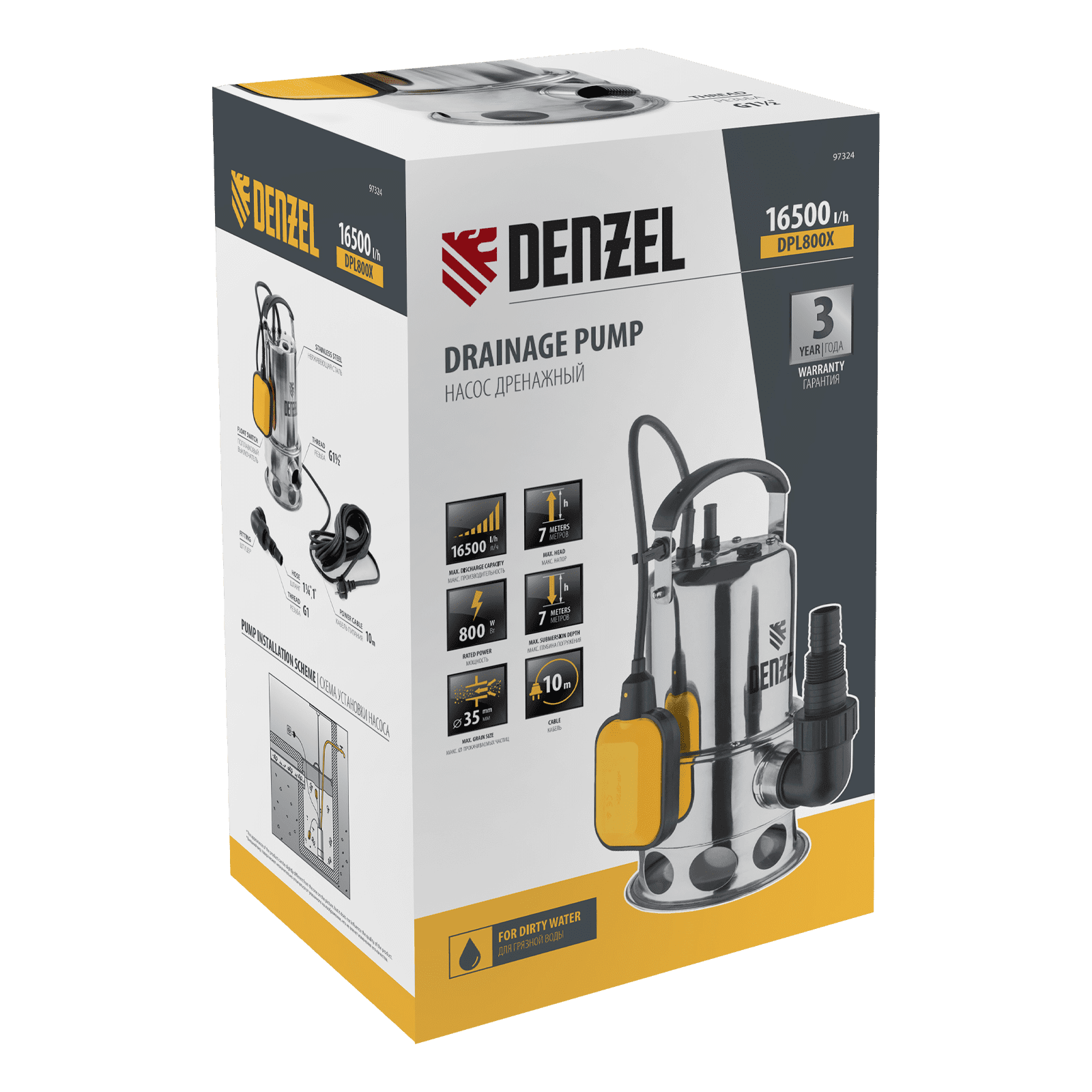 Дренажный насос Denzel DPL800X 97324 мощностью 800 Вт и производительностью 16500 л/ч обеспечивает подъем грязной воды на высоту до 7 м и используется для откачивания сточных вод из затопленных подвальных помещений. Максимальная глубина погружения составляет 7 м. Насос подходит для воды, содержащей твердые и мягкие включения диаметром до 35 мм. Также может использоваться для подачи воды из колодца или открытого водоема с целью орошения сада или огорода.