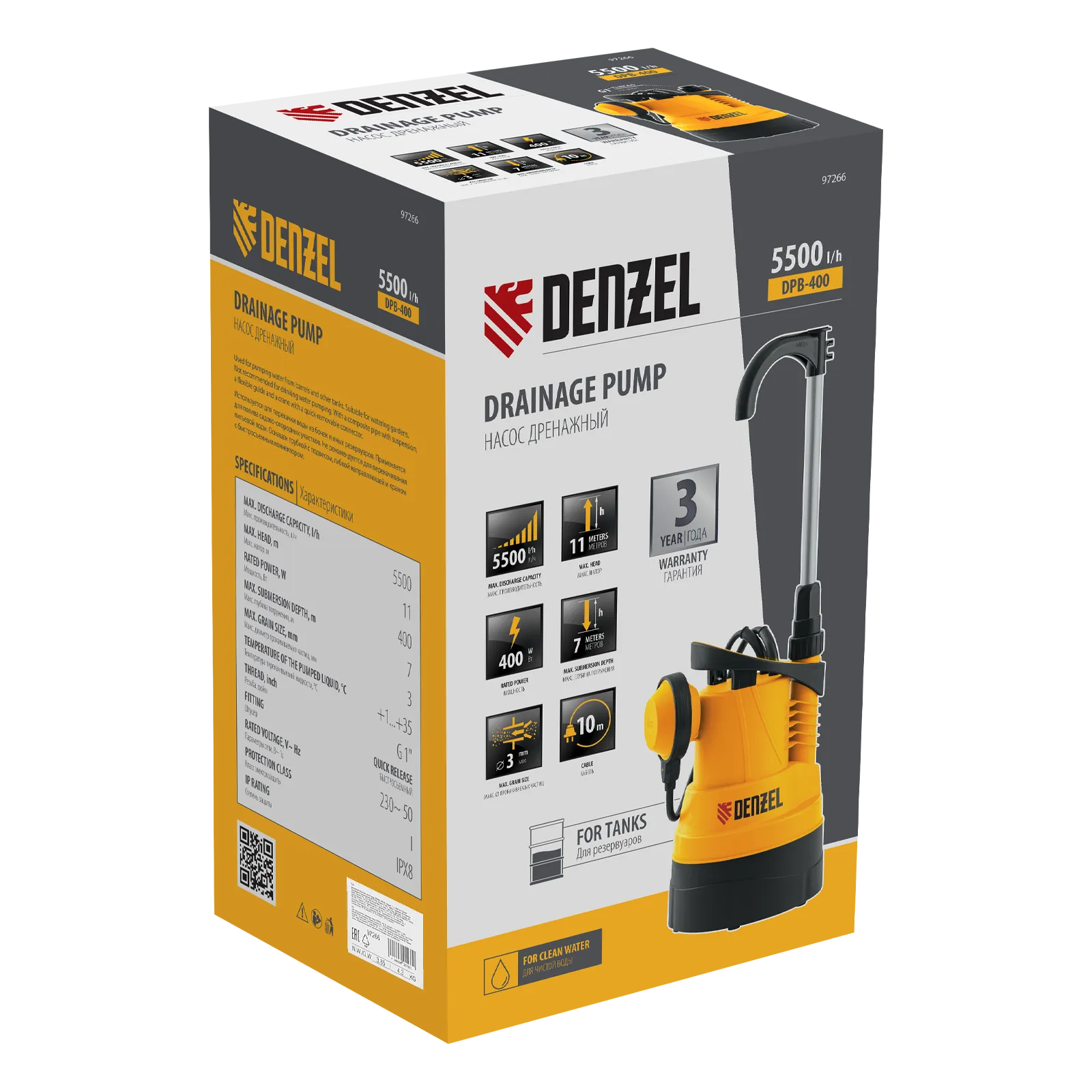 Дренажный насос для чистой воды Denzel 97266 мощностью 400 Вт работает со скоростью 5500 л/ч и обеспечивает подъем перекачиваемой жидкости на высоту до 11 м. Погружается на глубину до 7 м, применяется для организации систем полива и водоснабжения на приусадебном участке, подходит также для выполнения осушительных работ. Забор воды происходит из колодцев, водоемов, бассейнов, различных резервуаров, бочек и других накопителей. Максимальный диаметр перекачиваемых частиц составляет 3 мм.