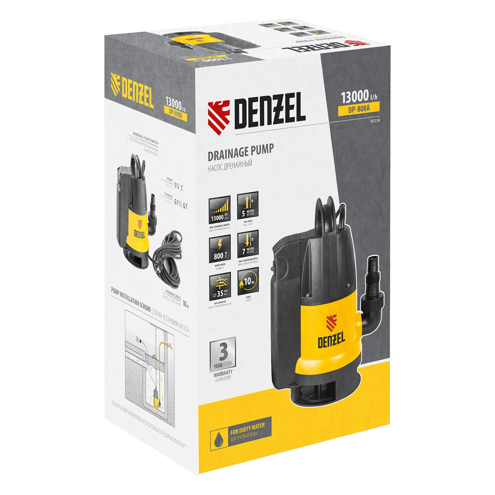 Дренажный насос Denzel DP800A 97219 мощностью 800 Вт и производительностью 13000 л/ч обеспечивает высоту подъема 5 м и подходит для откачки грязной воды с включениями диаметром до 35 мм из резервуаров, подвалов, погребов, канав. Используется также для подачи чистой воды из колодцев и организации систем полива.