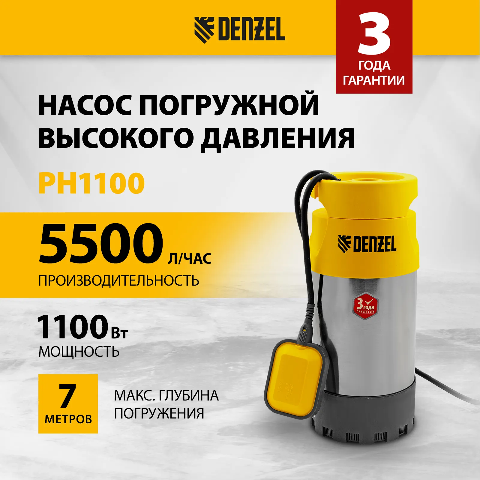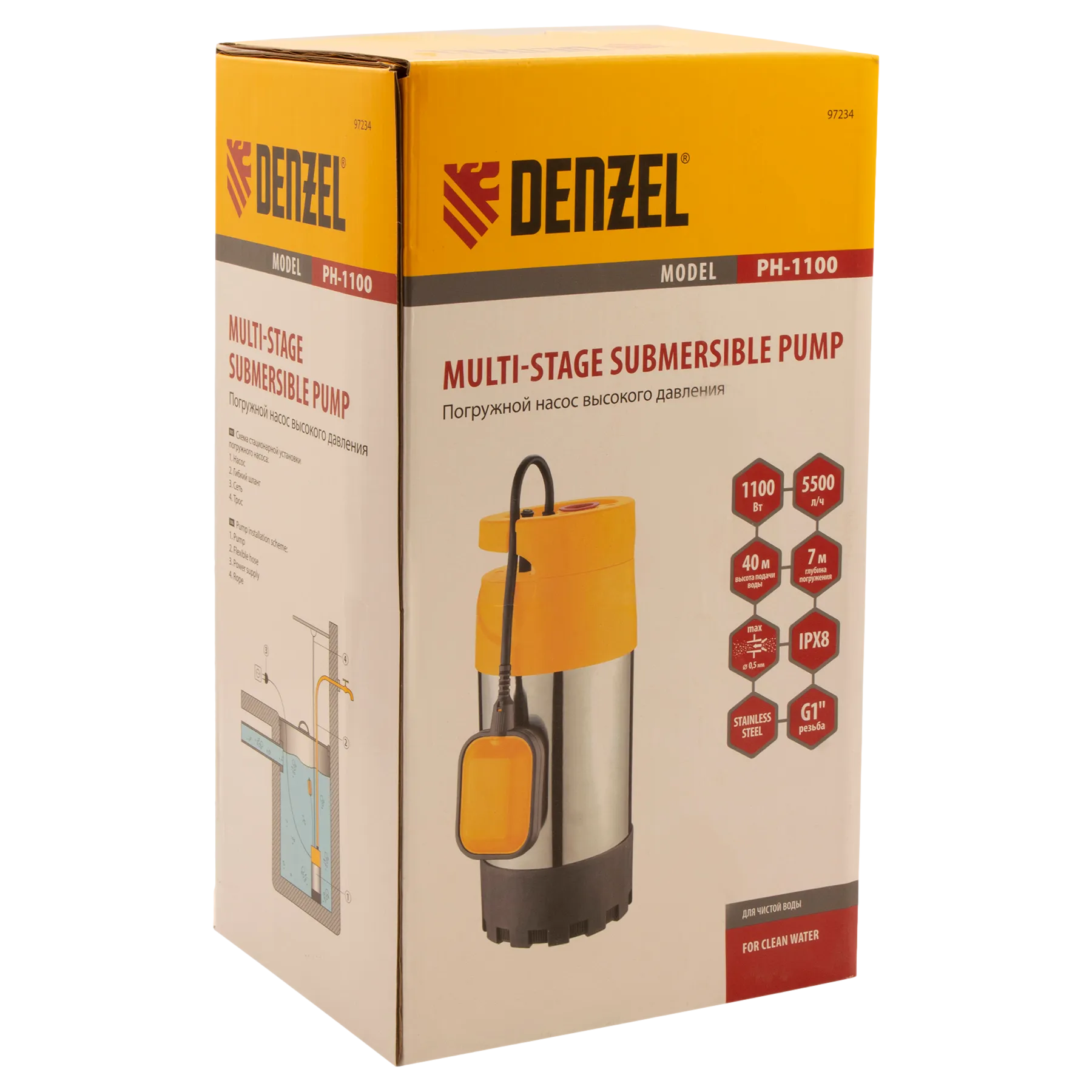 Погружной насос Denzel PH1100 97234 мощностью 1100 Вт и производительностью 5500 л/ч создает напор до 40 м и используется для подачи чистой воды под давлением до 4 бар из резервуара, водоема и колодца, даже если он находится далеко от участка. Позволяет организовать систему орошения и водоснабжения на даче. Скорости работы до 91 л/мин и напора до 40 м достаточно для подачи воды на верхние этажи в несколько точек водоразбора.