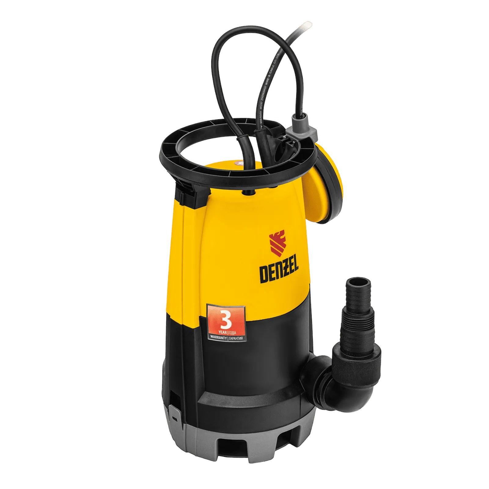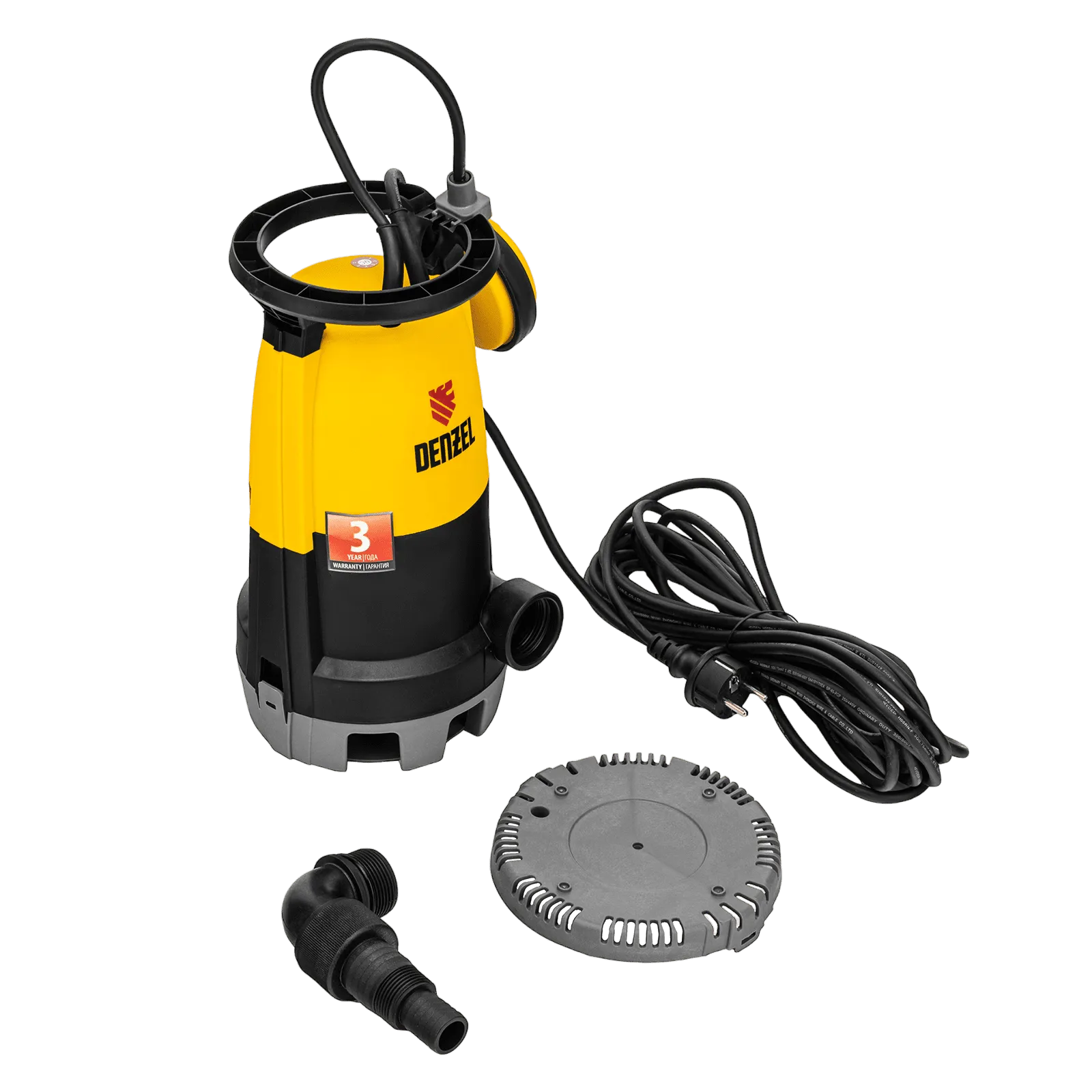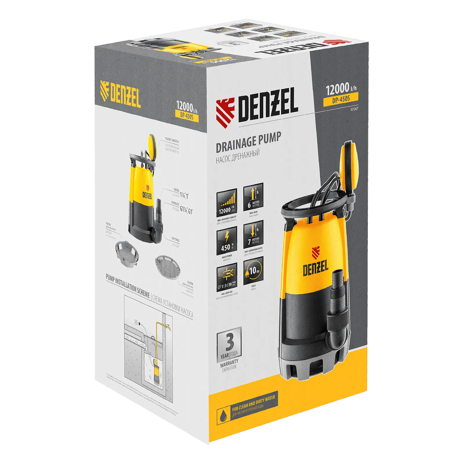 Дренажный насос Denzel DP-450S 97267 мощностью 450 Вт и производительностью 12000 л/ч обеспечивает напор 6 м и эффективно справляется с выкачиванием из затопленных помещений грязной воды с фракциями диаметром до 30 мм. Также используется для подачи чистой воды из колодцев и водоемов или организации системы полива. Благодаря небольшим габаритам подходит для установки в узких колодцах.