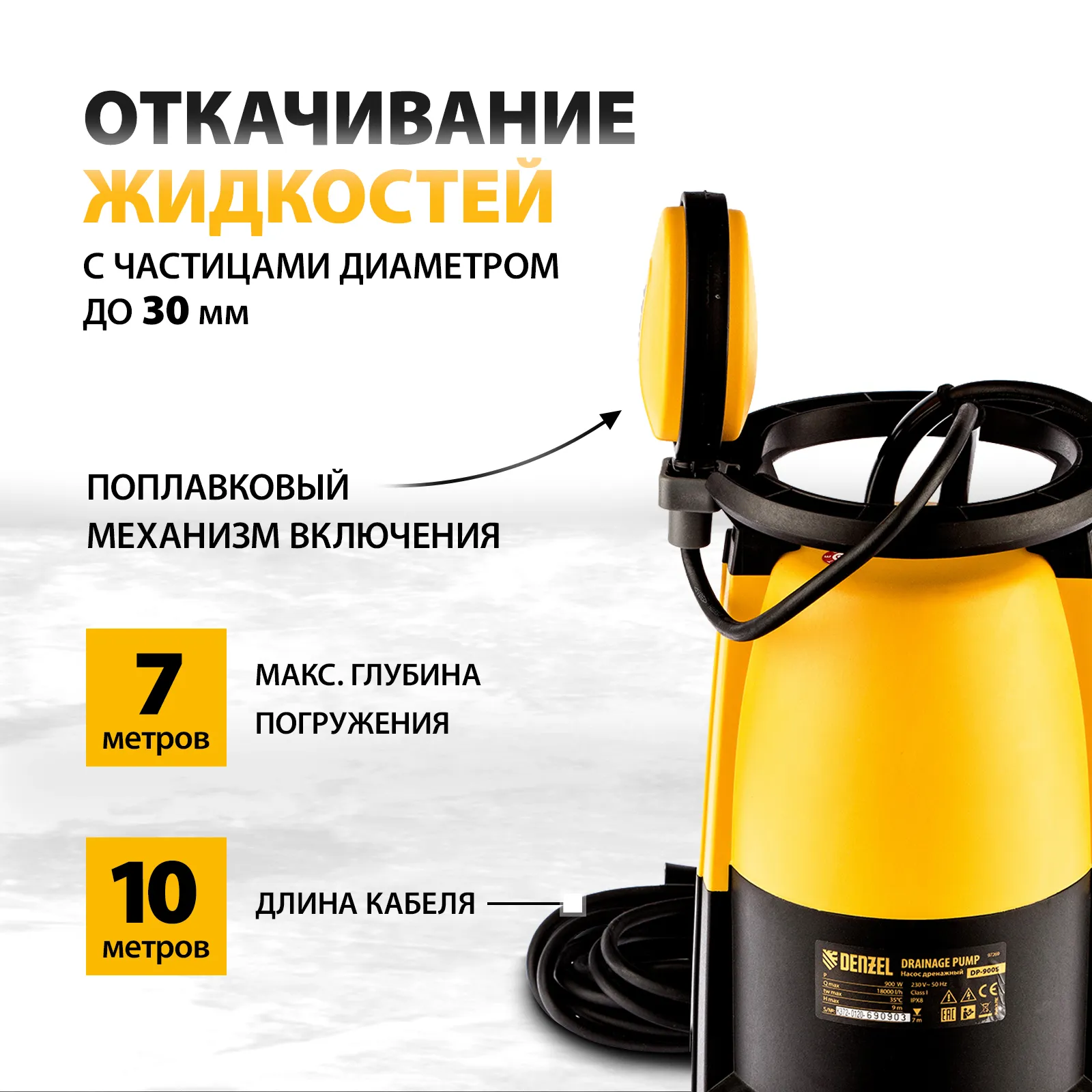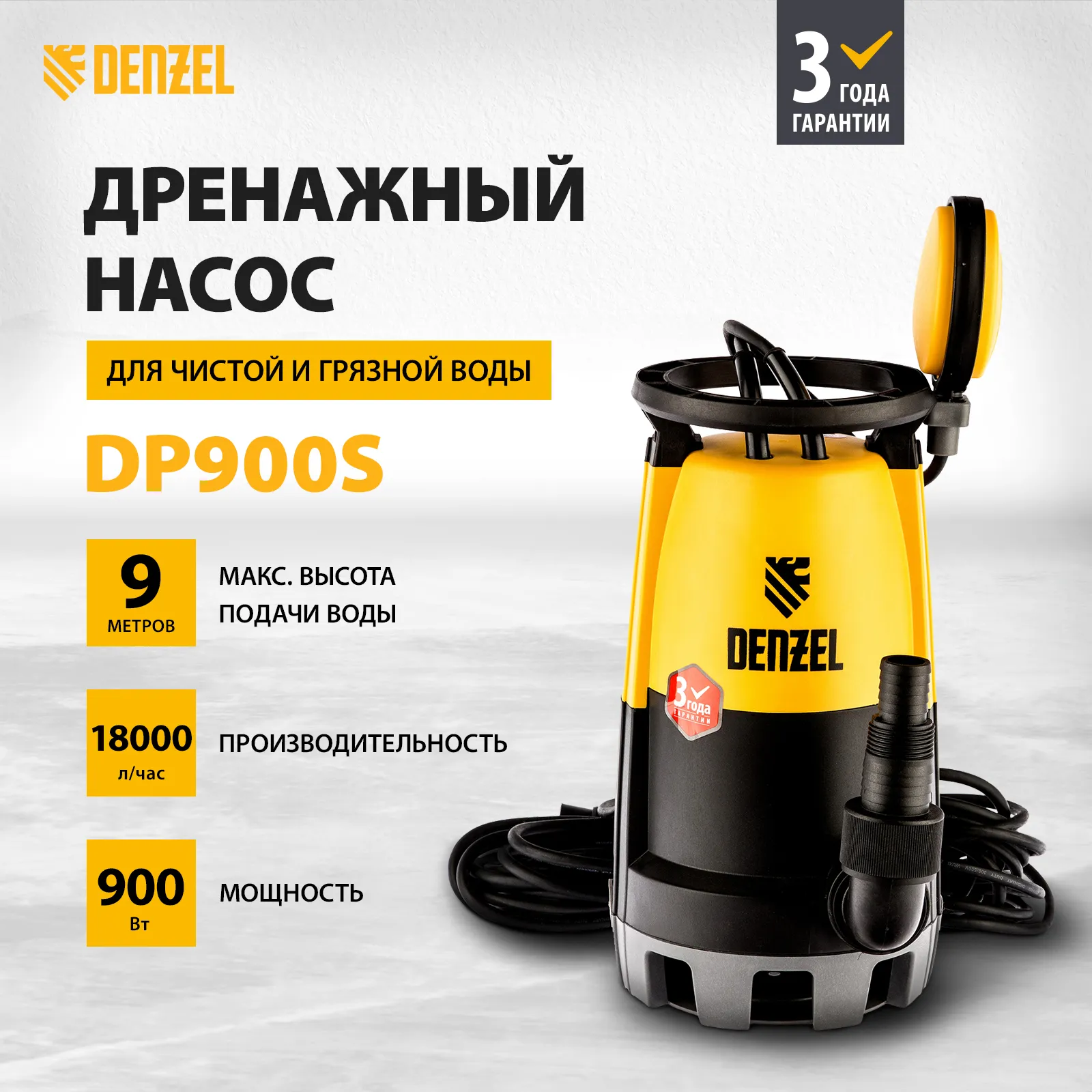 Дренажный насос Denzel DP-900S 97269 мощностью 900 Вт и производительностью 18000 л/ч обеспечивает напор 9 м и эффективно справляется с выкачиванием из затопленных помещений грязной воды с фракциями диаметром до 30 мм. Также используется для подачи чистой воды из колодцев и водоемов или организации системы полива сада и огорода. Благодаря небольшим габаритам подходит для установки в узких колодцах.