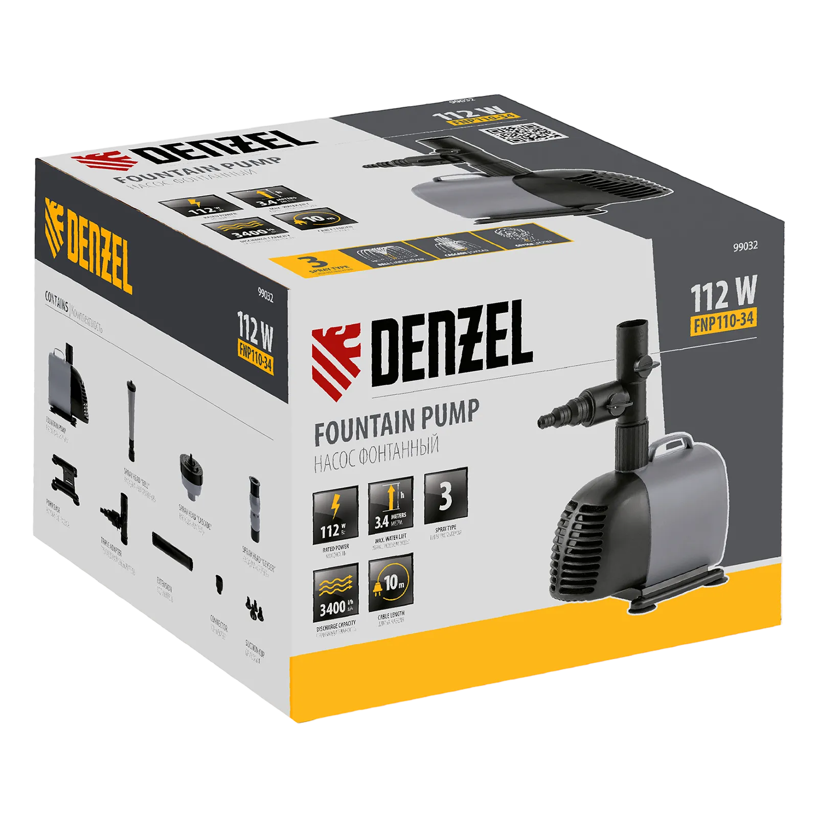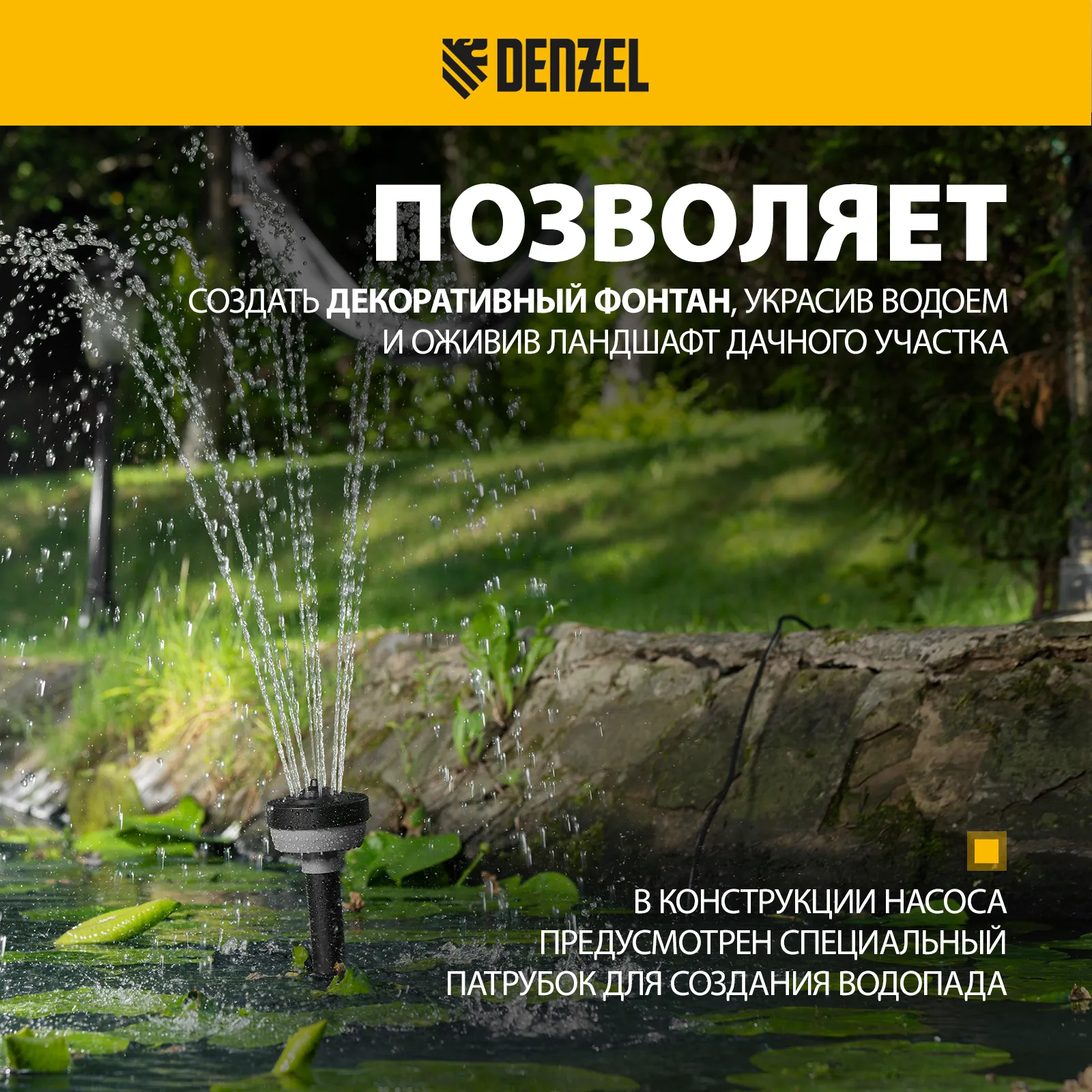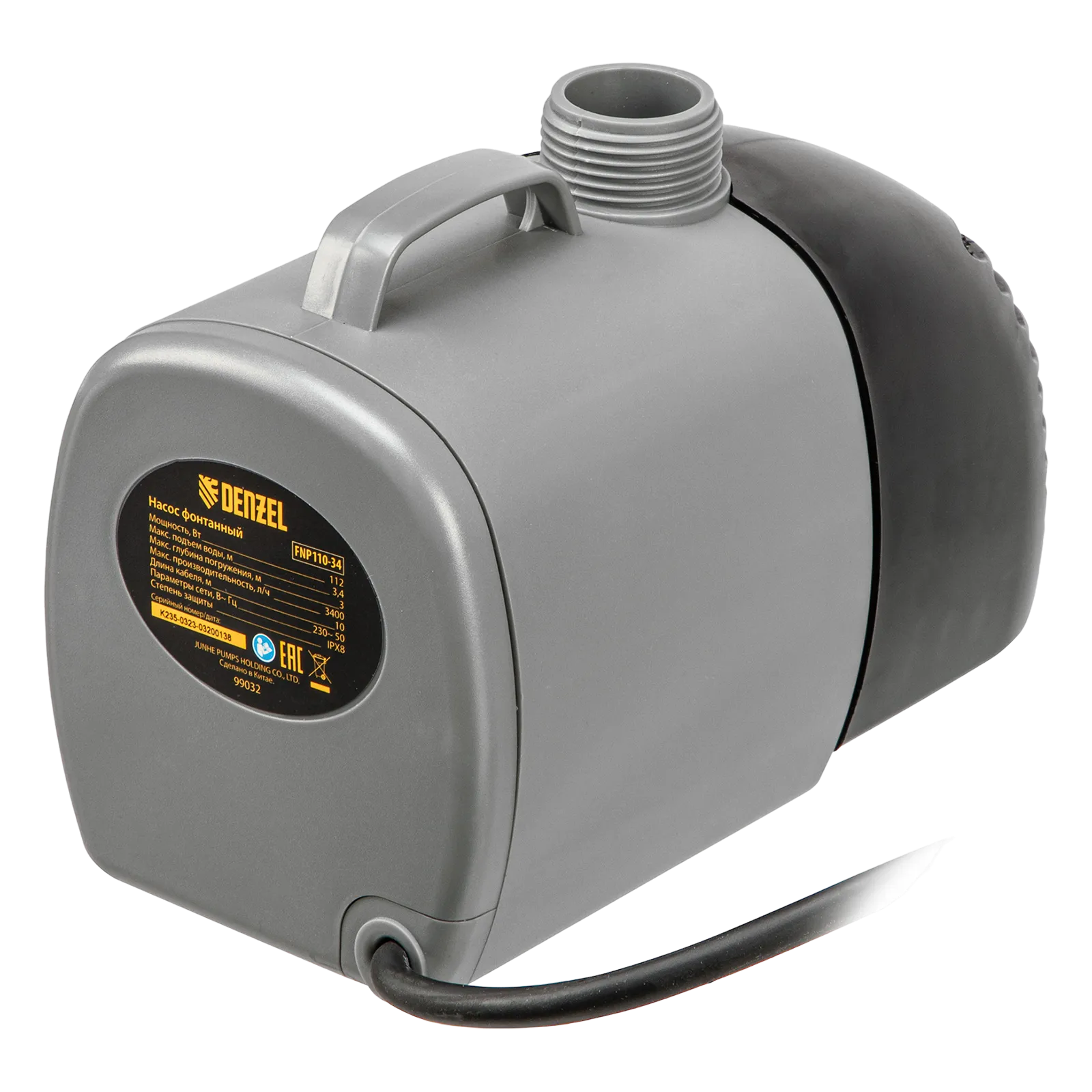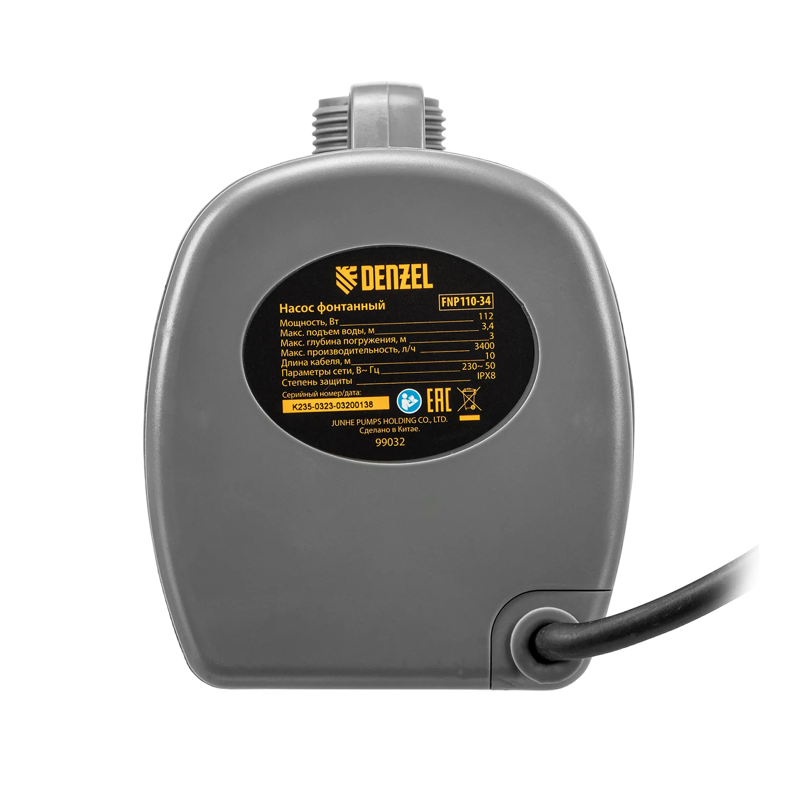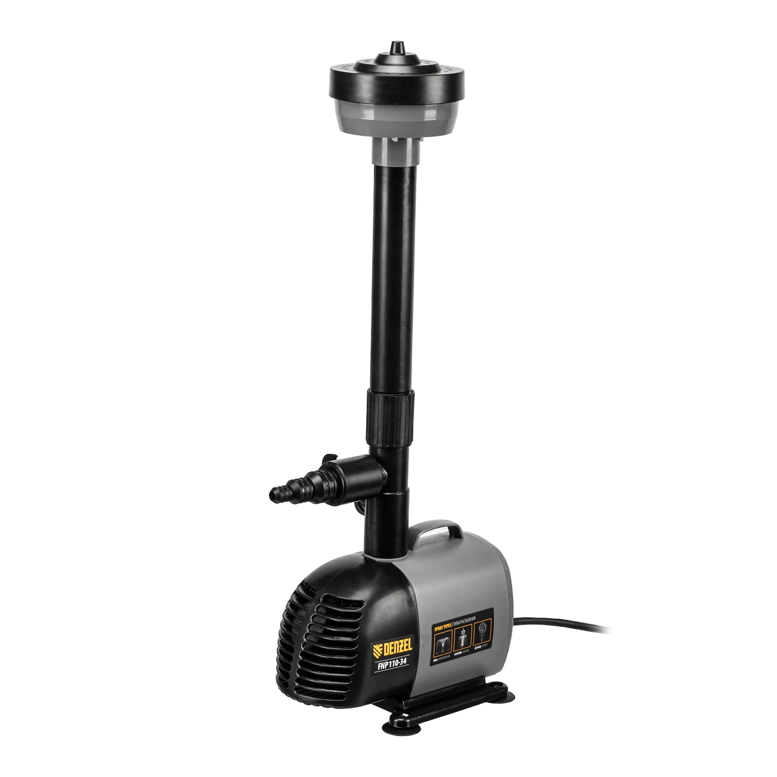 Фонтанный насос Denzel FNP110-34 99032 мощностью 112 Вт, с насадками колокольчик/каскад/гейзер, перекачивает 3400 л воды в час и обеспечивает максимальную высоту подъема 3,4 м. Позволяет создать декоративный фонтан, украсив водоем и оживив ландшафт дачного участка. Установив одну из входящих в комплект насадок, можно получить наиболее подходящий тип струи: в виде колокольчика, каскада или гейзера. Также в конструкции насоса предусмотрен специальный патрубок для создания водопада.