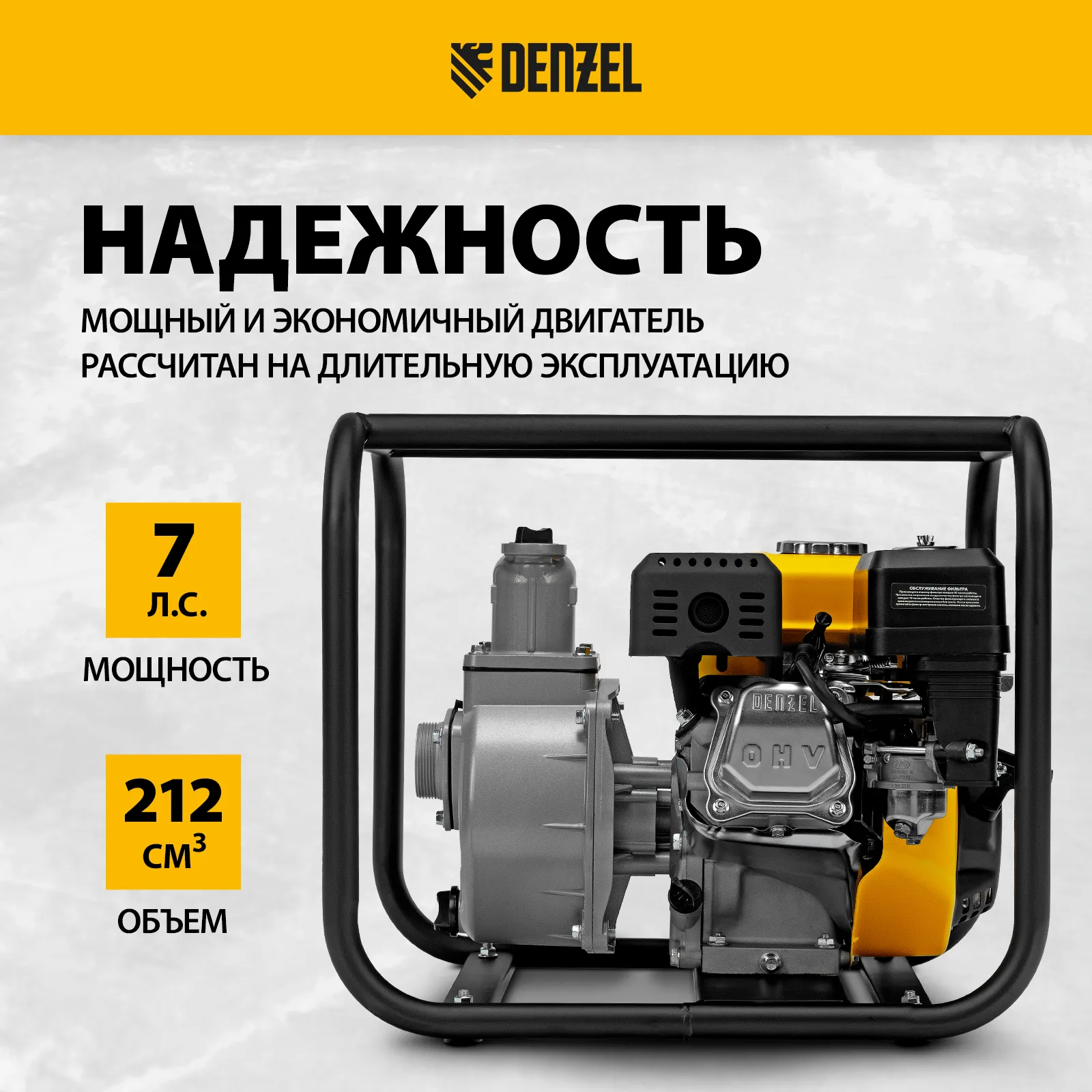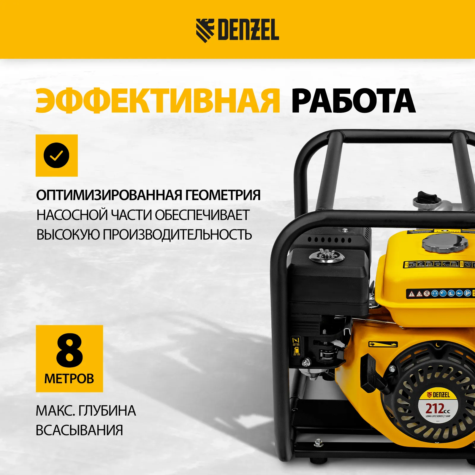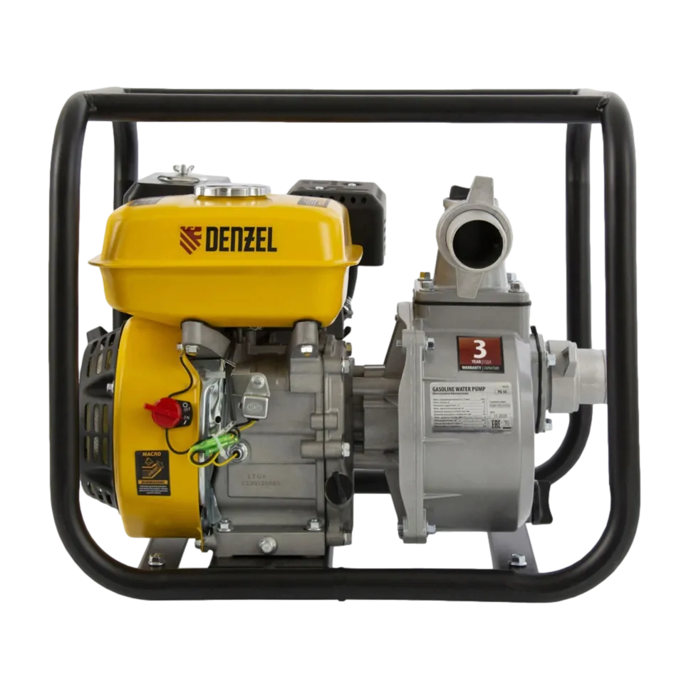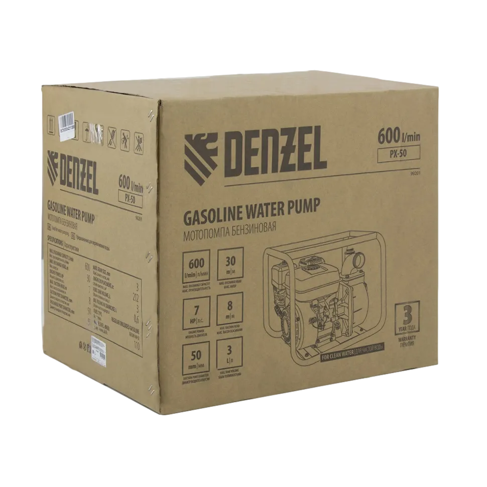 Бензиновая мотопомпа для чистой воды Denzel PX-50 99201 производительностью 600 л/мин, с двигателем мощностью 7 л. с. и штуцерами диаметром 2 дюйма, обеспечивает напор до 30 м и глубину всасывания до 8 м. Применяется для откачивания воды из бассейнов, водоемов, затопленных подвалов и складских помещений. Подходит для подачи воды на участок или в систему полива, может использоваться для проведения коммунальных, промышленных и строительных работ. Объем бака составляет 3 л, а расход топлива — 1,8 л/ч, поэтому мотопомпа способна проработать более чем 1,5 ч на полной мощности без дозаправки.