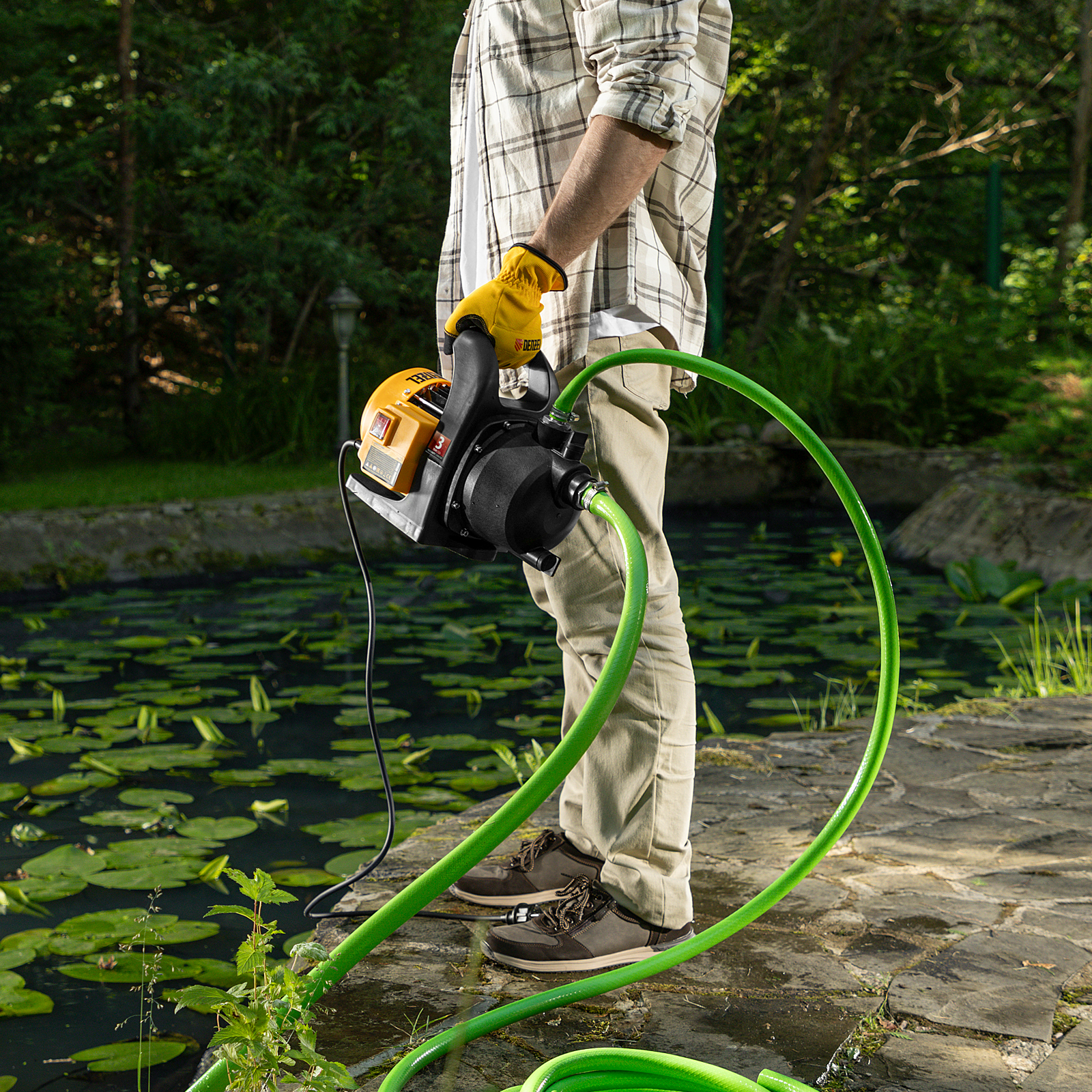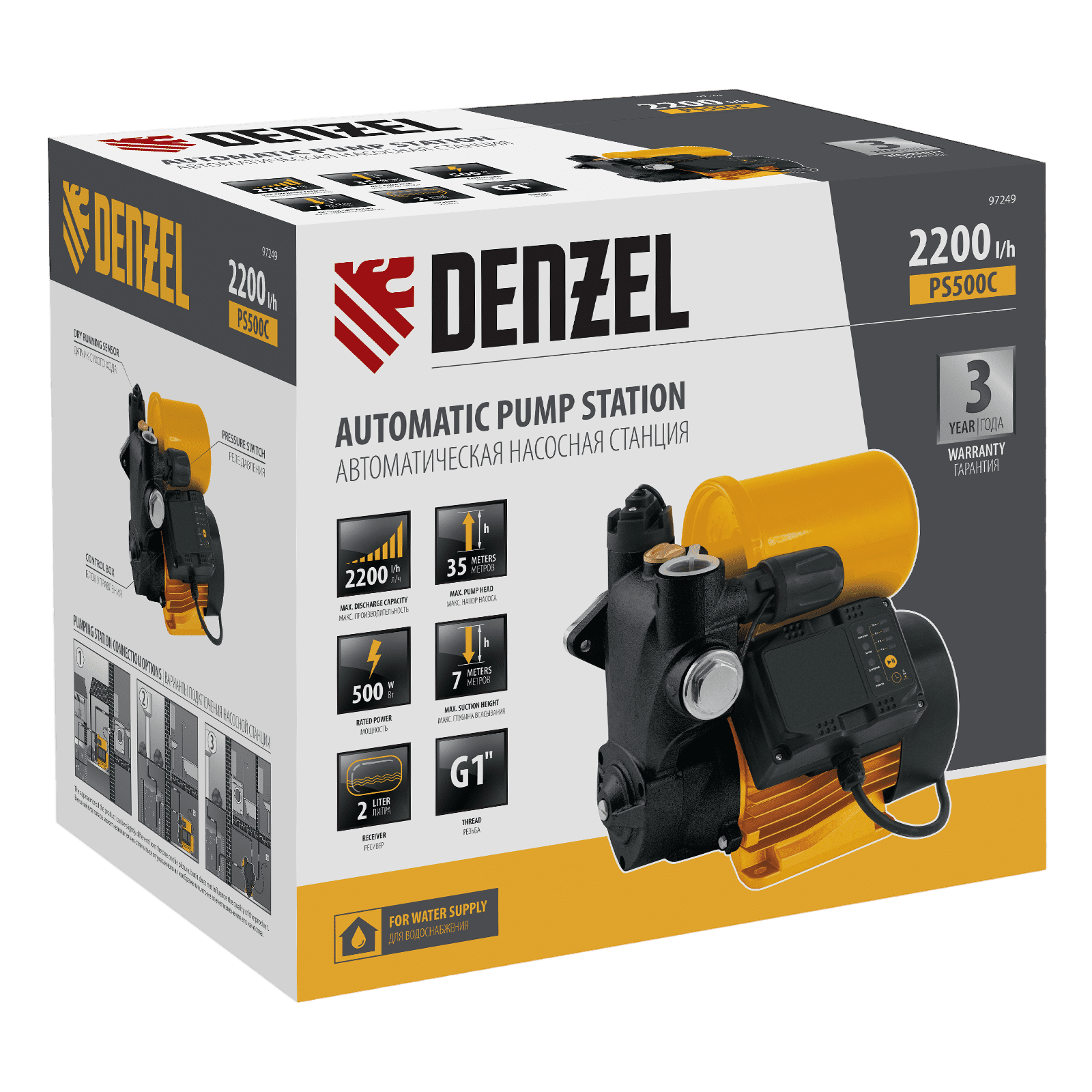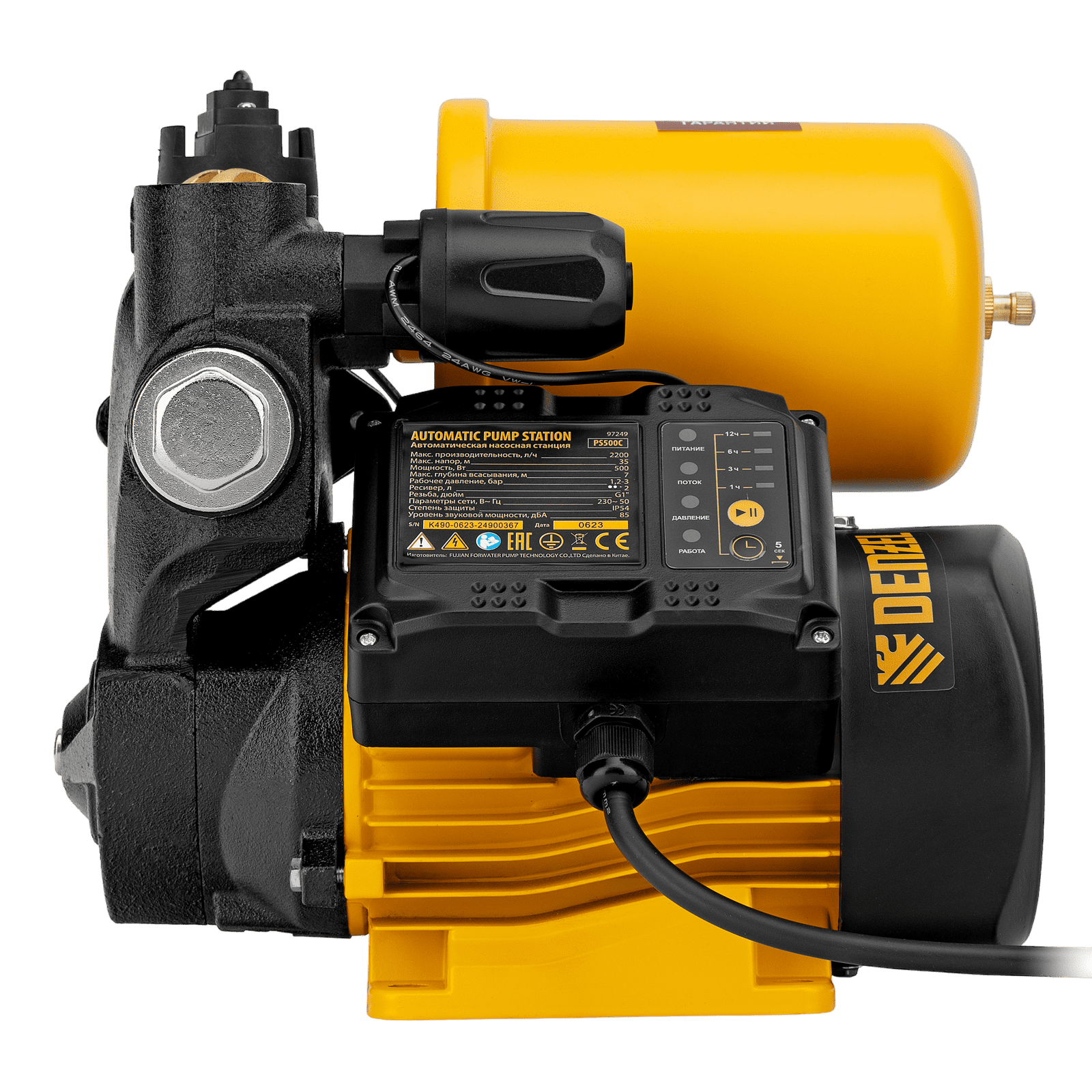 Насосная станция Denzel PS500C 97249 мощностью 500 Вт, с блоком управления и ресивером объемом 2 л, способна перекачивать 2200 л чистой воды в час и обеспечивает напор до 35 м. Возможен забор воды с глубины до 7 м из колодцев, скважин и других источников. Надежный асинхронный двигатель позволяет поддерживать стабильное давление в напорной магистрали в течение длительного времени. Станция позволяет организовать систему бытового водоснабжения на даче.