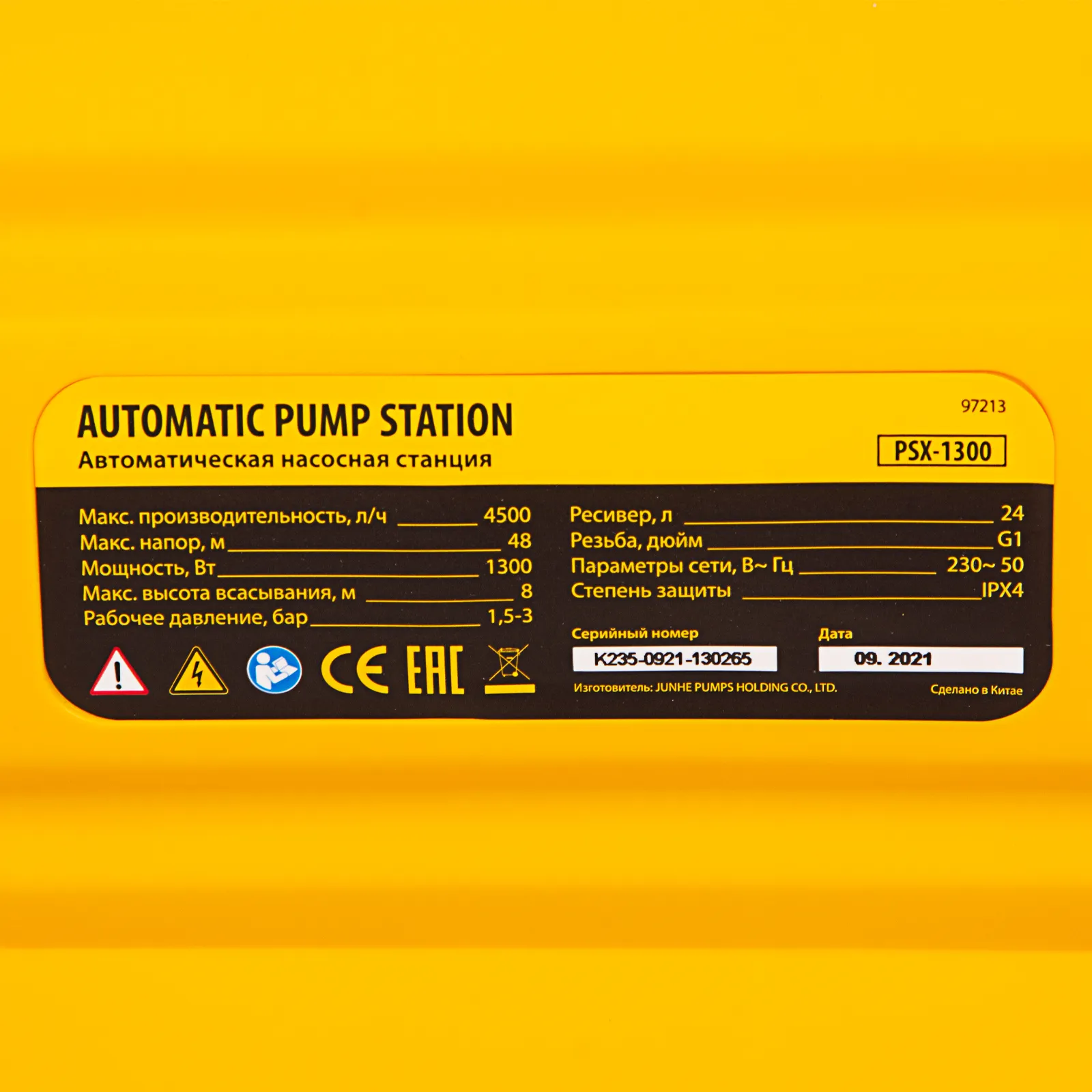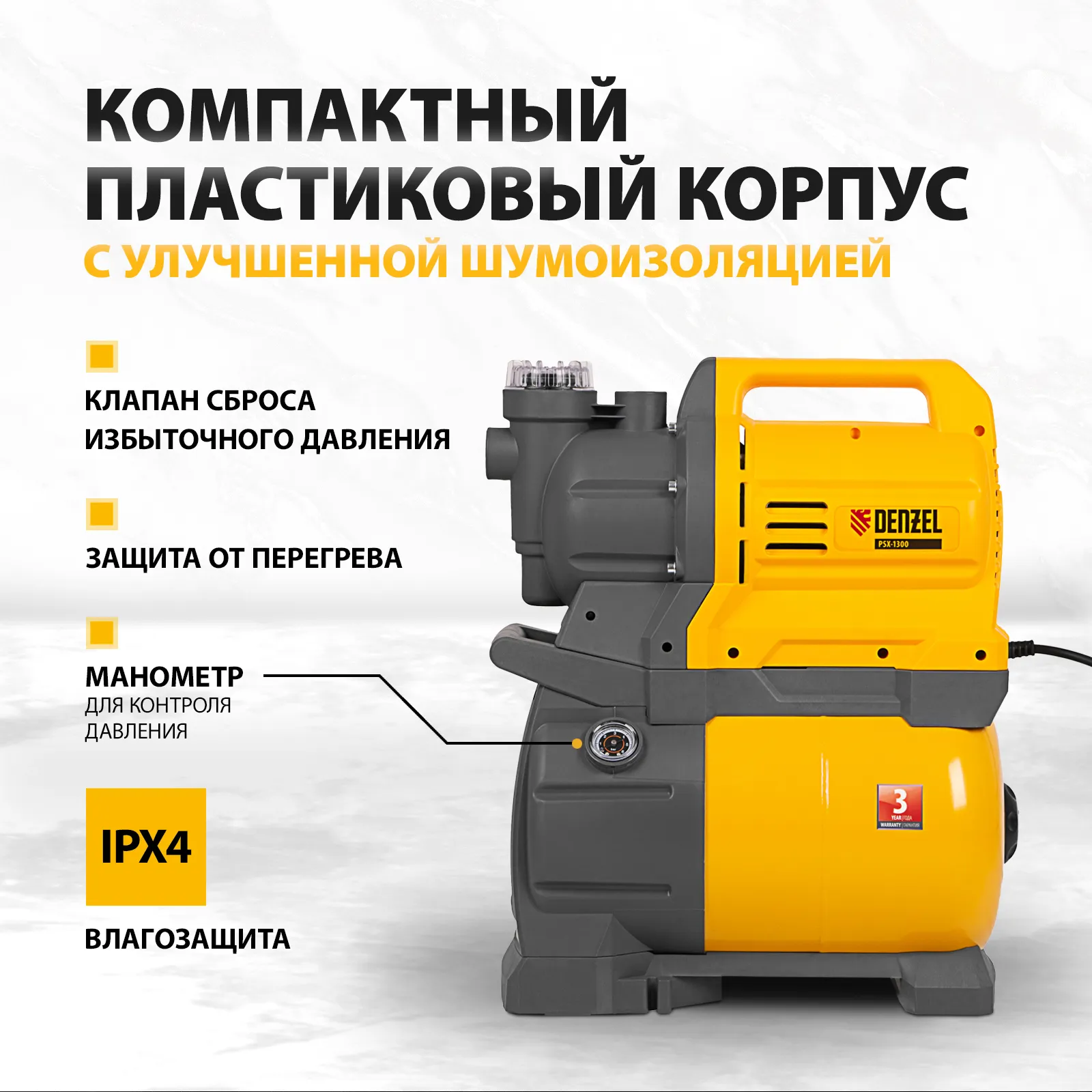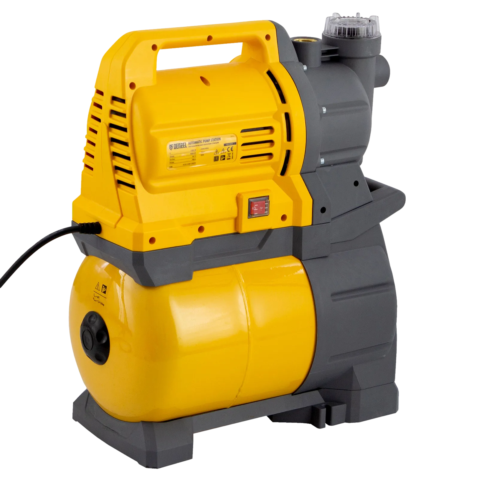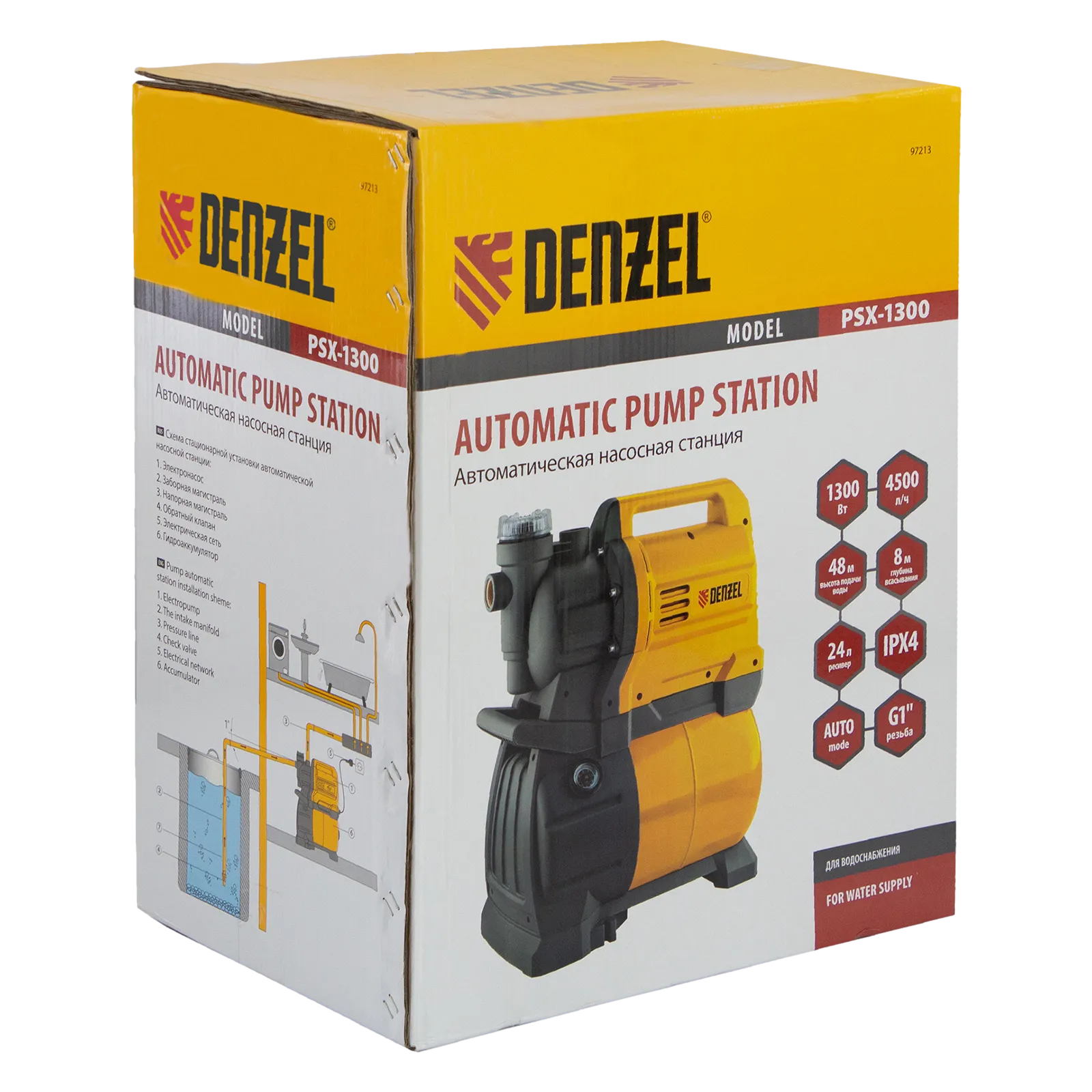 Насосная станция Denzel PSХ1300 97213 мощностью 1300 Вт оснащена ресивером на 24 л, работает со скоростью 4500 л/ч и обеспечивает подъем воды на высоту до 48 м. Позволяет в короткие сроки решить вопрос с водоснабжением частных домов и коттеджей, рядом с которыми находятся скважины, колодцы или водоемы естественного происхождения.;Станция обеспечивает бесперебойную работу в автоматическом режиме, останавливая и запуская электродвигатель в зависимости от расхода воды. Гидроаккумулятор объемом 24 литра позволяет экономно расходовать энергию и обеспечивает пользователей запасом воды в случае отключения электричества.